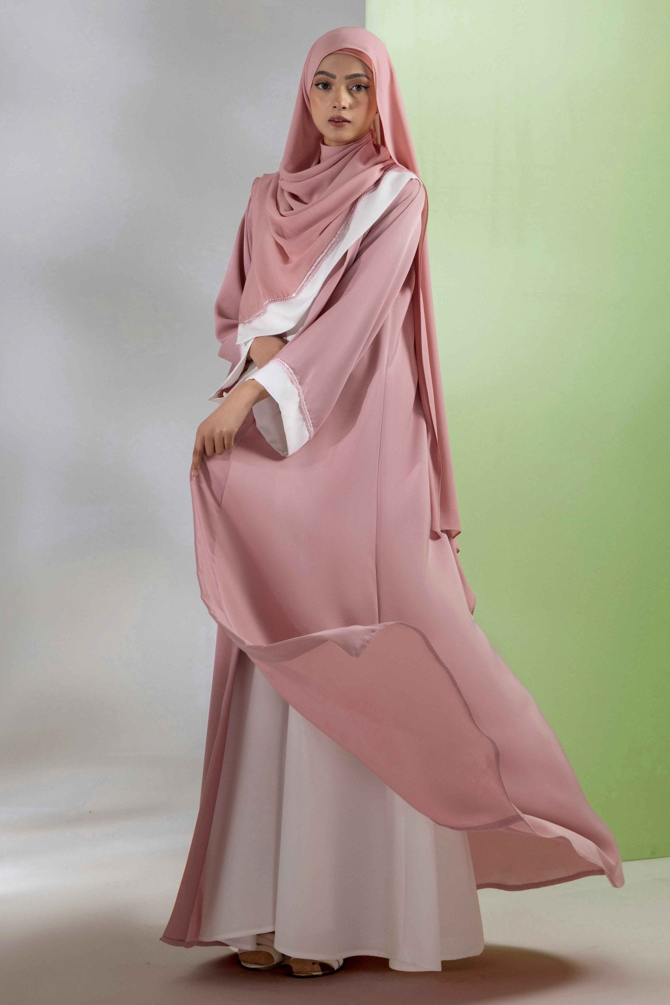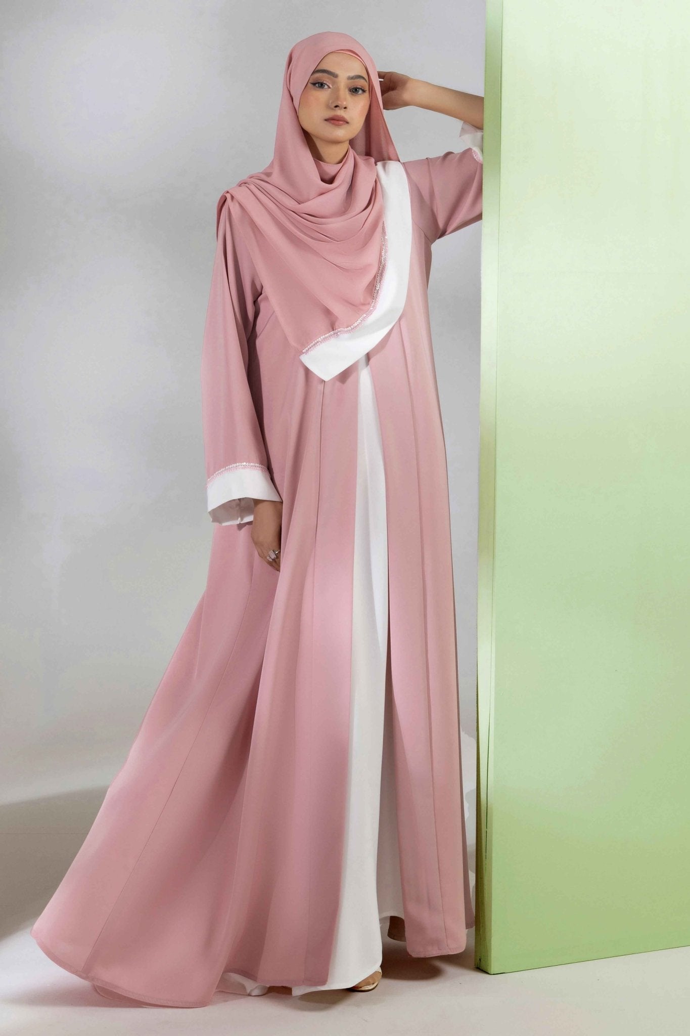 Crafted in premium Korean Nida, this blush pink Kimono abaya offers a graceful full-length front-open design with snap button closure. The loose-cut sleeves are beautifully hand-embellished with pearls, sequins, and crystal beads.