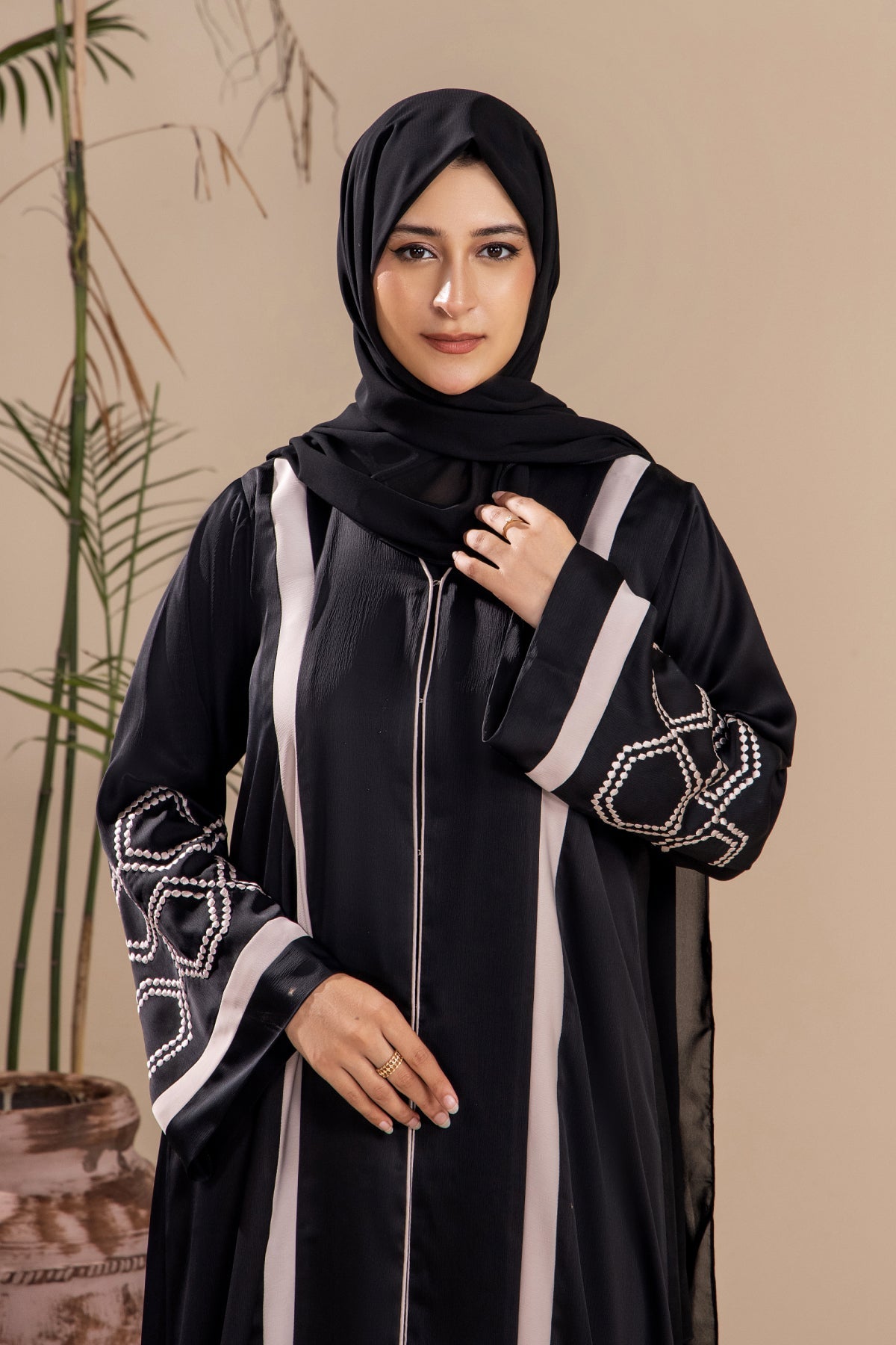 This black hexagon abaya features a traditional silhouette with beige piping along the V-neckline and front opening. The wide hexagon-patterned embroidery on sleeves and matching piping edges create a polished, elegant, and modest look.