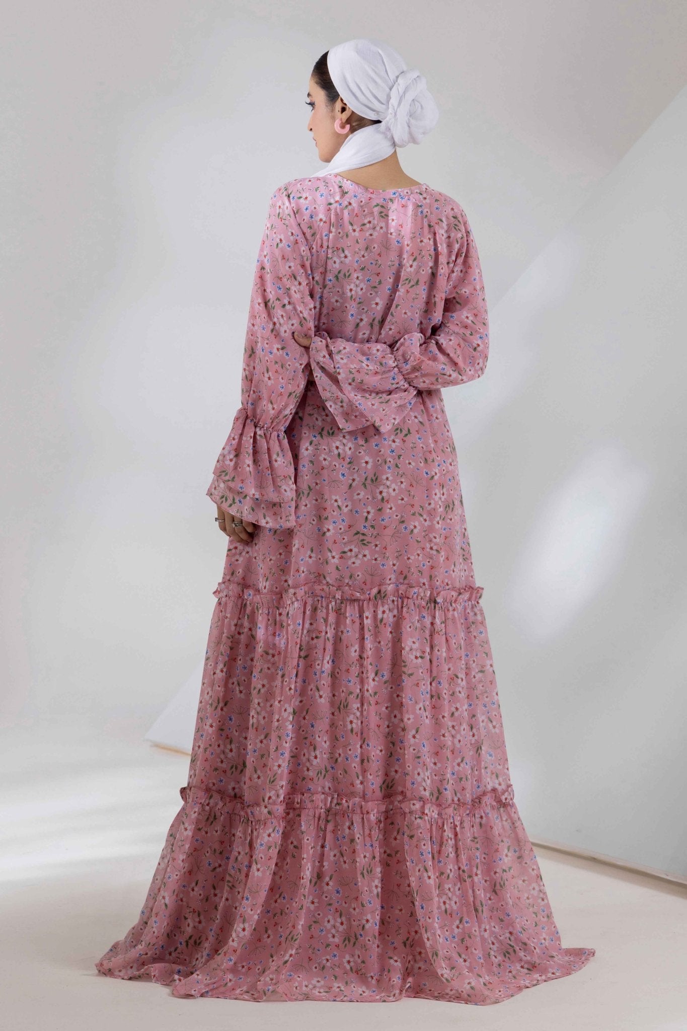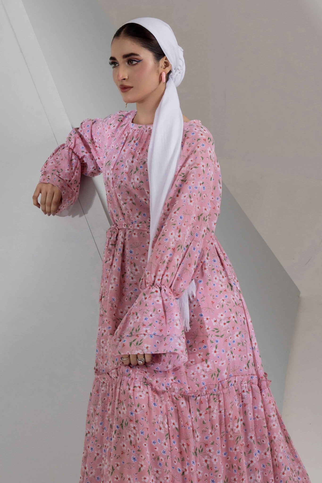 The Eden Maxi is crafted from pure chiffon in a soft pink base with elegant digital prints. Featuring a tiered flared silhouette, gathered bodice, and delicate sleeve detailing, perfect for casual days or semi-formal occasions.