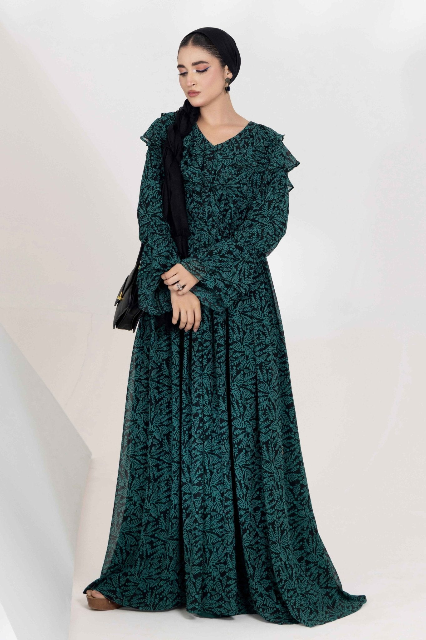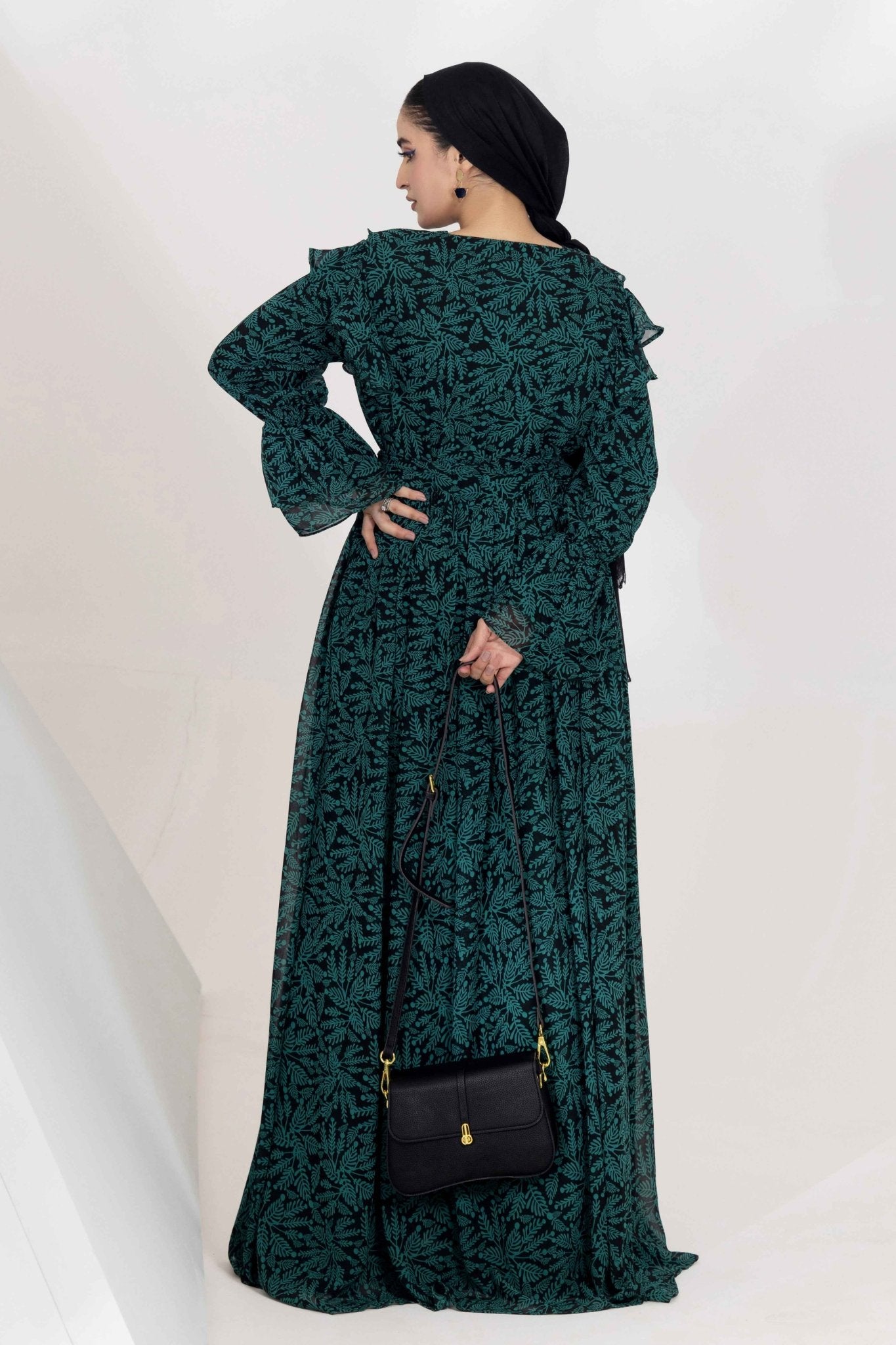 The Fern Maxi is a graceful chiffon outfit in a deep black digital print, designed with a flared silhouette. It features a chic V neckline with a fabric button placket, delicate ruffled detailing at the center front.