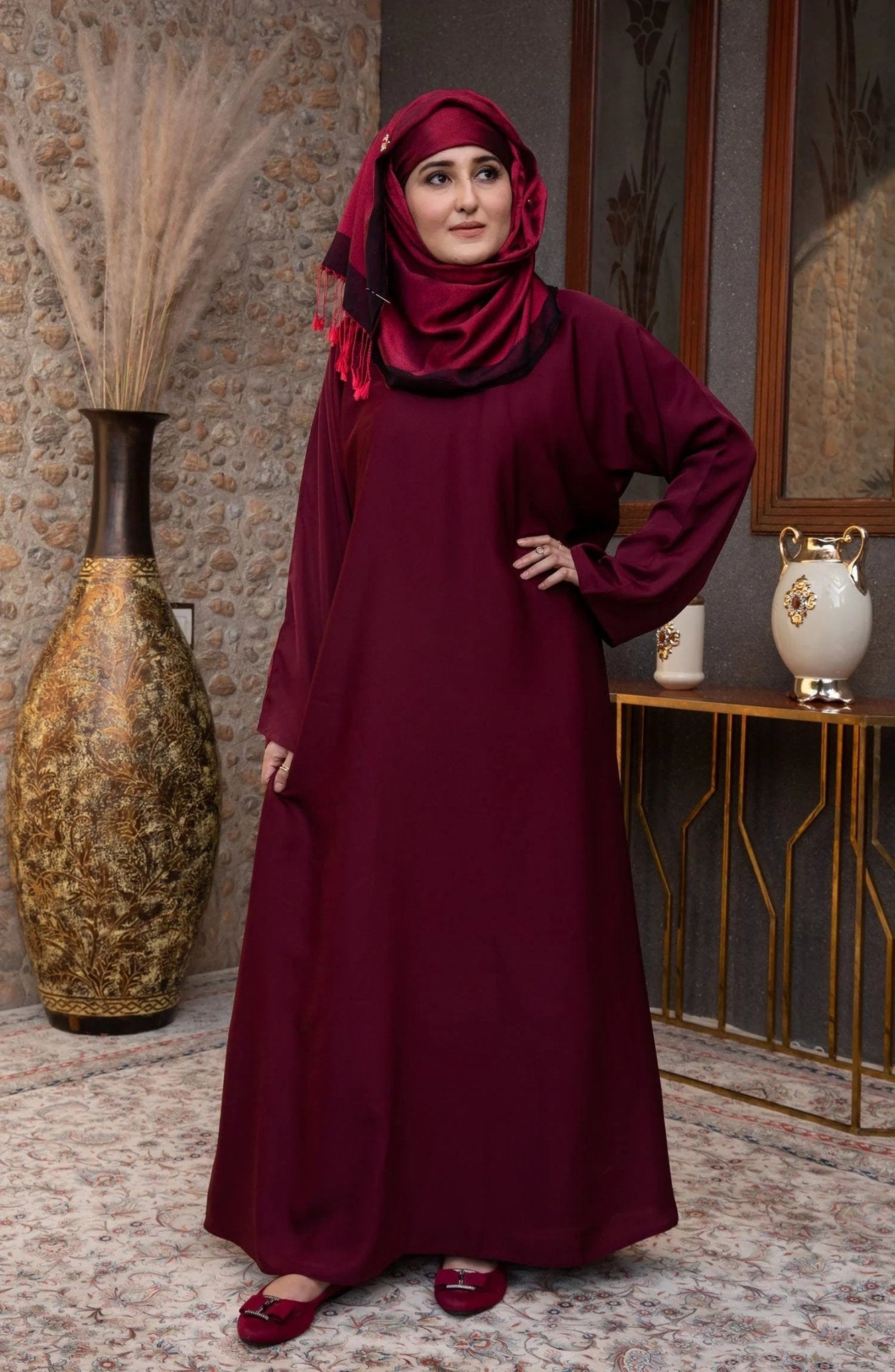 الجوهر والأناقة: اكتشفي هذه العباءة المميزة باللون العنابي البسيط، فهي تُعتبر الآن ما يُسمى بالرقي في أبسط صوره. يمكنكِ ارتداء أي زيّ تقليدي، لكن عباءتها الداكنة تلفت الأنظار - قطعة يمكنكِ ارتداؤها في المناسبات غير الرسمية دون تردد!
