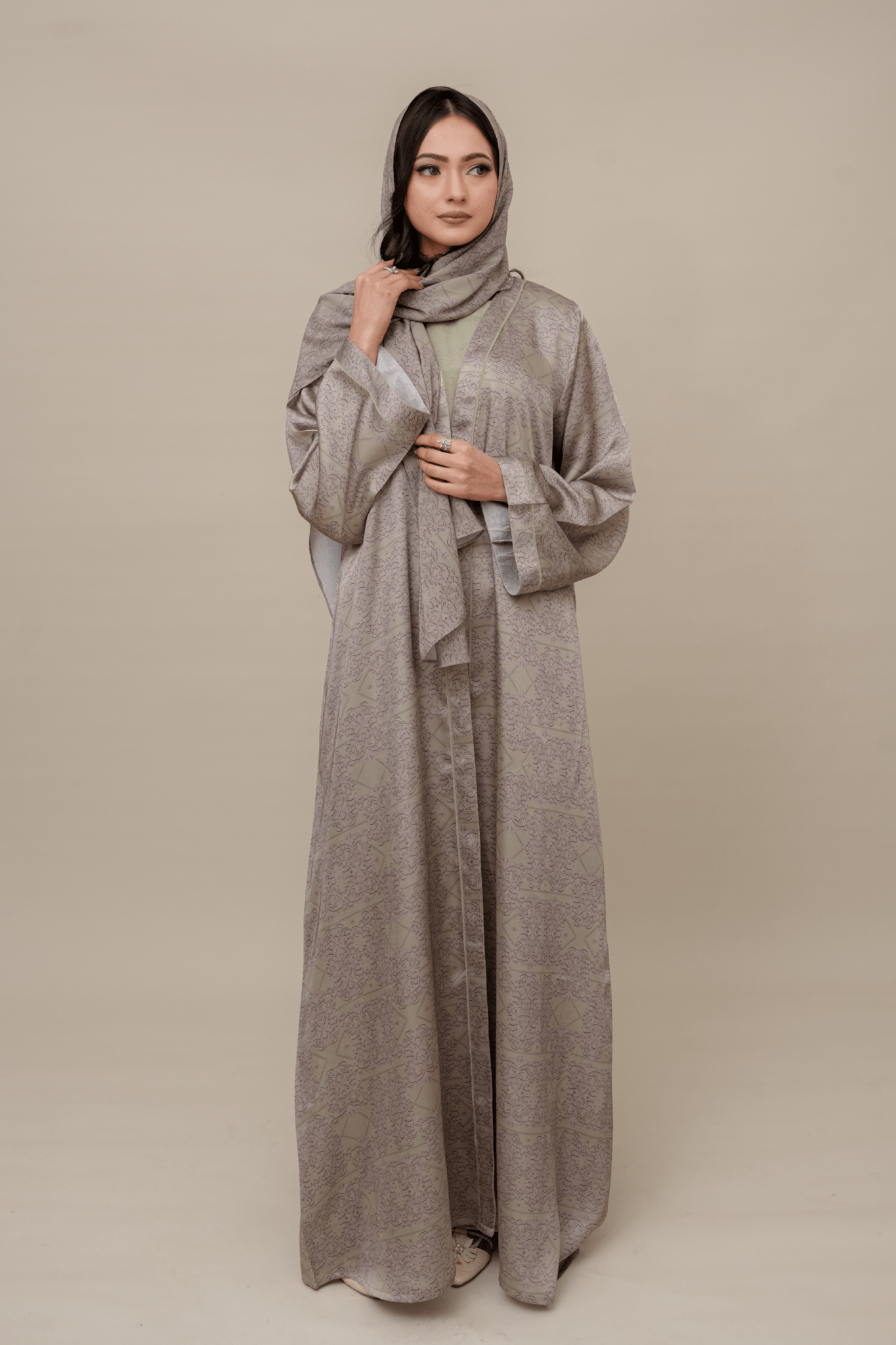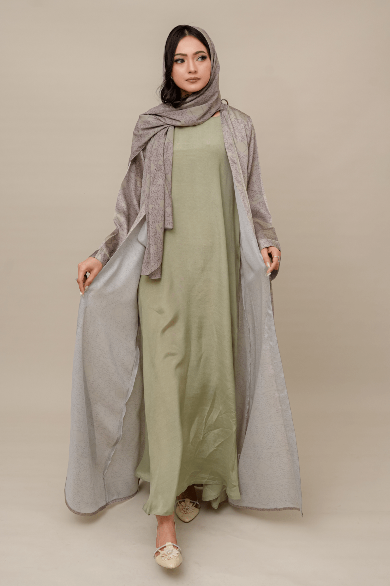انطلقي في أناقةٍ سلسة مع طقم ميرا كيمونو، طقمٌ رائعٌ صُمم خصيصًا للأزياء العصرية المحتشمة. صُمم هذا الطقم بلونٍ فستقيٍّ هادئ مع نقوشٍ ورديةٍ رقيقة، ويضم كيمونو حريريًا فاخرًا، وفستانًا داخليًا ماكسي أنيقًا، وحجابًا شيفونًا مطبوعًا مطابقًا. مثاليٌّ للنزهات غير الرسمية والمناسبات الخاصة، حيث يمزج ميرا بين الأناقة والراحة، مما يجعله قطعةً أساسيةً في خزانة ملابسكِ.