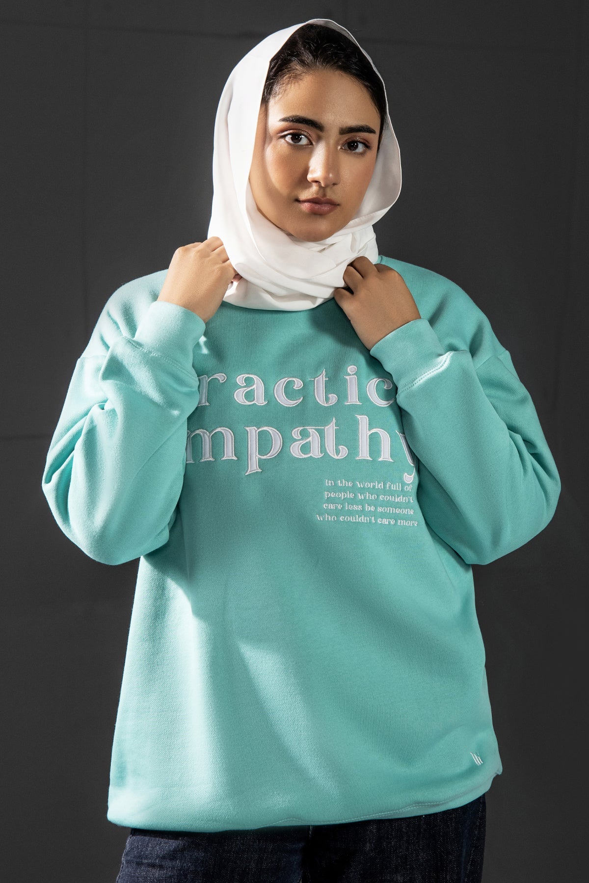 Elevate your streetwear with this teal green LSF fleece crew neck sweatshirt. Relaxed fit with drop-shoulder sleeves and ribbed neckline, cuffs, and hem. White embroidery “PRACTICE EMPATHY” adds a minimal, modern touch for effortless everyday comfort.