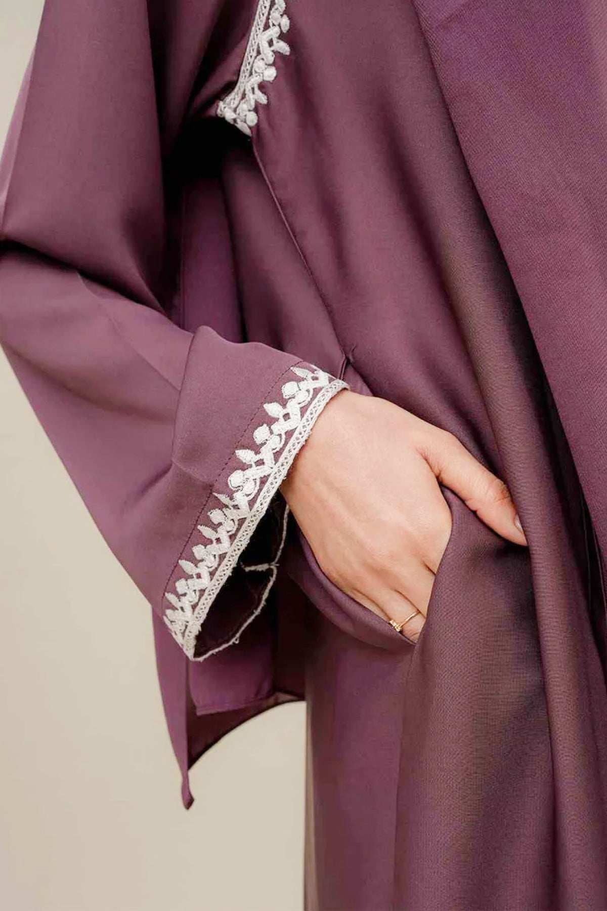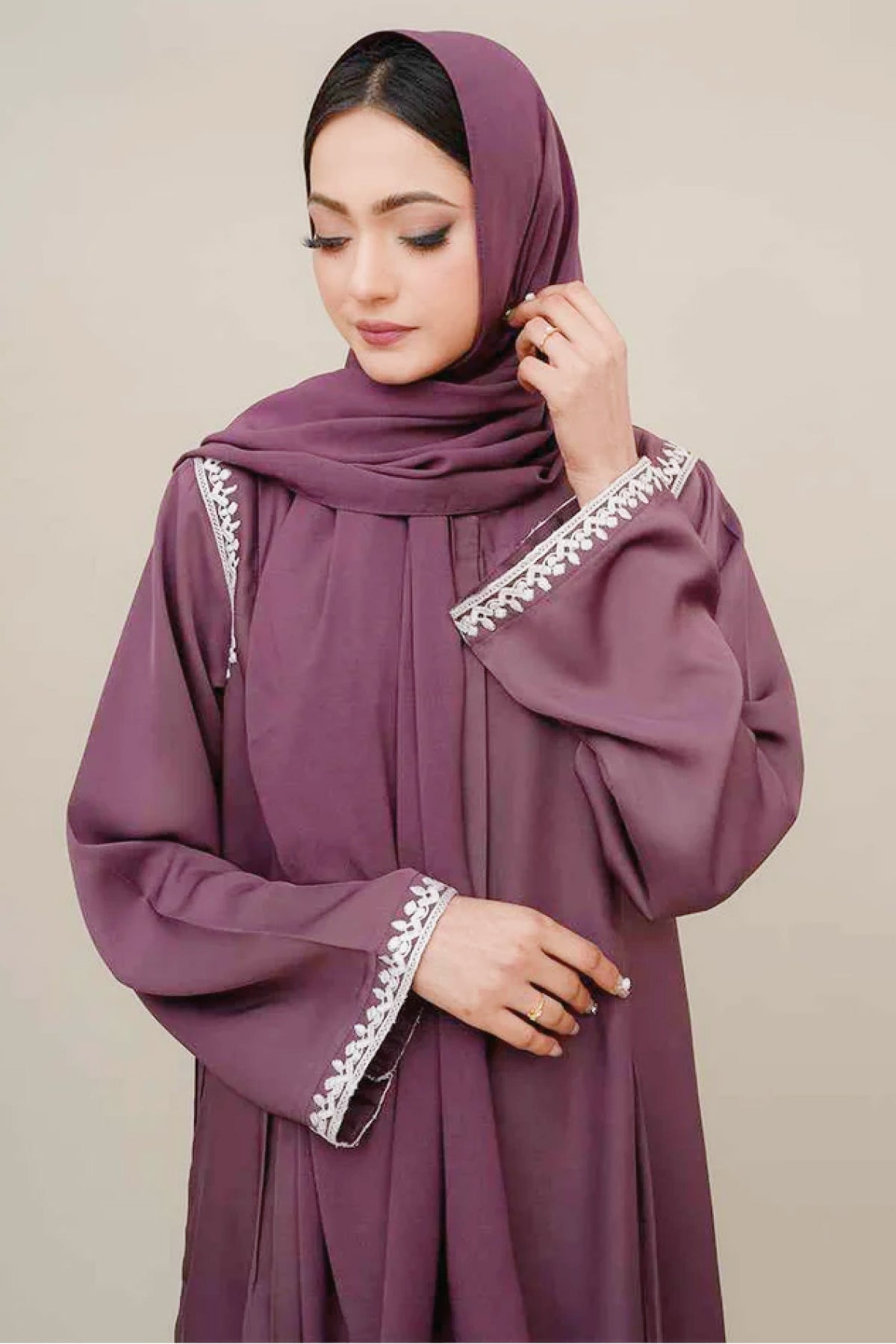 Elevate your modest wardrobe with the Elina Mauve Abaya Set. This full-length flared Nida gown features delicate embroidery, elegant knife pleats, and embroidered detailing on armholes.