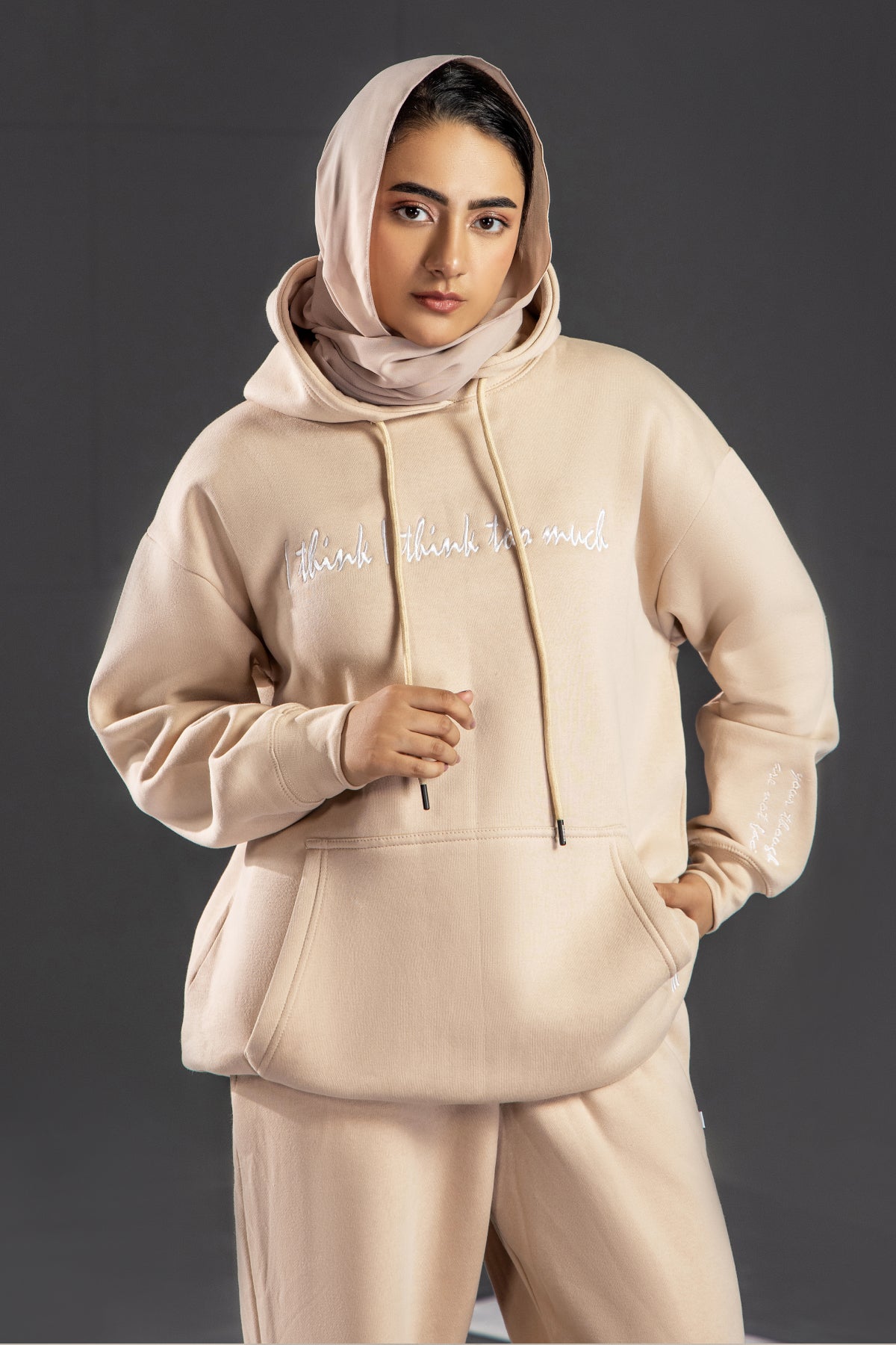 Cosy up in this warm beige LSF fleece hoodie, designed for comfort and mindful streetwear. Relaxed fit with a kangaroo pocket, dark embroidered quotes “I think I think too much” on the chest and “your thoughts are not facts” on the sleeve.
