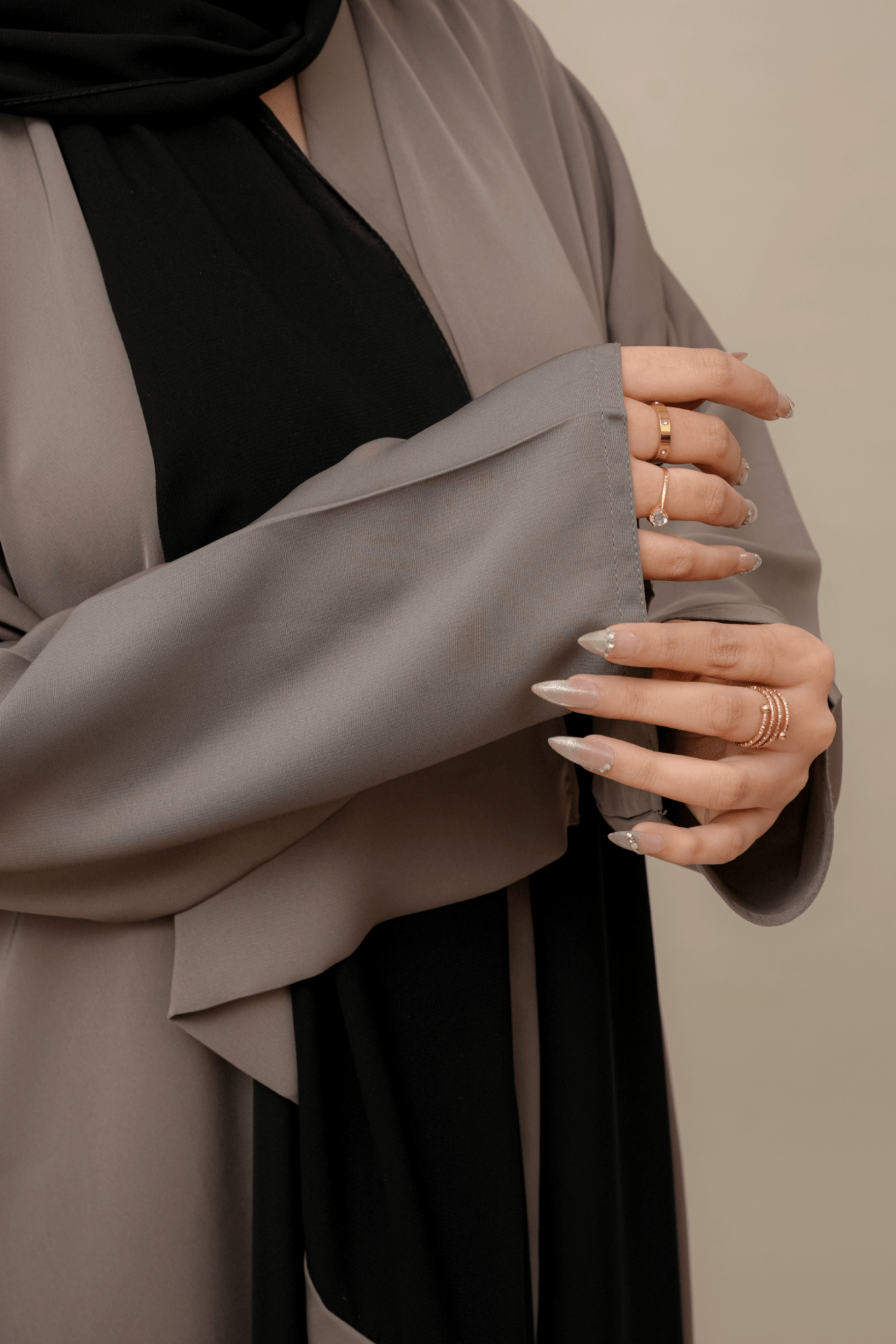 Version moderne d'une mode pudique intemporelle, l'ensemble Abaya Amaya est conçu pour celles qui apprécient l'élégance sans effort. Confectionné en tissu nida haut de gamme, cet élégant ensemble abaya bicolore allie harmonieusement noir et gris pour un contraste sophistiqué. Sa coupe longue, associée à une fermeture à boutons-pression sur le devant, offre polyvalence et élégance, ce qui en fait un incontournable de toute garde-robe. Accompagné d'un hijab noir assorti à bordures grises, Amaya allie à la perfection classique et contemporain.