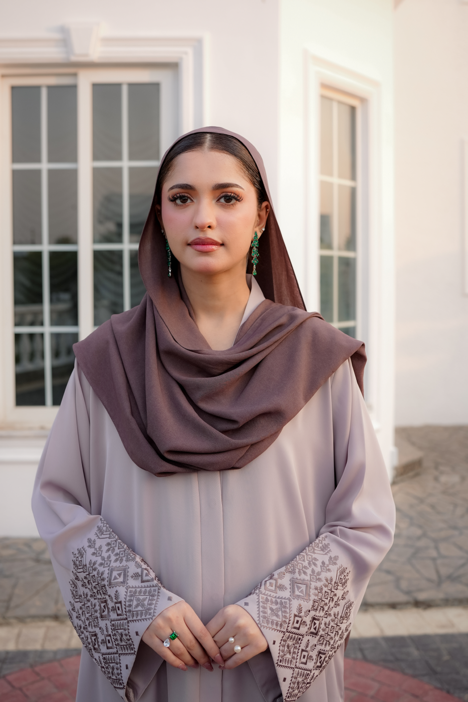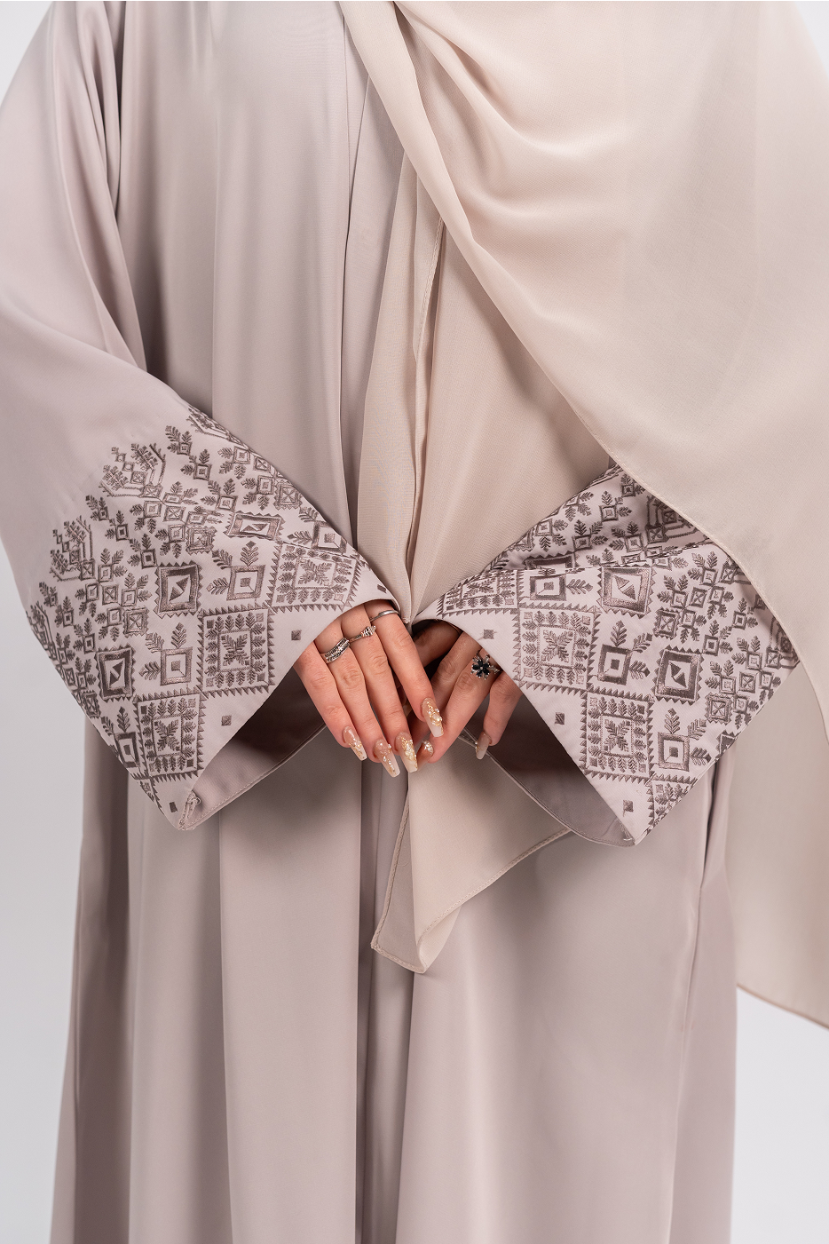 This elegantly crafted Anatolia Stone Mosaic Front Open Abaya is designed in premium Nida fabric, offering a graceful drape with breathable comfort. The soft beige base shade is elevated with dense linear geometric embroidery, inspired by Anatolian stone mosaics, featuring interlocking diamond and square motifs that form a rich, statement border.
