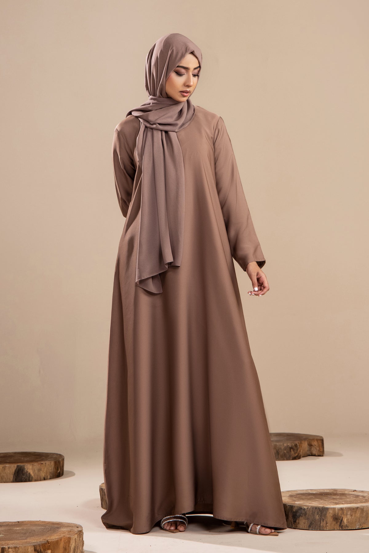 Elegantly crafted in soft beige premium Nida Fabric, this front-close abaya features a graceful umbrella flare and relaxed sleeves — perfect for modest, everyday sophistication and travel comfort.