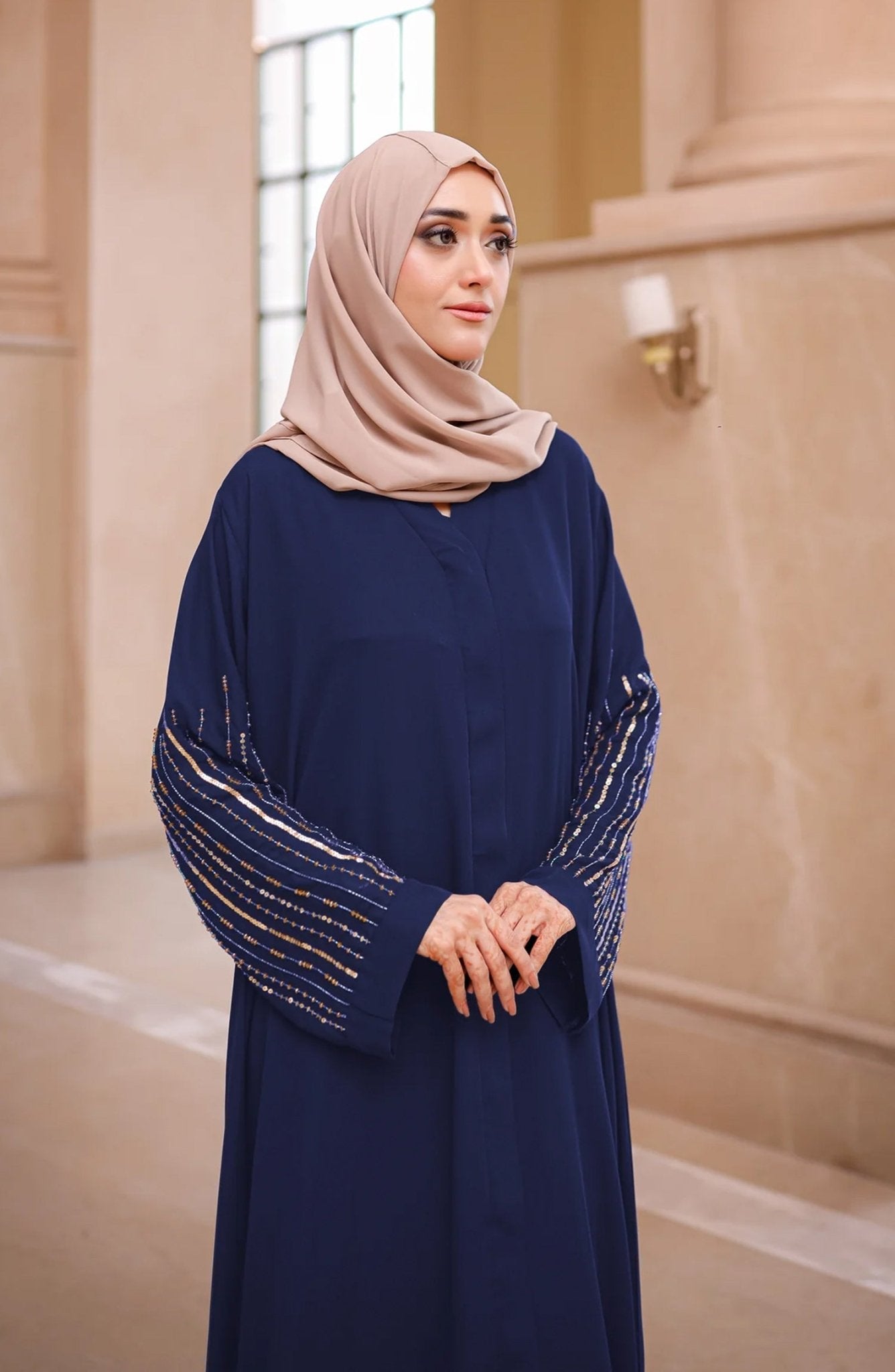 Abaya de couleur jade profond avec des embellissements faits à la main sur les manches, ce qui en fait un choix chic pour toutes vos réunions formelles