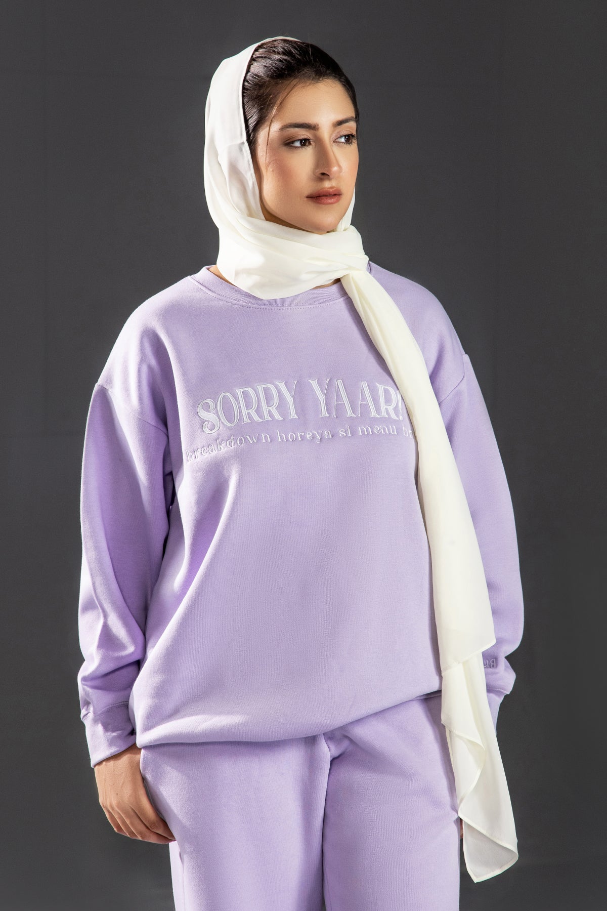 Stay cozy and stylish in this lavender LSF fleece crew neck sweatshirt. Relaxed fit with drop-shoulder sleeves, ribbed neckline, cuffs, and hem. Bold white embroidery “SORRY YAAR!” adds a playful, minimal streetwear touch for everyday comfort.