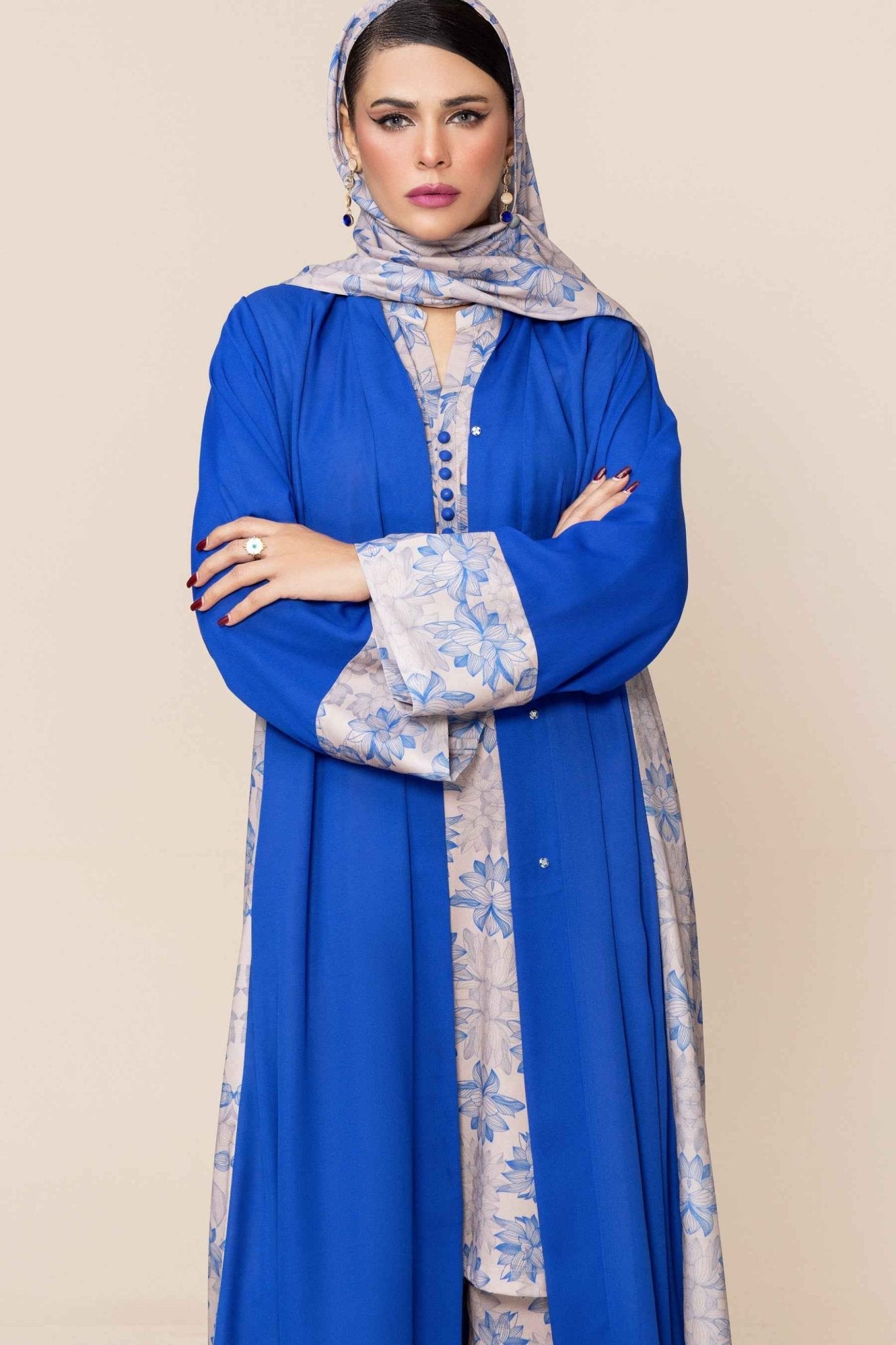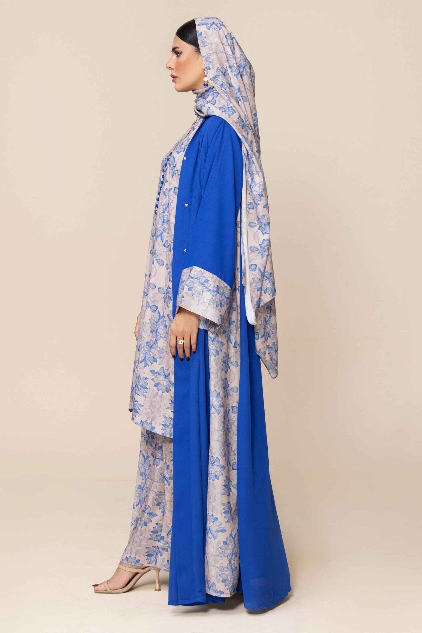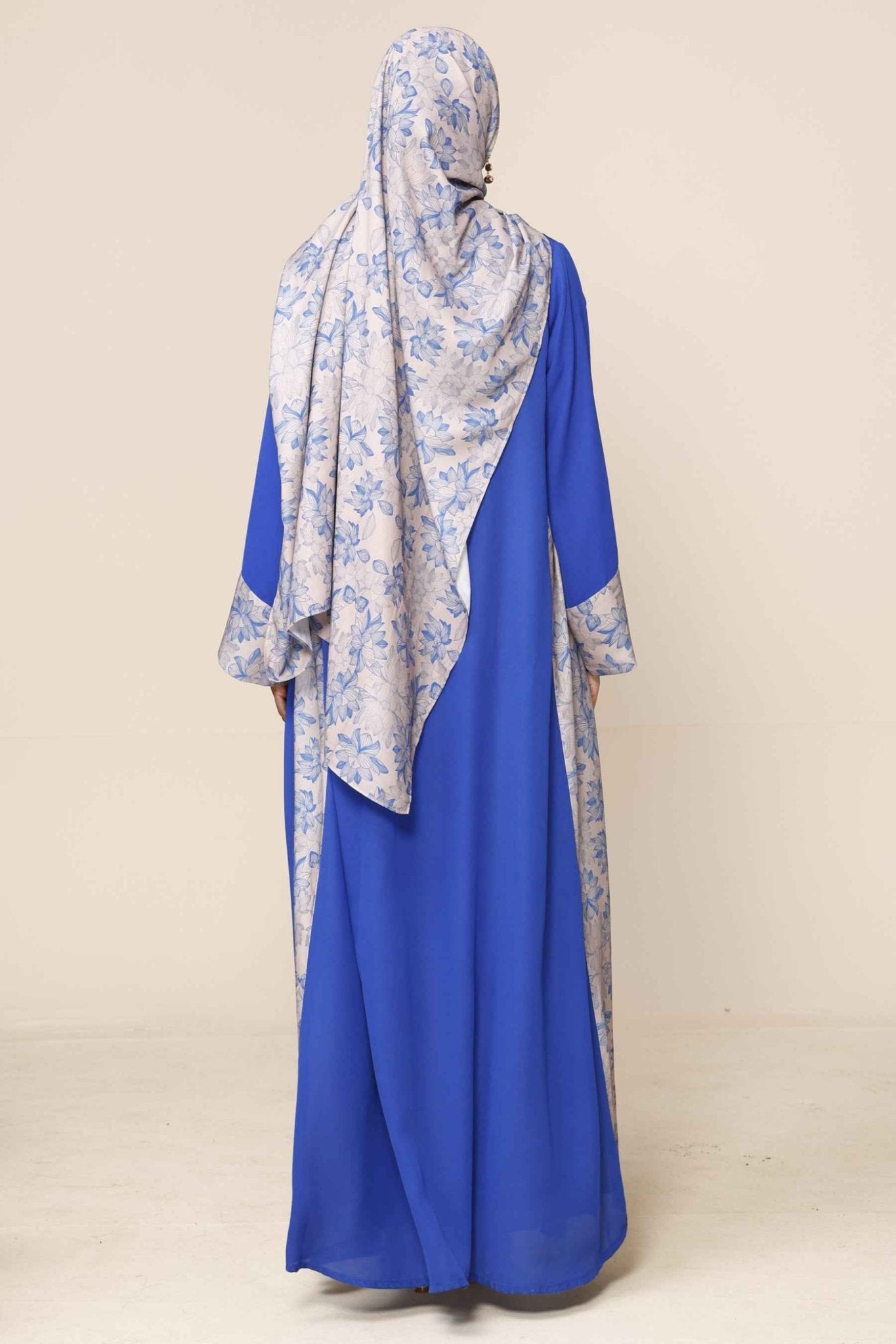 The Navy Contrast kimono is styled in soft crepe fabric with a full-length, front-open silhouette in a rich blue shade. Printed stripe detailing along the side seams and wide printed sleeve borders add a modern, elevated touch to this modest classic.