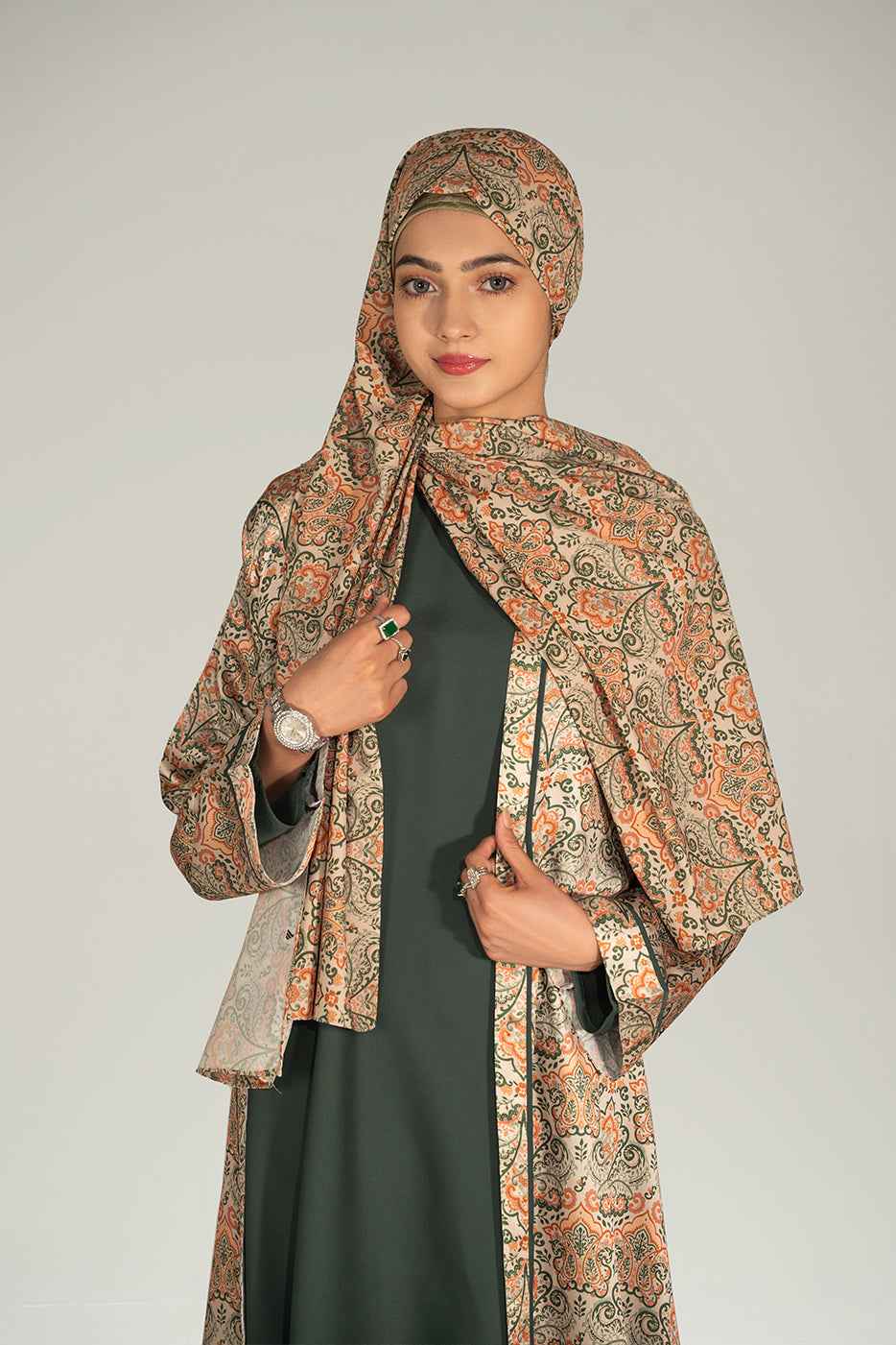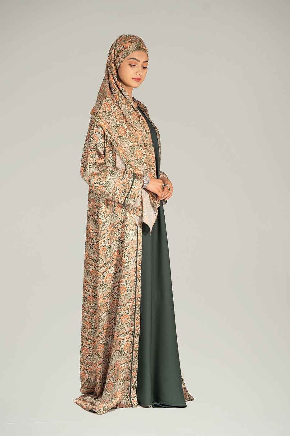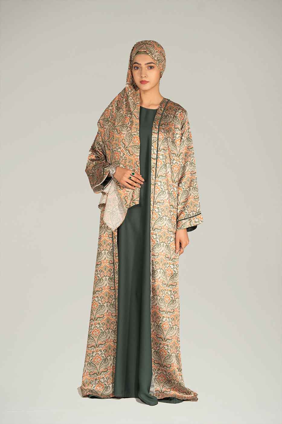 Inspiré par la nature, l' ensemble abaya Botanica revisite la mode pudique. Composé d'un kimono long en soie imprimée couleur crème aux finitions contrastées , il est conçu pour se démarquer tout en restant raffiné. L' abaya Nida vert basilic, sans manches, offre une couverture complète et une tenue légère, idéale pour les événements formels et les rassemblements élégants.