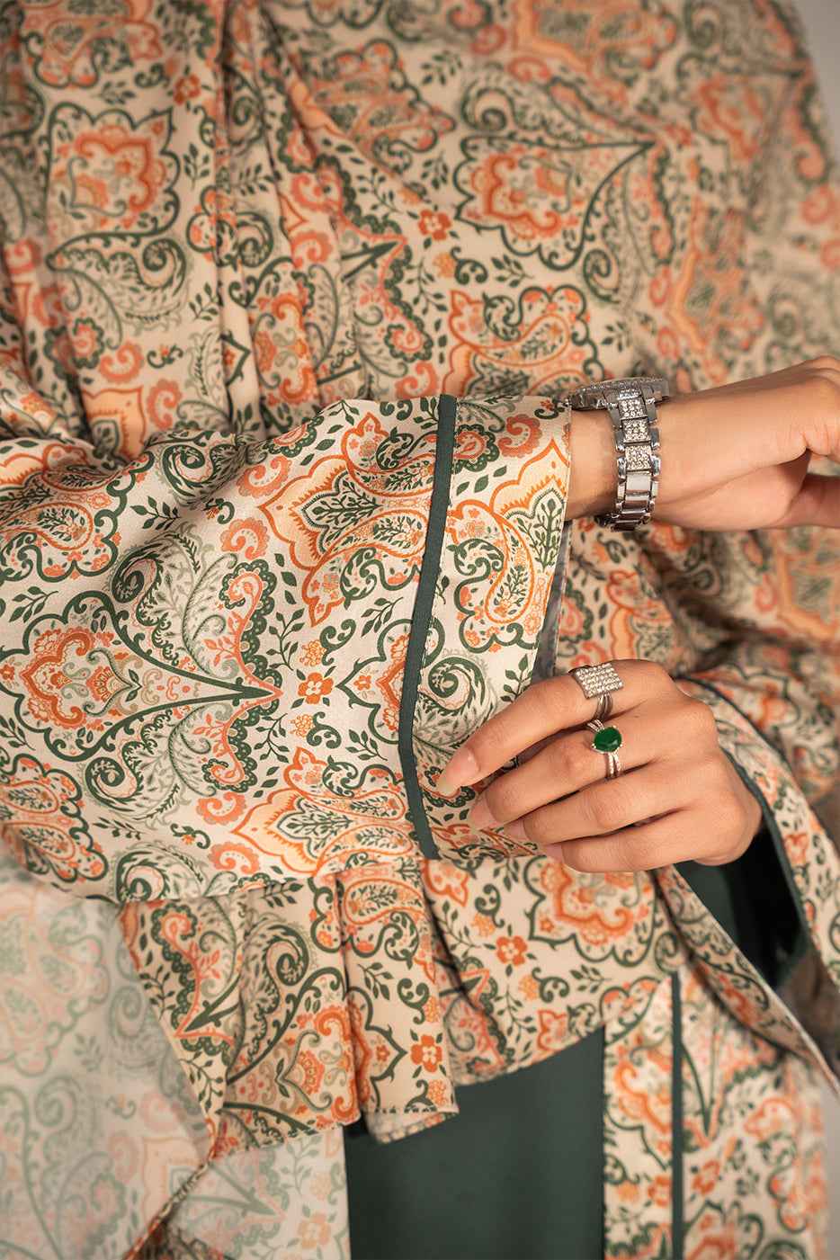 Botanica – Ensemble kimono abaya imprimé crème avec détails contrastés | Modest Wear Pakistan