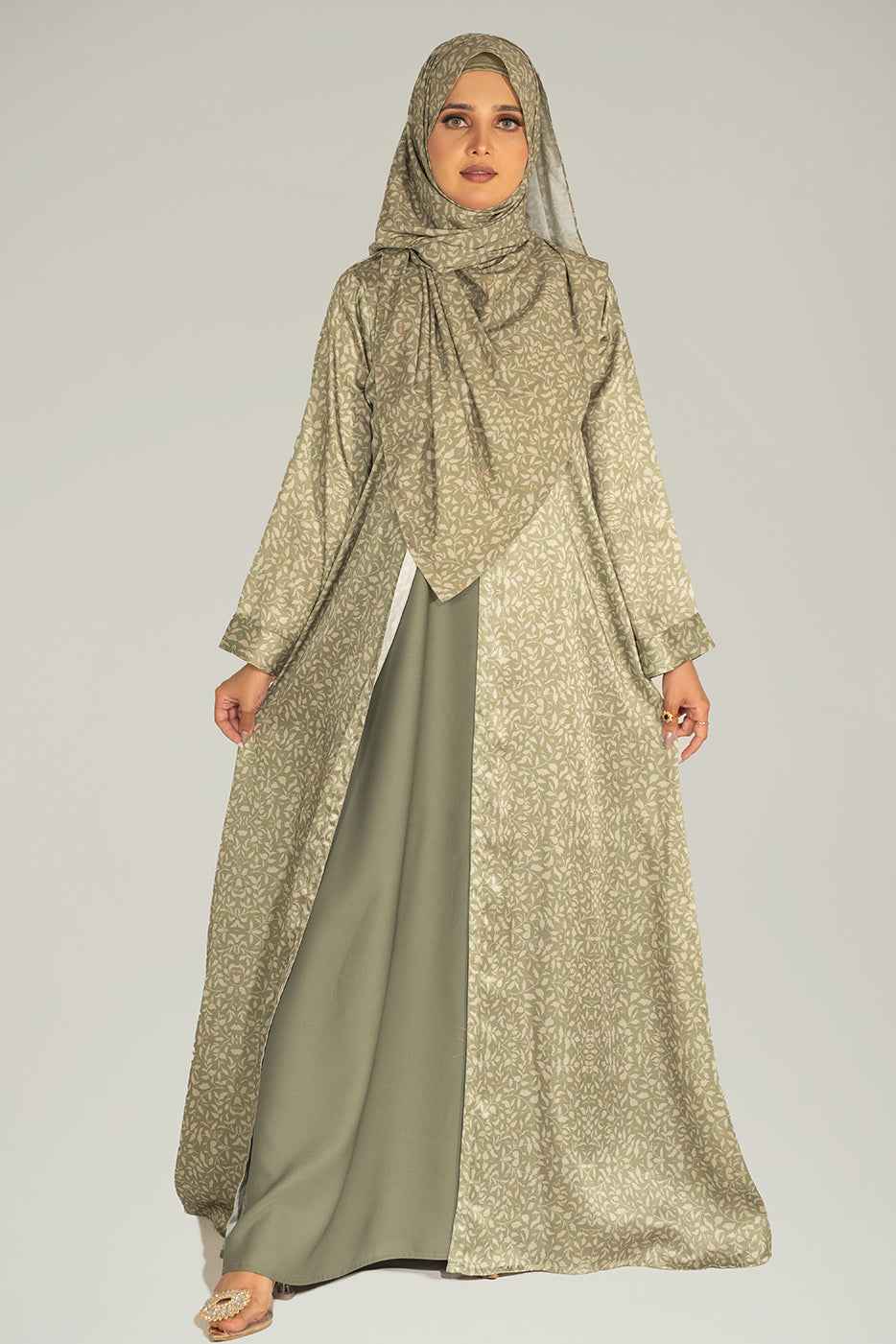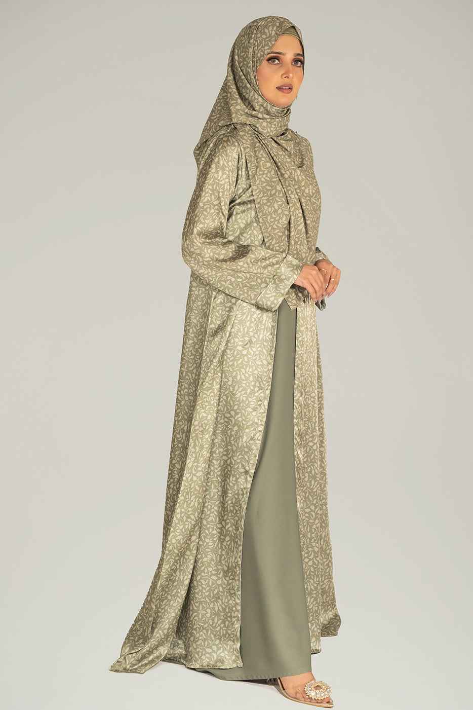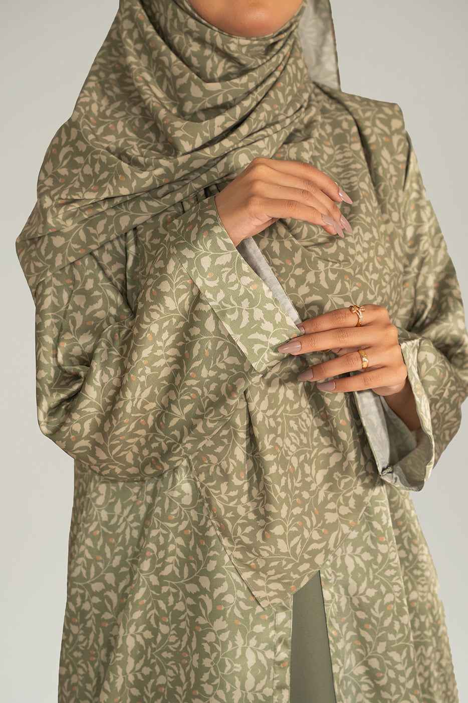 Sublimez votre garde-robe modeste avec l' Olive Zephyr , un élégant ensemble abaya 3 pièces alliant imprimé, texture et style intemporel. Le kimono extérieur est en soie imprimée fluide aux riches tons olive, avec des manches à rabat superposé , alliant élégance et simplicité. En dessous, une abaya sans manches en tissu Nida assorti apporte confort et légèreté, idéale au quotidien comme pour les grandes occasions.