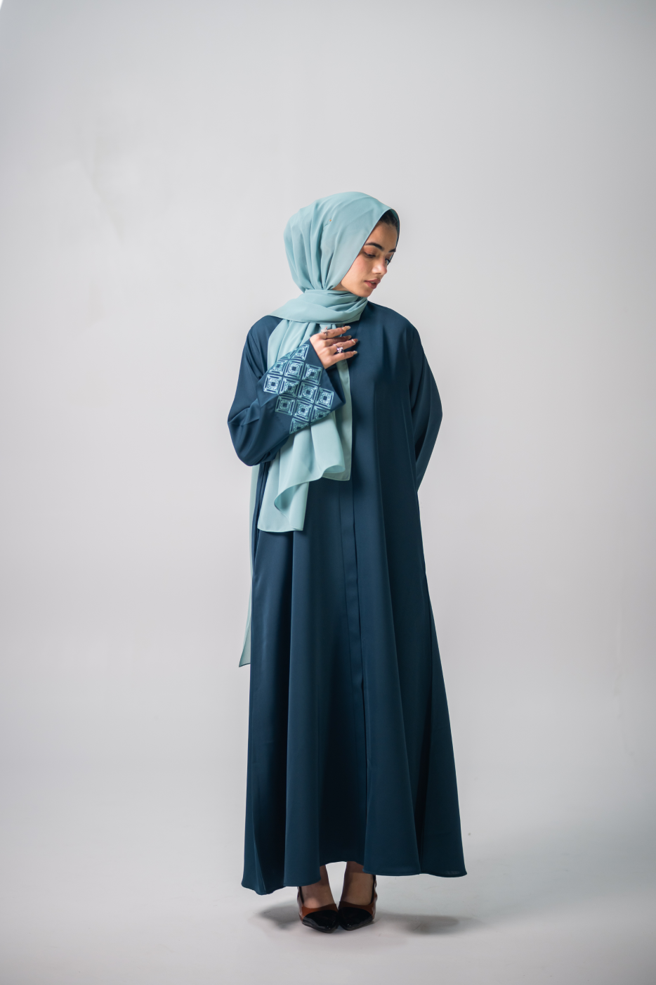 Inspired by classical Ottoman geometry, the Ottoman Emerald Geometric Abaya features rich detailing on a deep teal green base shade. Made from high-quality Nida fabric, this front open abaya delivers a luxurious drape while remaining lightweight and comfortable.