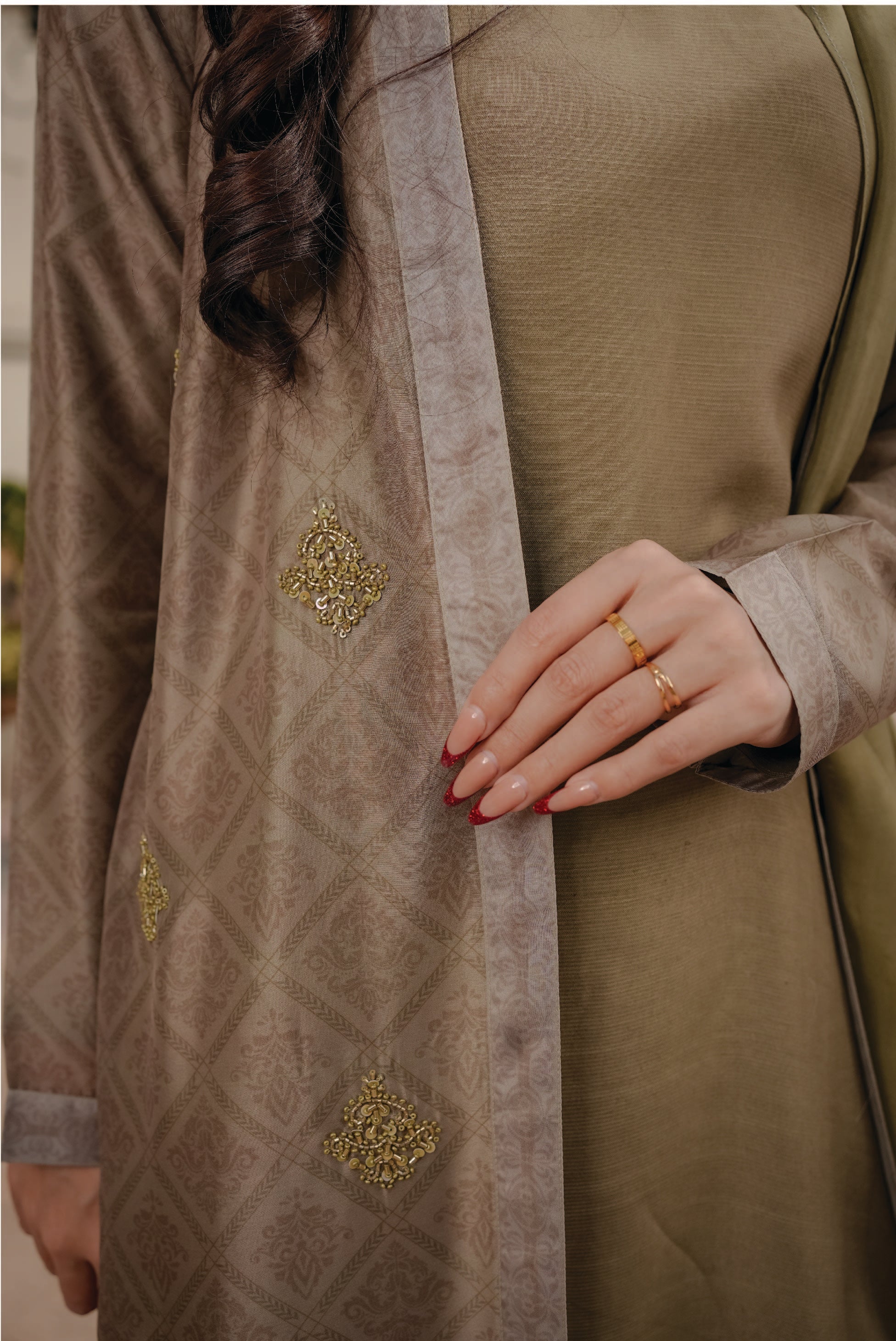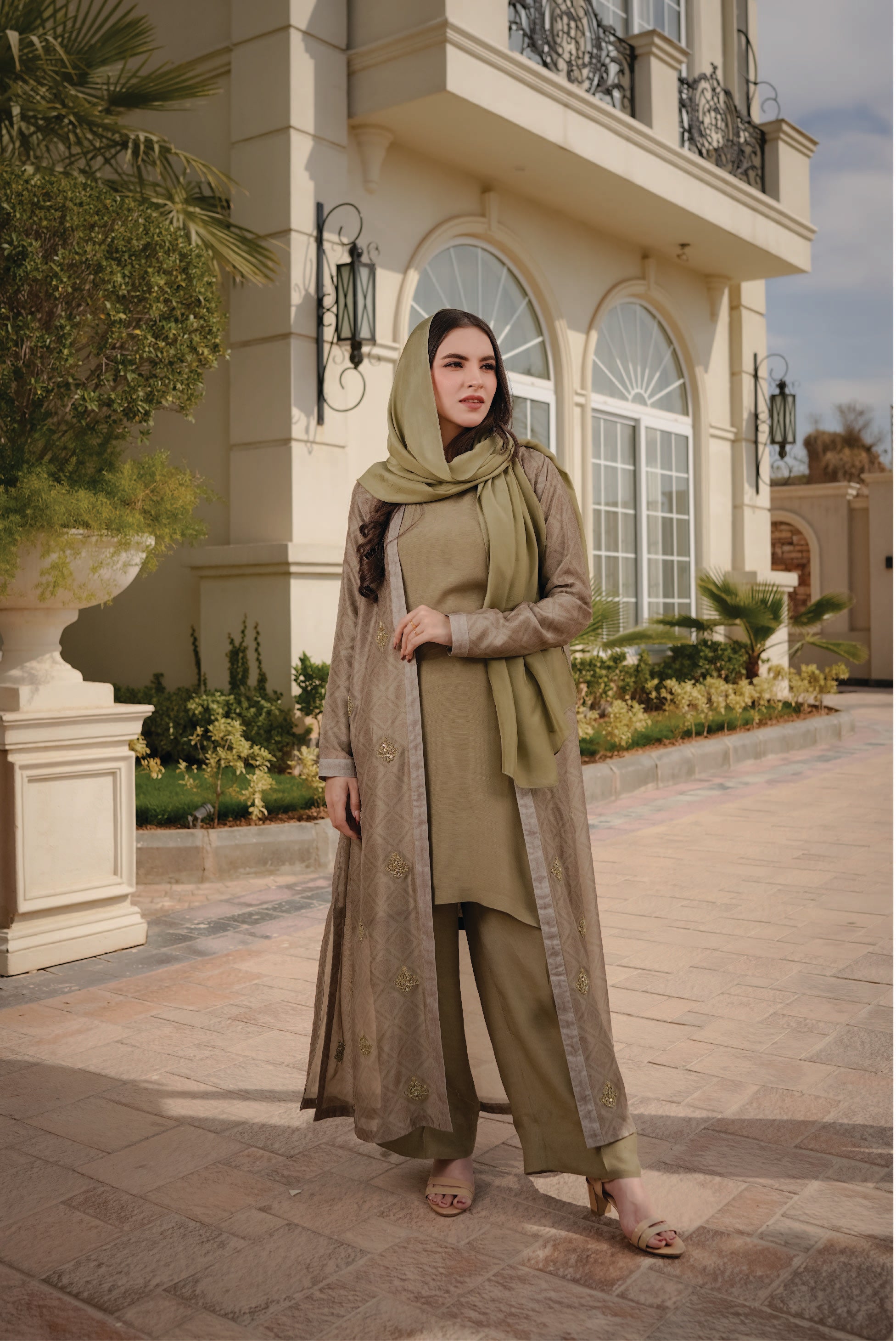 This full-length printed kimono is crafted in luxurious dull silk, featuring an elegantly embellished front for a sophisticated look. Paired with a premium Korean raw silk shirt and trouser set, the ensemble creates a polished and coordinated three-piece outfit perfect for formal and festive occasions.