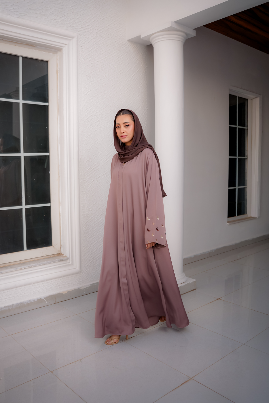 The design is elevated by scattered crescent-shaped embroidered motifs placed along the sleeve hems in contrasting tones, creating a minimal yet contemporary aesthetic. Perfect for daily wear, office styling, or understated evening looks, this abaya reflects refined modest fashion inspired by modern Pakistani trends.