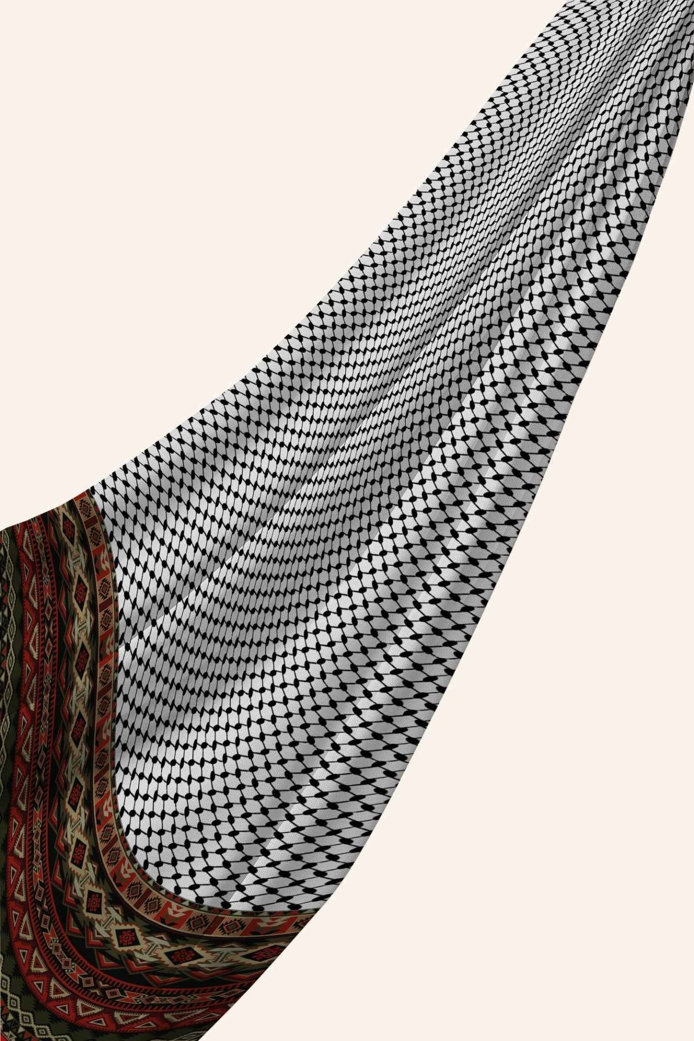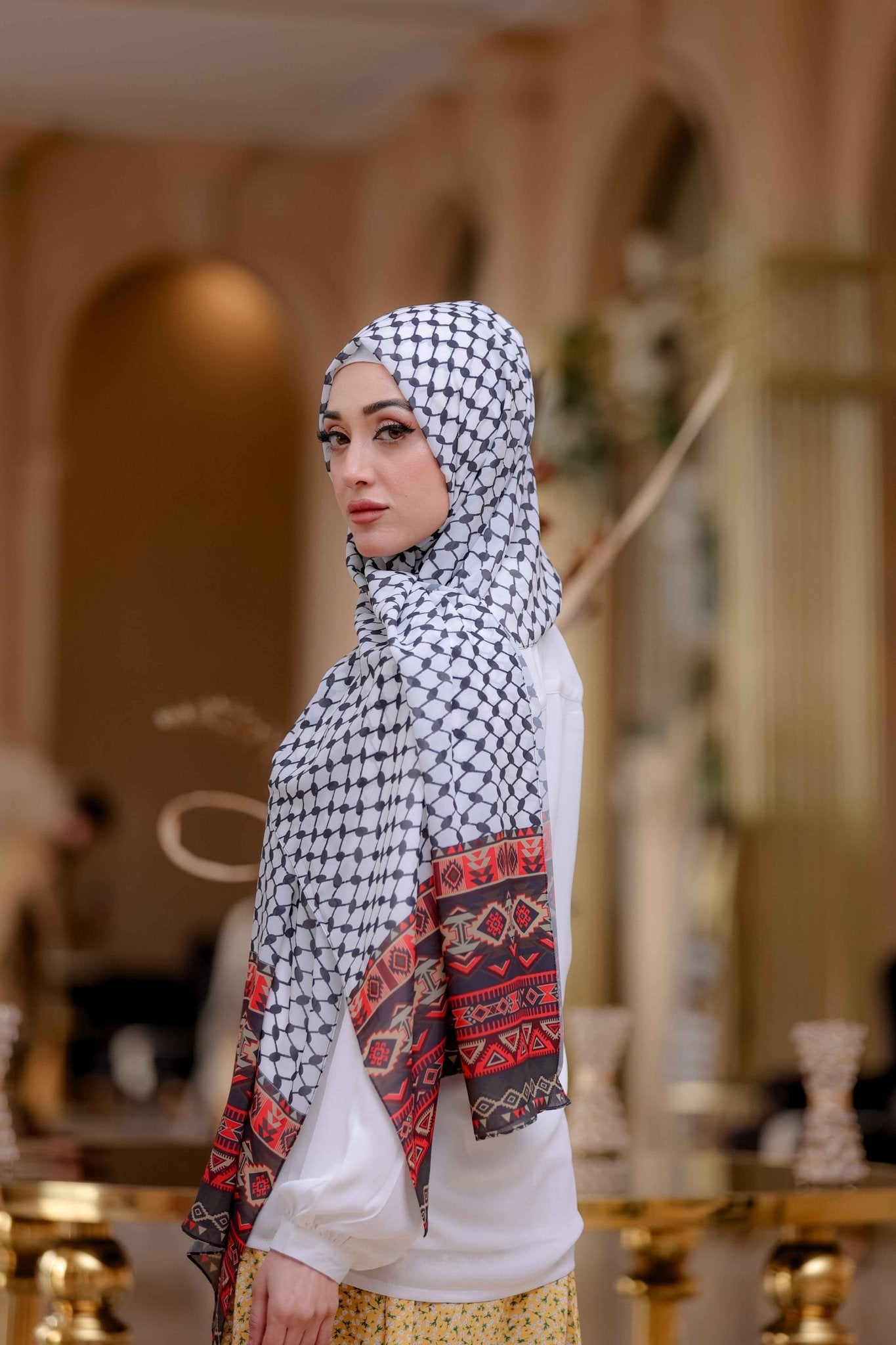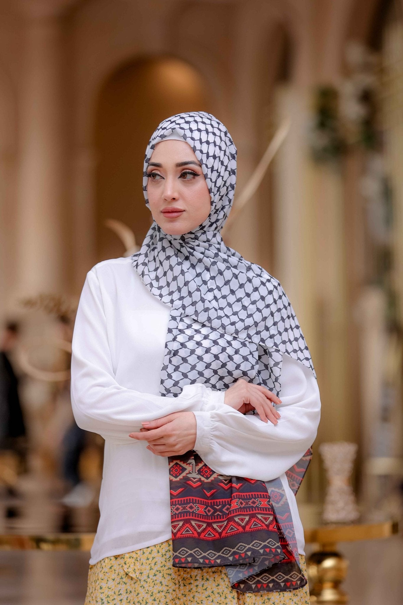 Honour tradition with this Traditional Palestinian Keffiyeh hijab, crafted from luxe chiffon and digitally printed in iconic black-and-white patterns with heritage-inspired borders. Lightweight, breathable, and elegant, it blends cultural pride with timeless modest fashion.