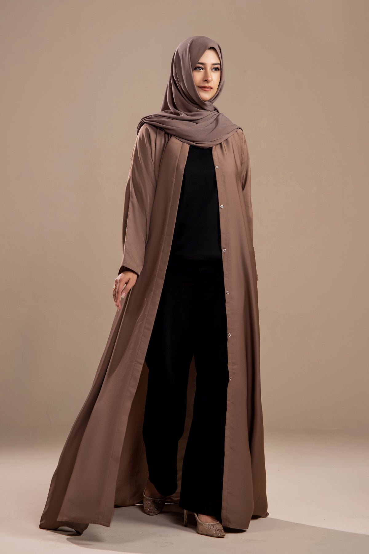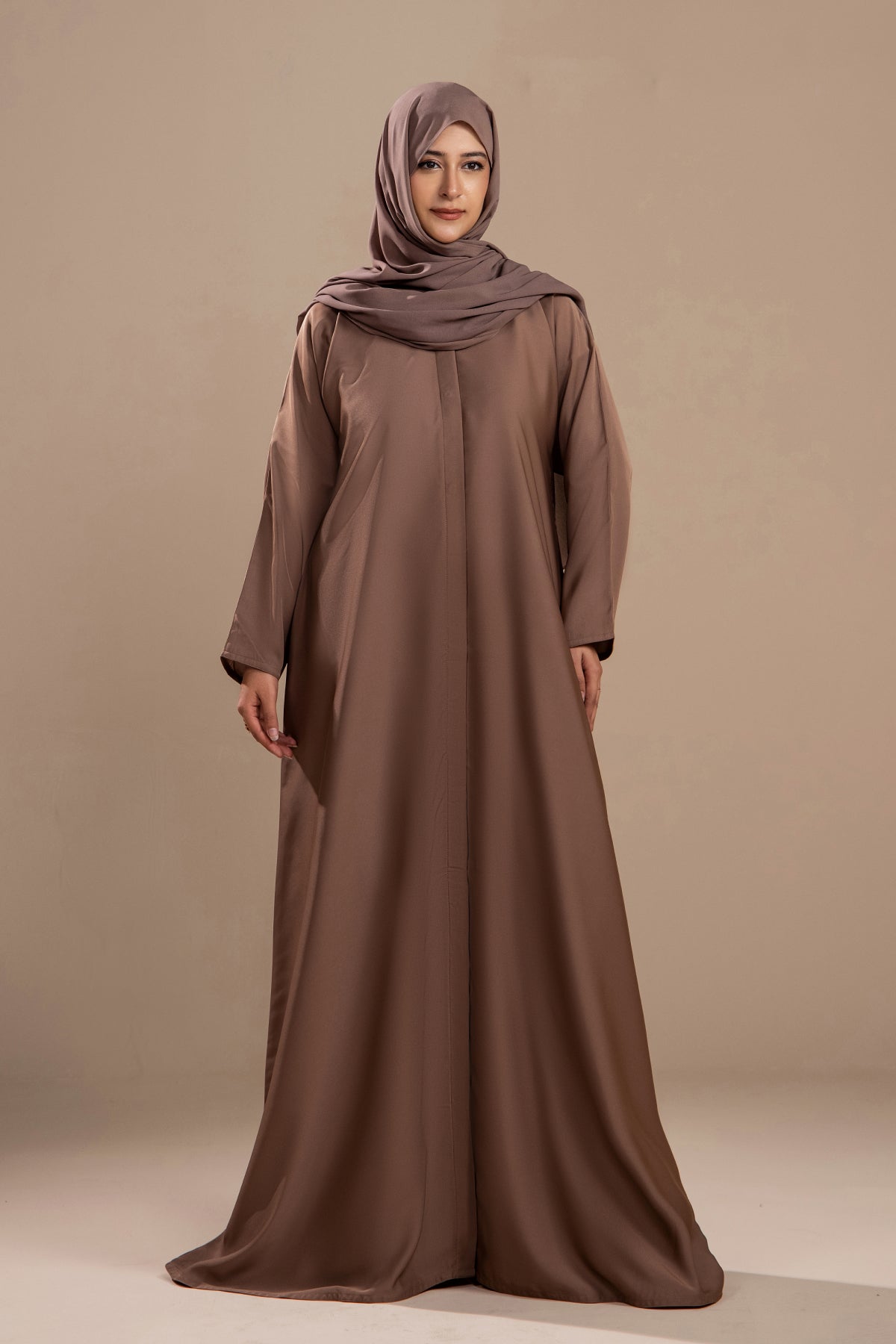 Elegantly tailored from premium Nida fabric, this beige front-open abaya offers a graceful and minimal silhouette. Its straight-cut design and smooth texture ensure all-day comfort, making it perfect for travel, prayer, or daily wear with effortless sophistication.
