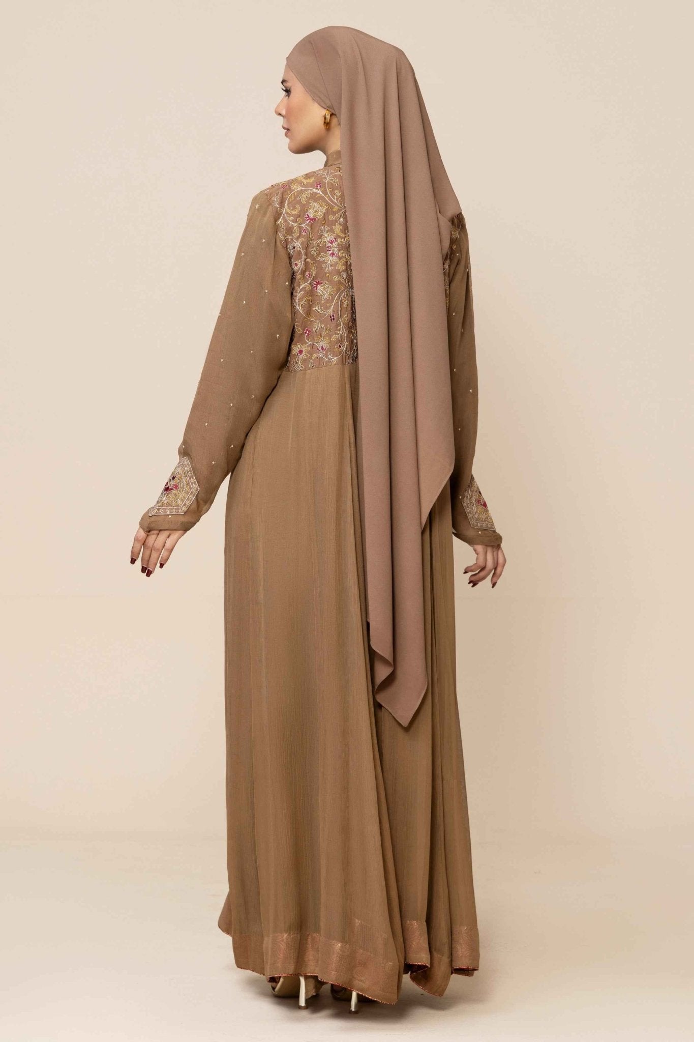 The Beige Taupe Luxe maxi is tailored from cashmere peach and chiffon with a pure silk lining for refined elegance. A paneled full-length silhouette features a tilla-thread embroidered bodice with sequins, fitted sleeves.