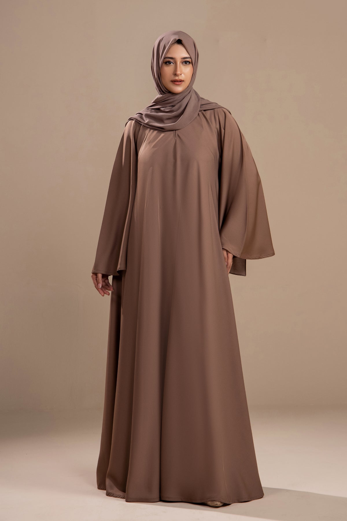 Crafted in soft beige premium Nida Fabric, this front-closed umbrella abaya features a graceful flare and relaxed sleeves for effortless modesty. Ideal for daily wear, travel, and prayer with a stylish, flowy silhouette.
