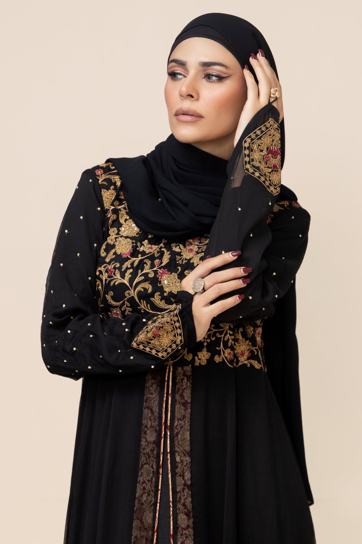 The Black Taupe Luxe maxi is crafted in cashmere peach and chiffon with a pure silk lining for luxury comfort. A paneled full-length cut features an embellished bodice with tilla thread and sequins, paired with fitted sleeves adorned with stonework and a chic finger loop detail.