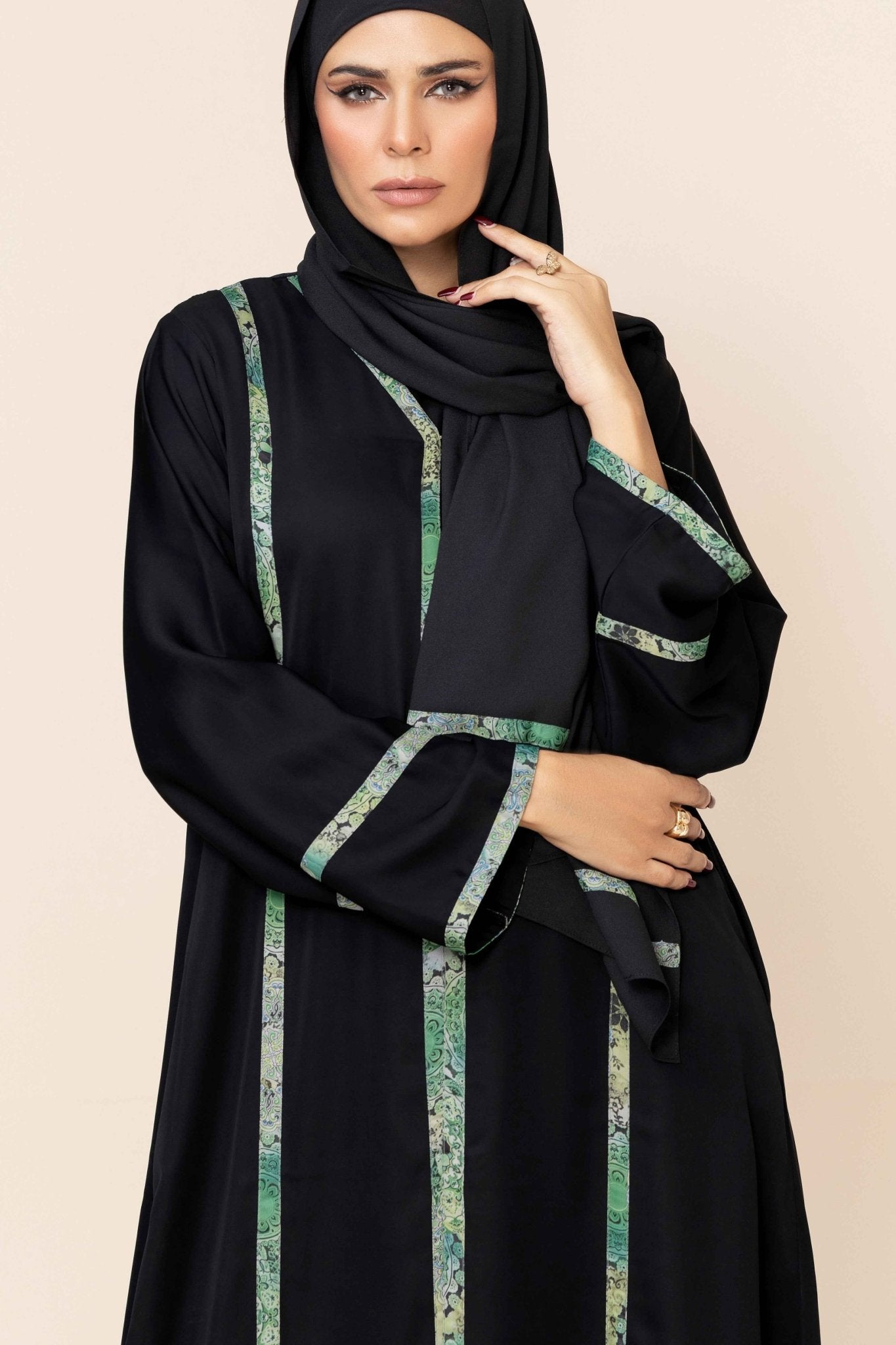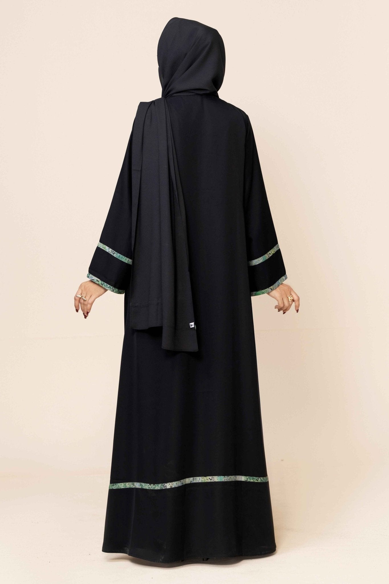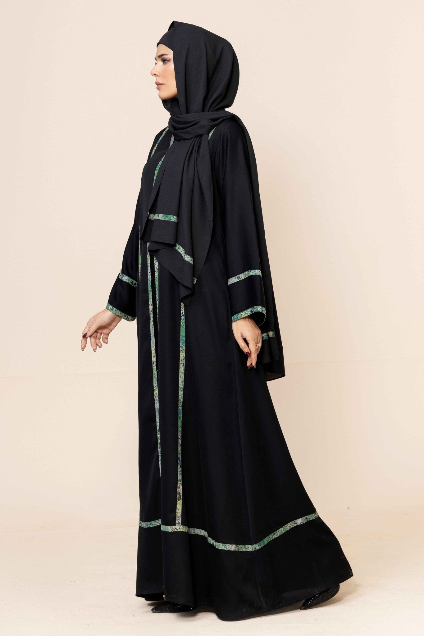 The Ember abaya is crafted in premium Nida with ankle length flow, detailed with green printed silk edgings. Paired with a matching chiffon hijab, it blends elegance and modern modest style.