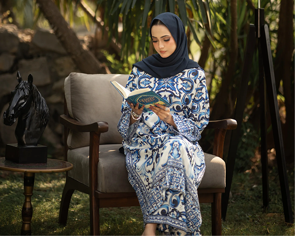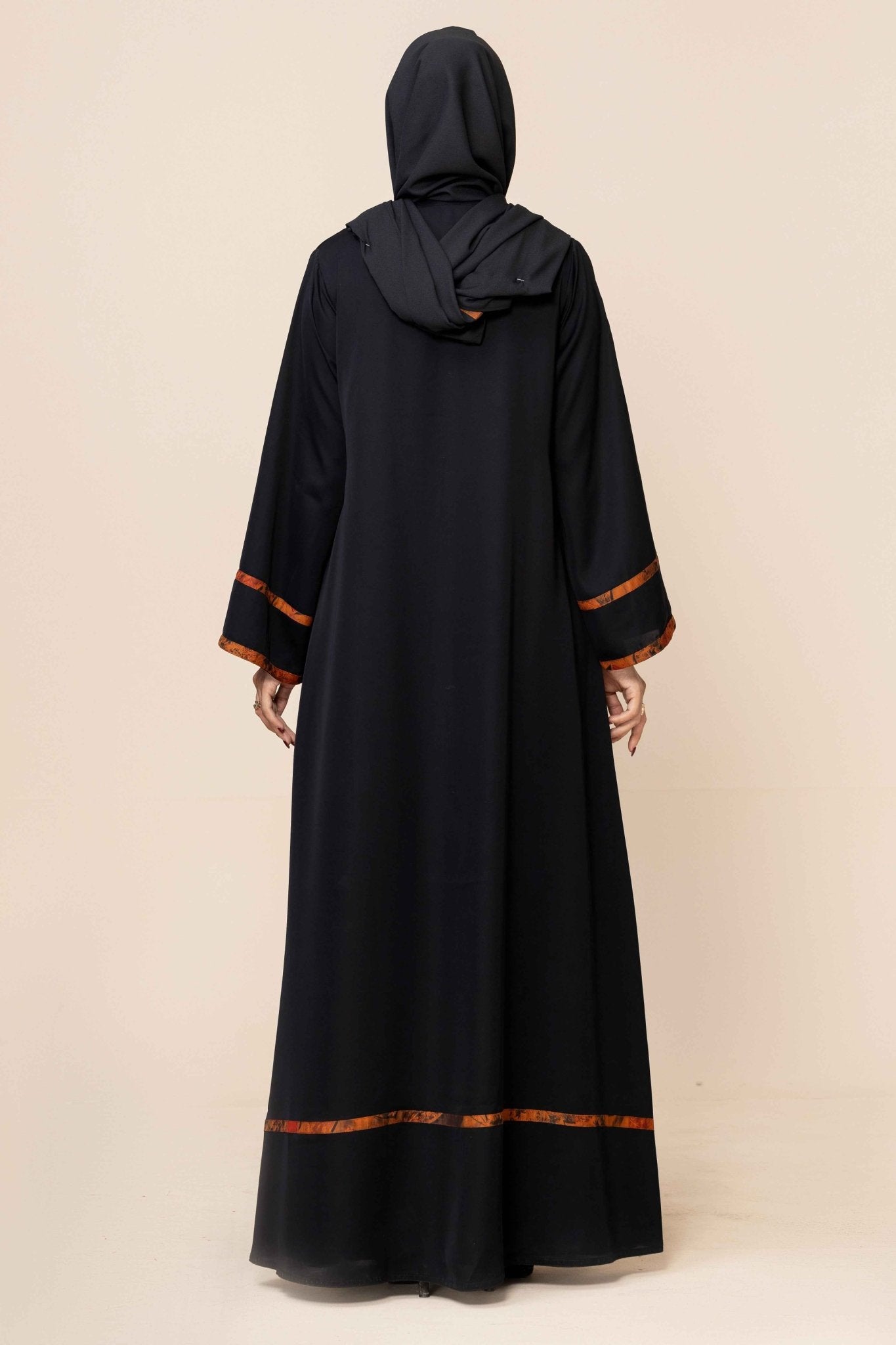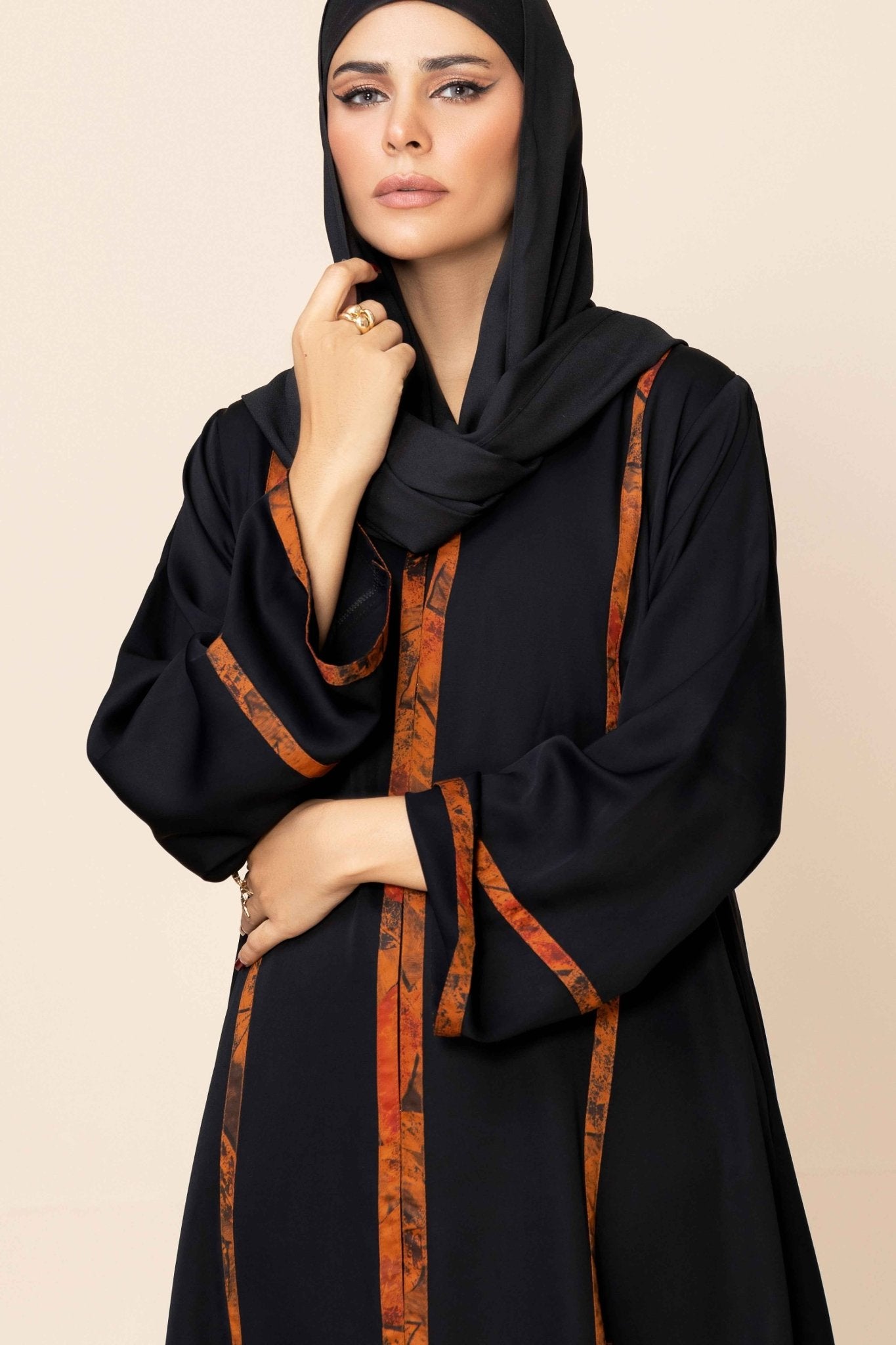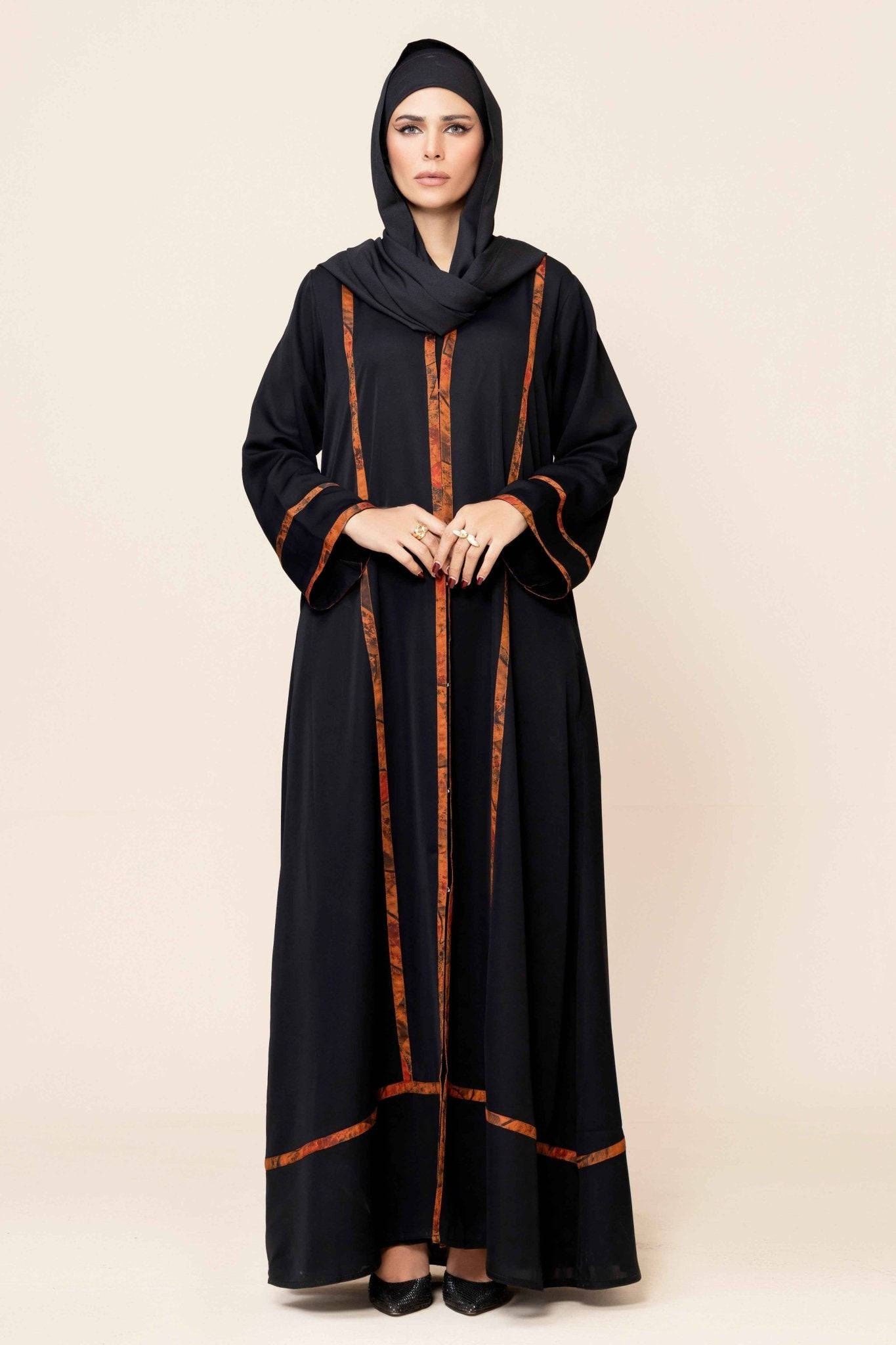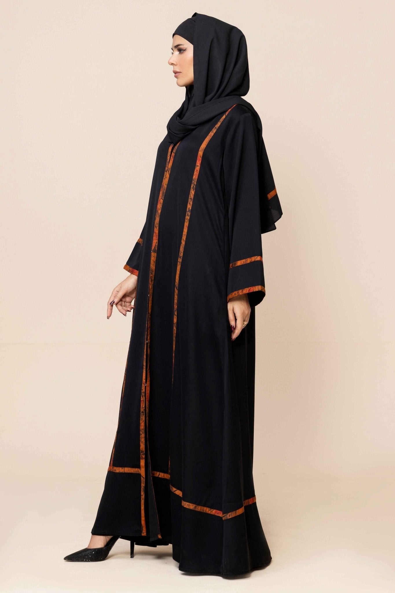 The Ember rust abaya is crafted in premium Nida with ankle length flow, detailed with rust printed silk edgings. Paired with a matching chiffon hijab, it blends elegance and modern modest style.