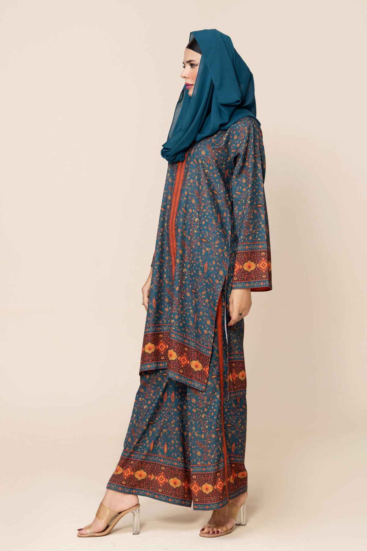 The Ethnic Co-Ord in zinc viscose is a perfect blend of comfort and elegance. Designed with a knee-length loose shirt and flared trousers, it features a V-cut ban neckline and rust contrast edgings for a chic cultural vibe. Lightweight and breathable.