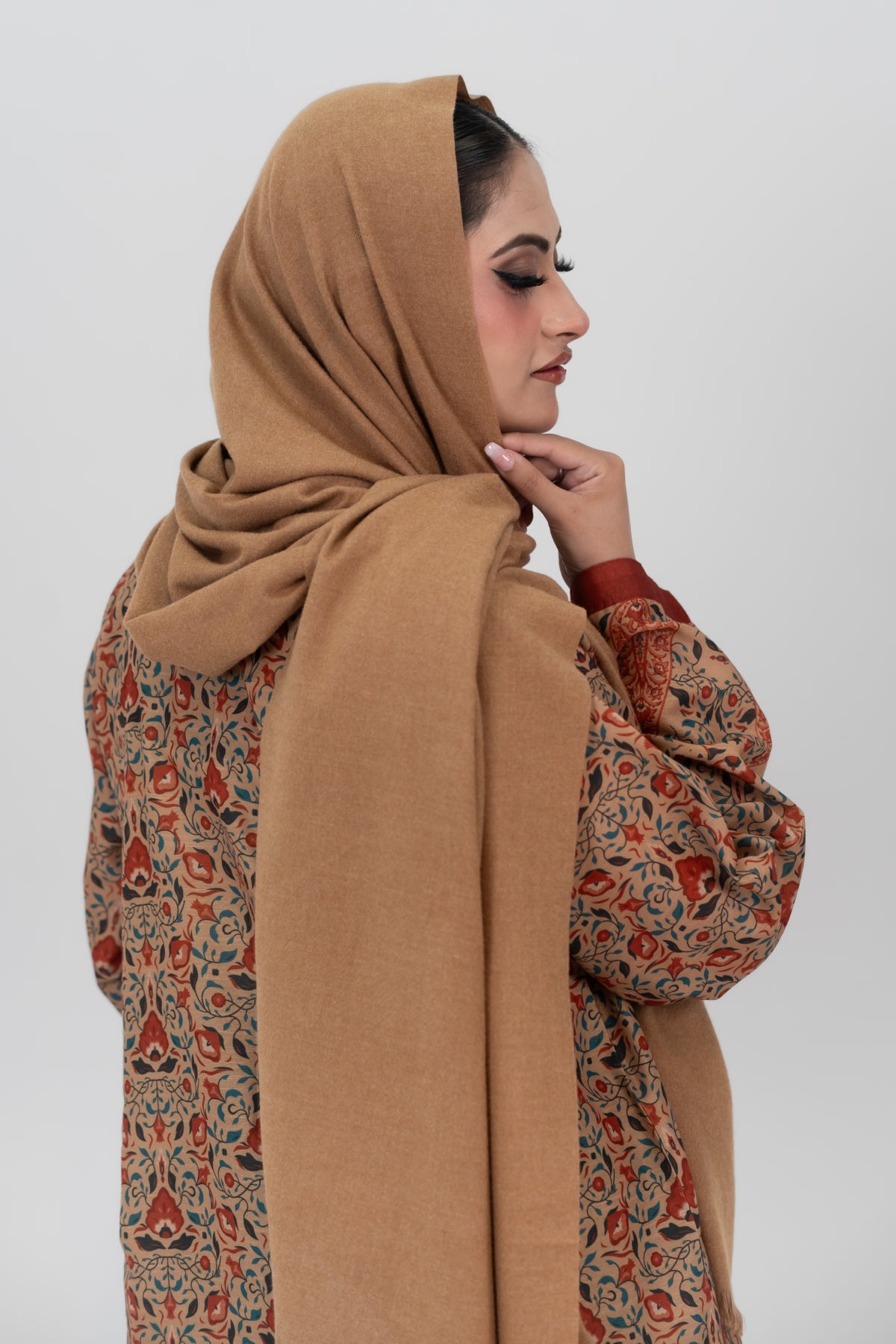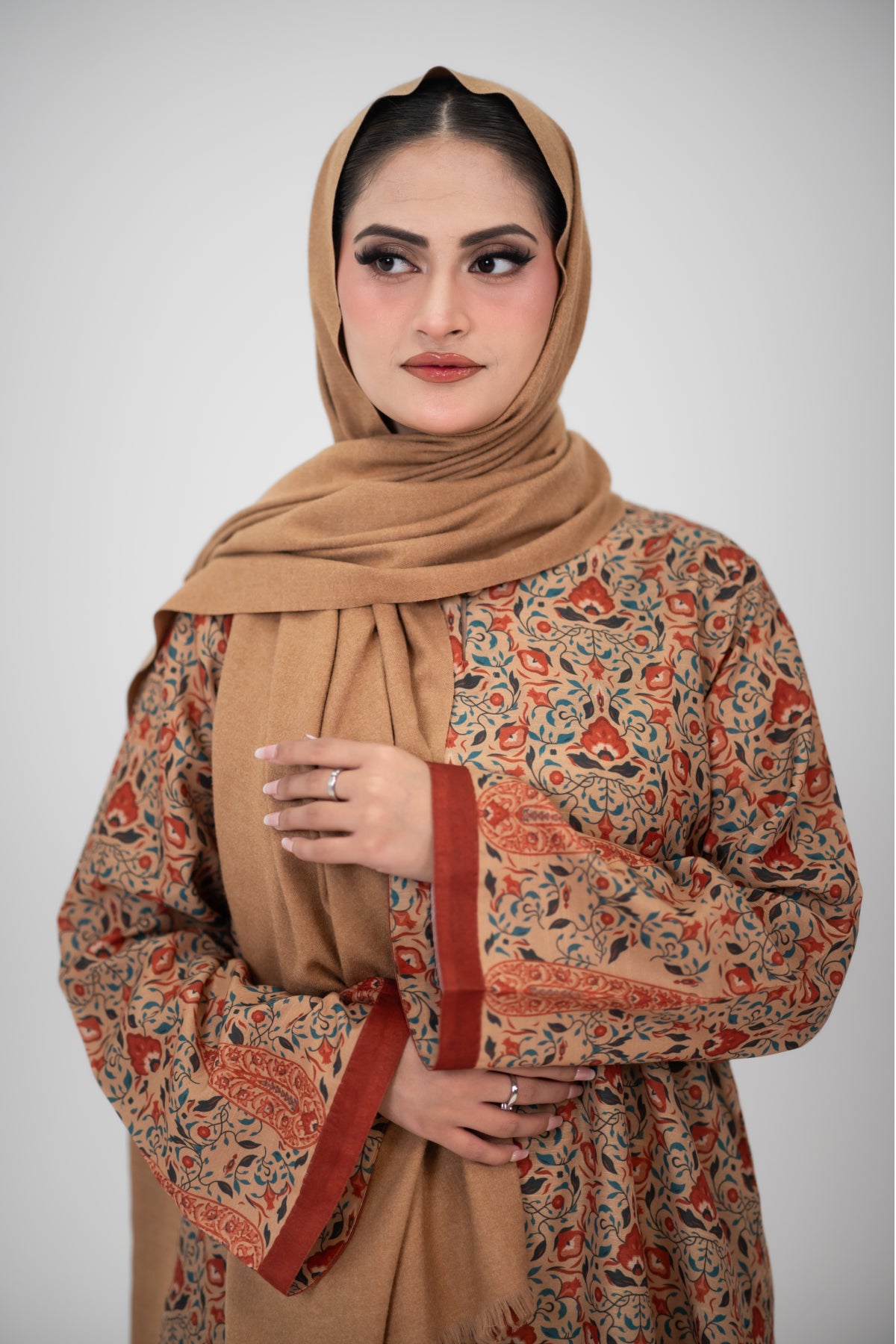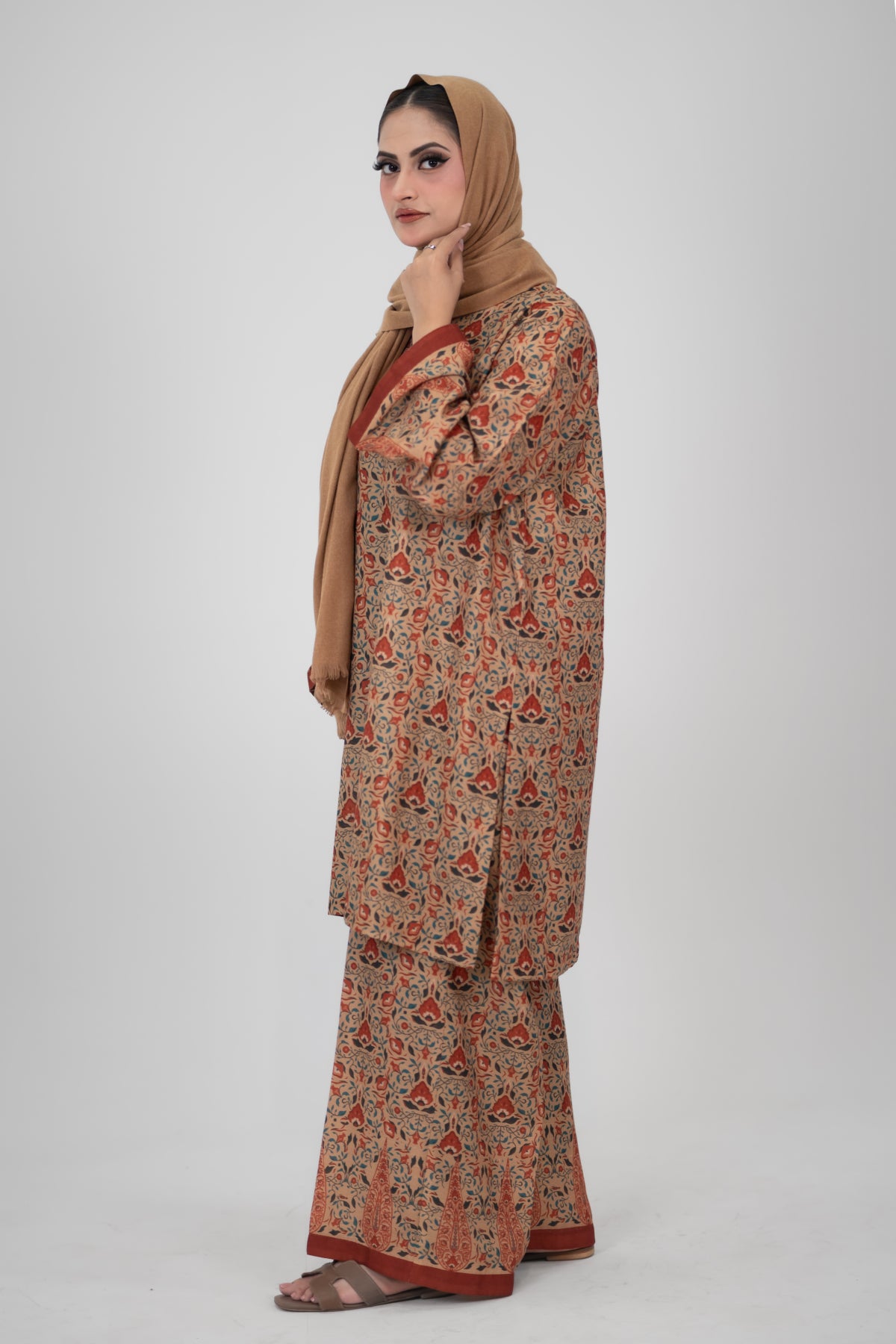 A graceful creamy peach co-ord set adorned with ethnic-inspired motifs in earthy tones. Crafted from soft viscose, it blends traditional charm with timeless sophistication.