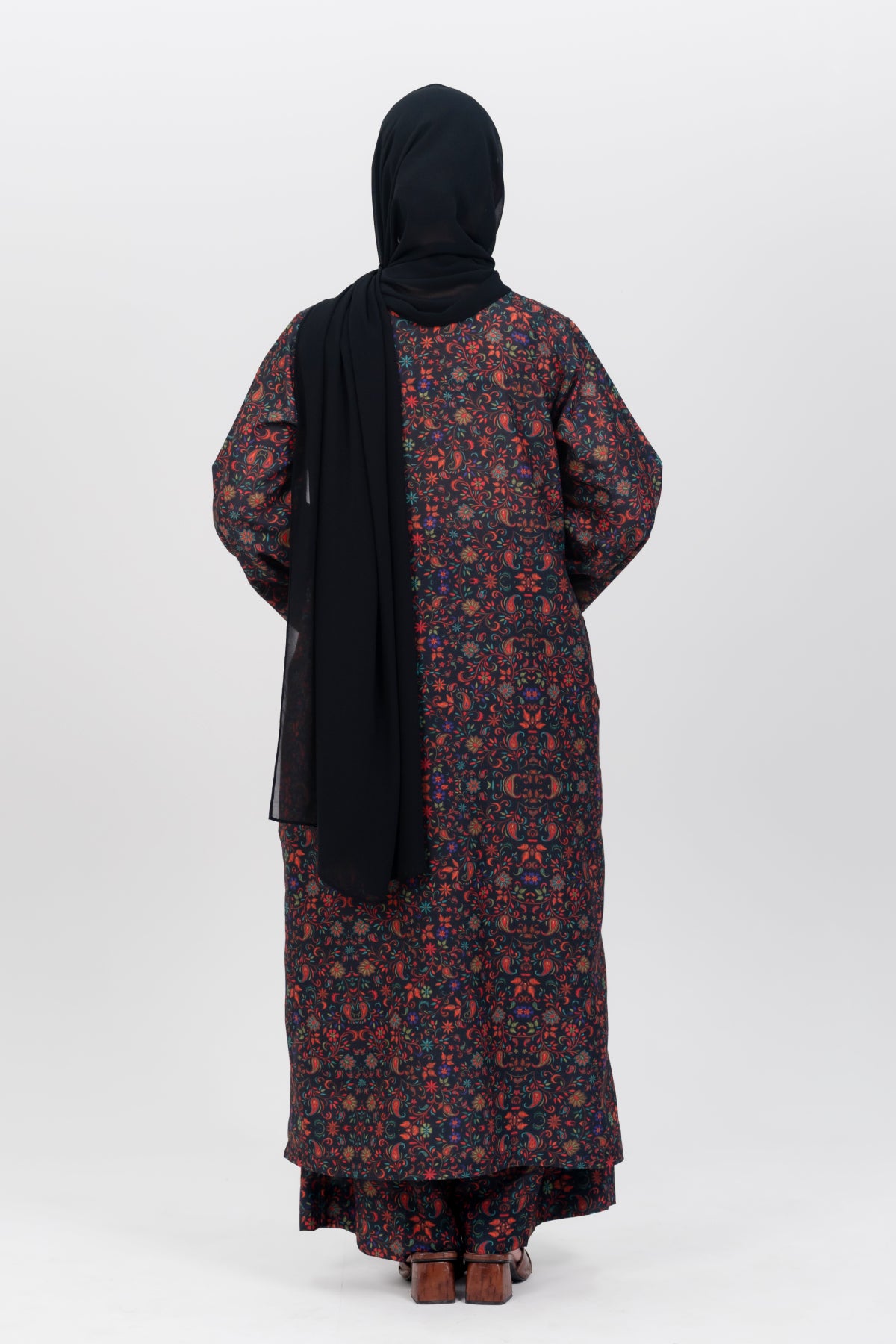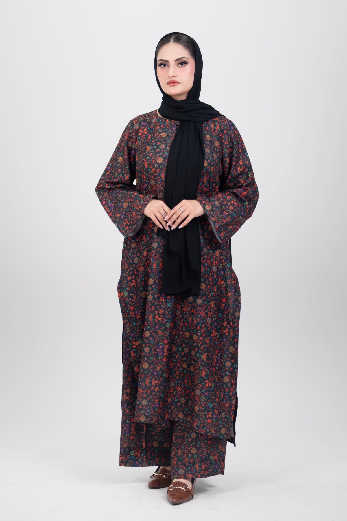 An elegant black Kashmiri co-ord set adorned with vibrant floral and paisley motifs. Crafted from premium viscose, it radiates festive elegance and timeless charm.