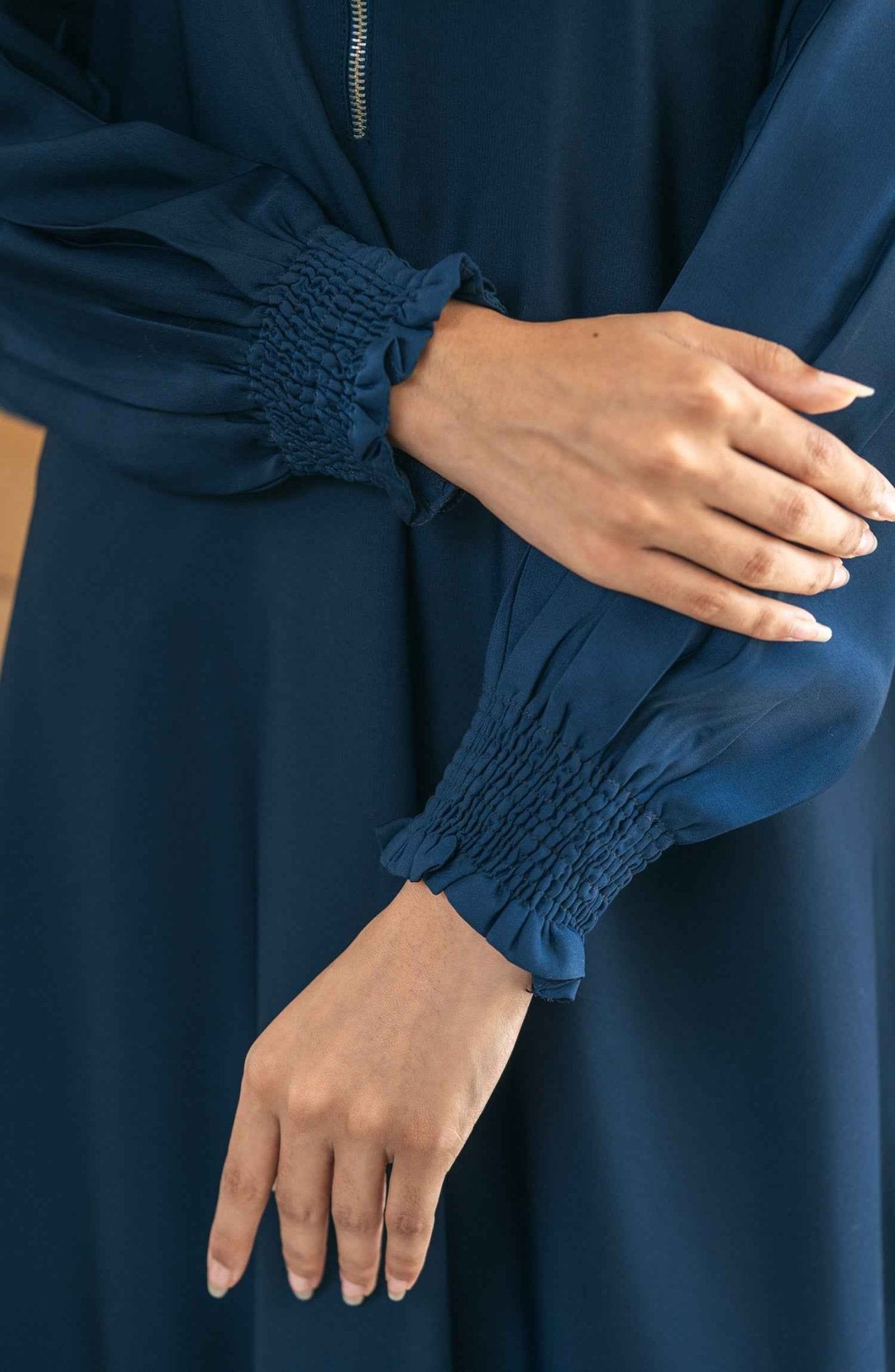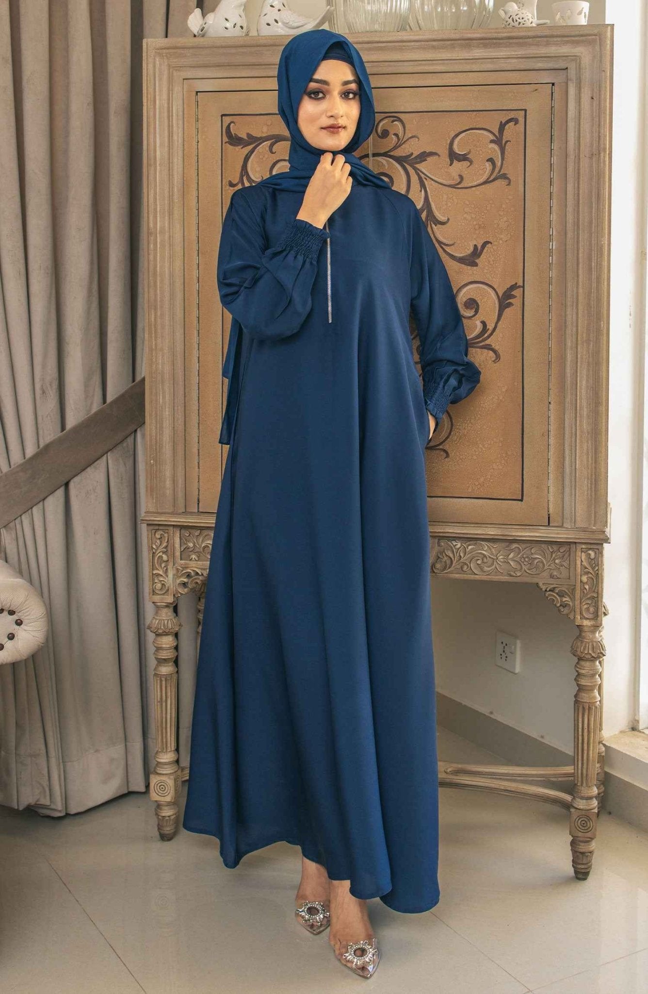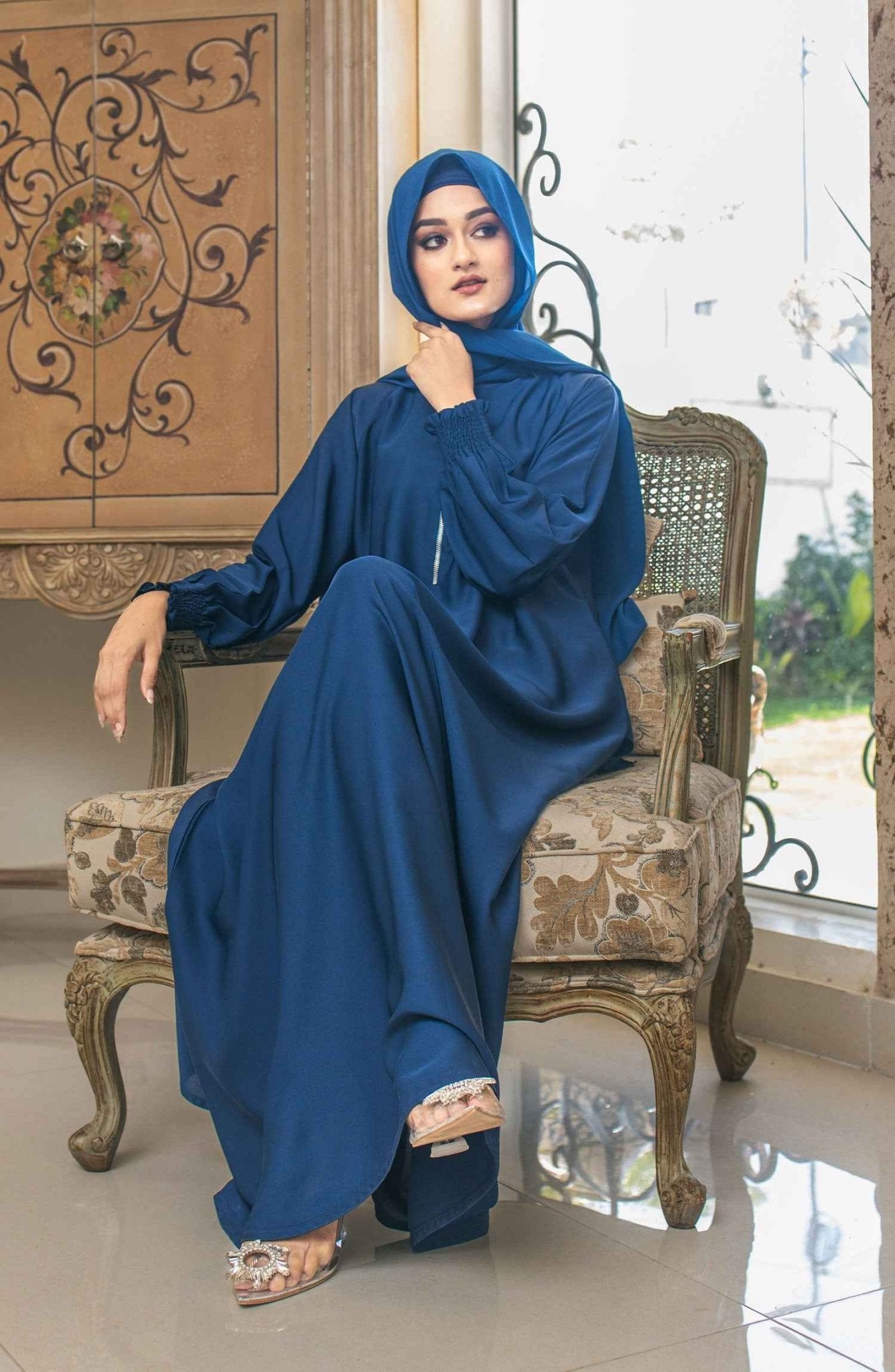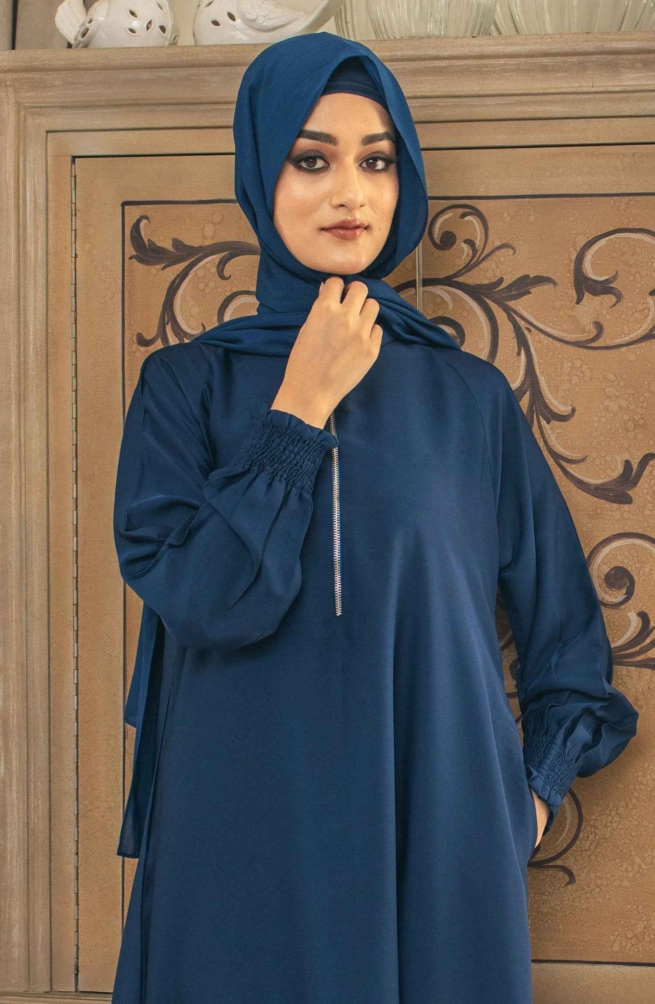 Make a statement in this striking blue abaya, featuring a front-closed design, metallic zipper detail, raglan sleeves with shirred hem, and side pockets. A perfect balance of elegance, comfort, and practicality.