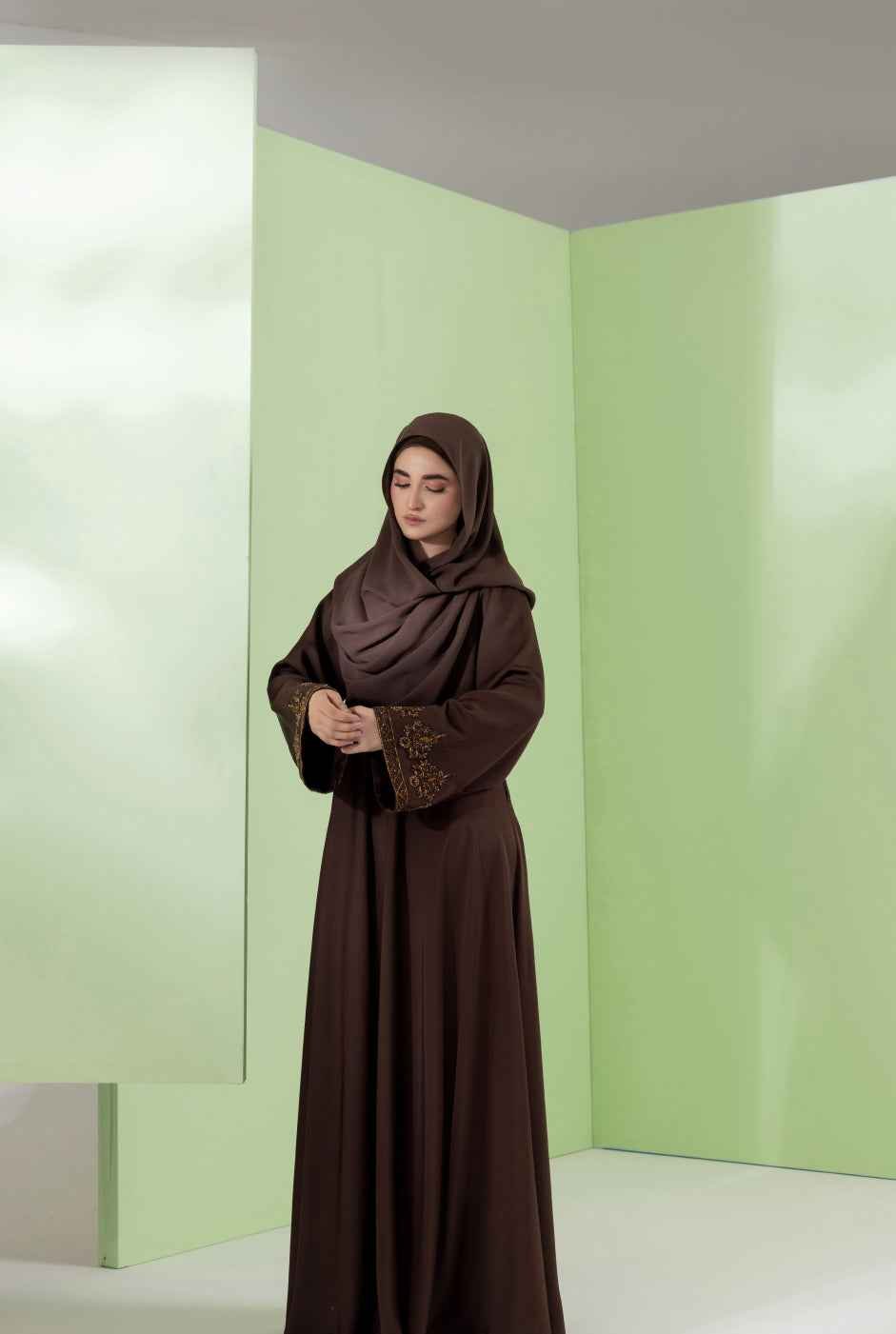 Mocha Luxe is a full-length abaya in deep brown Korean Nida, designed with a flared silhouette and separate belt for adjustable waist fitting. Featuring loose embellished sleeves and antique gold handwork.