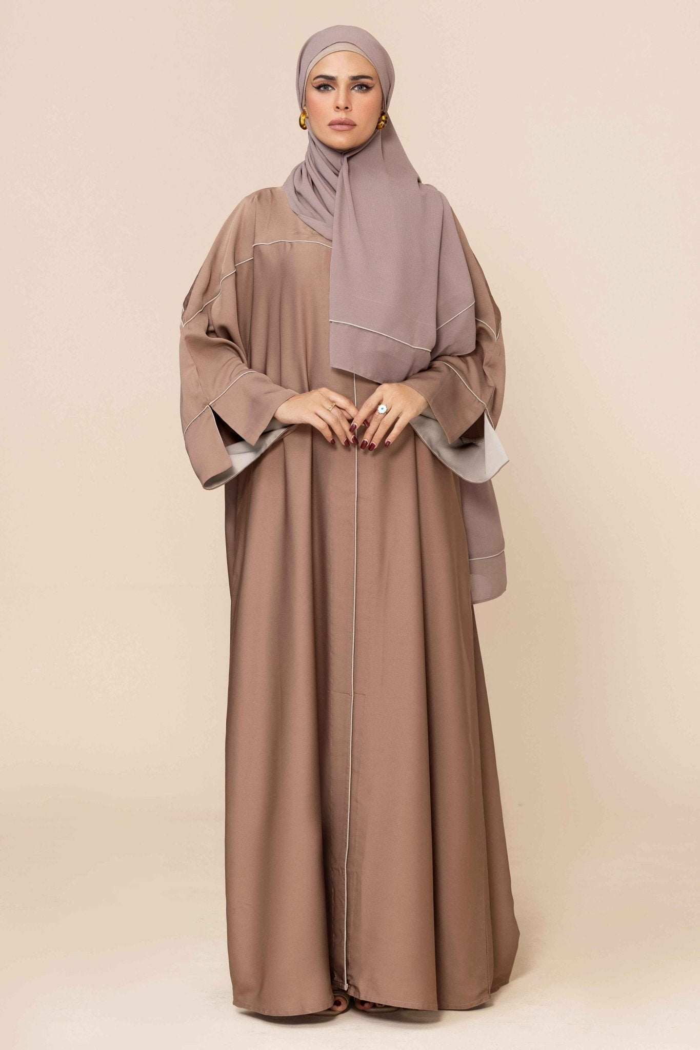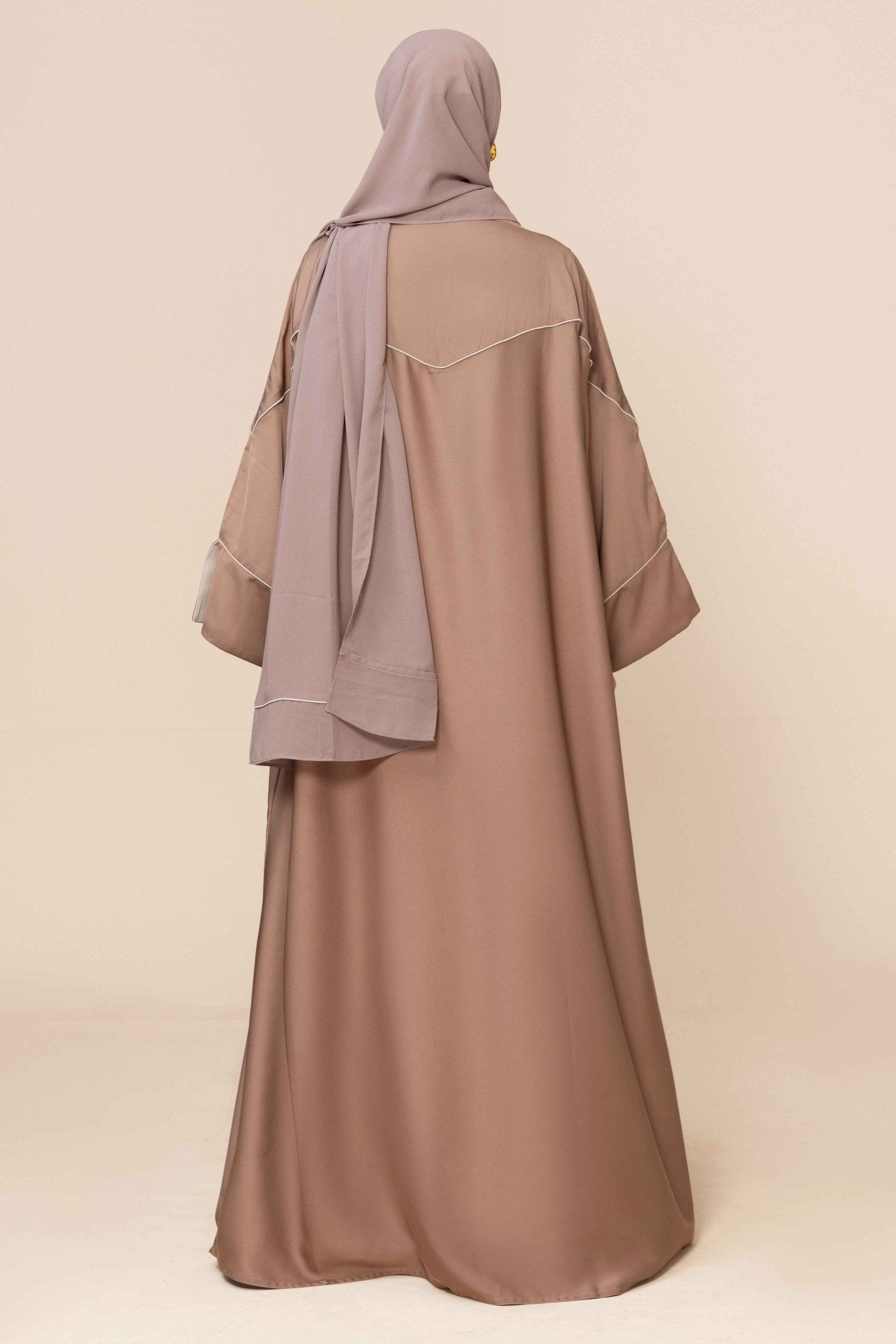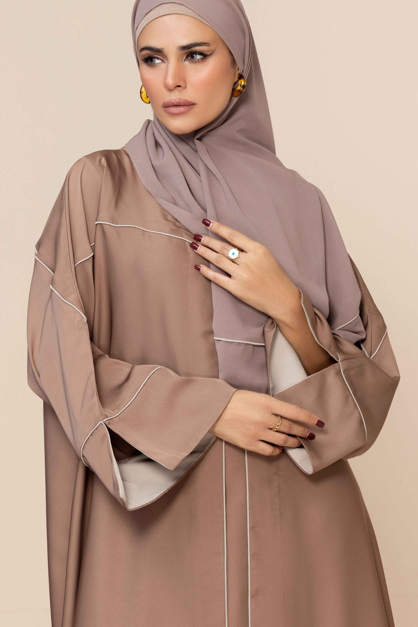The Mocha Wave Abaya blends modern elegance with modest charm. Crafted in premium Korean Nida, this full-length flared abaya features contrast beige trims along the bodice and center front for a defined silhouette.