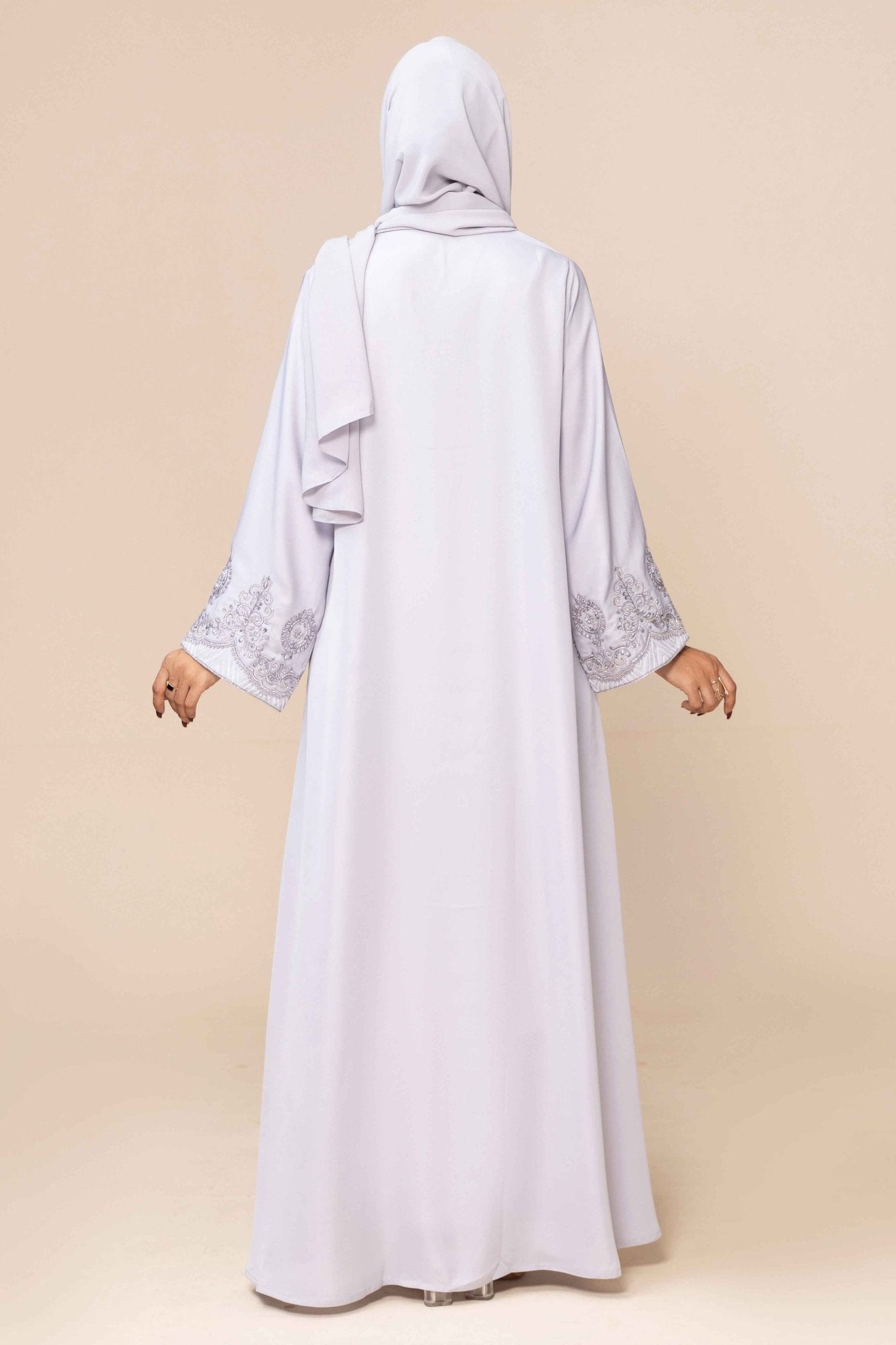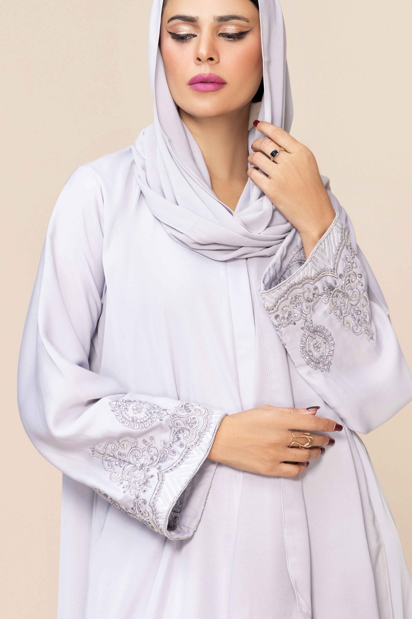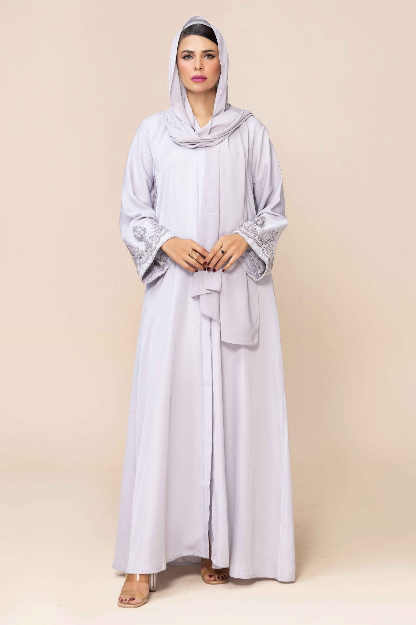 Elevate your wardrobe with this light grey Korean Nida abaya, styled in a front-open silhouette with a snap button closure. The sleeves feature delicate floral and paisley motifs, intricately embroidered in silver threadwork.