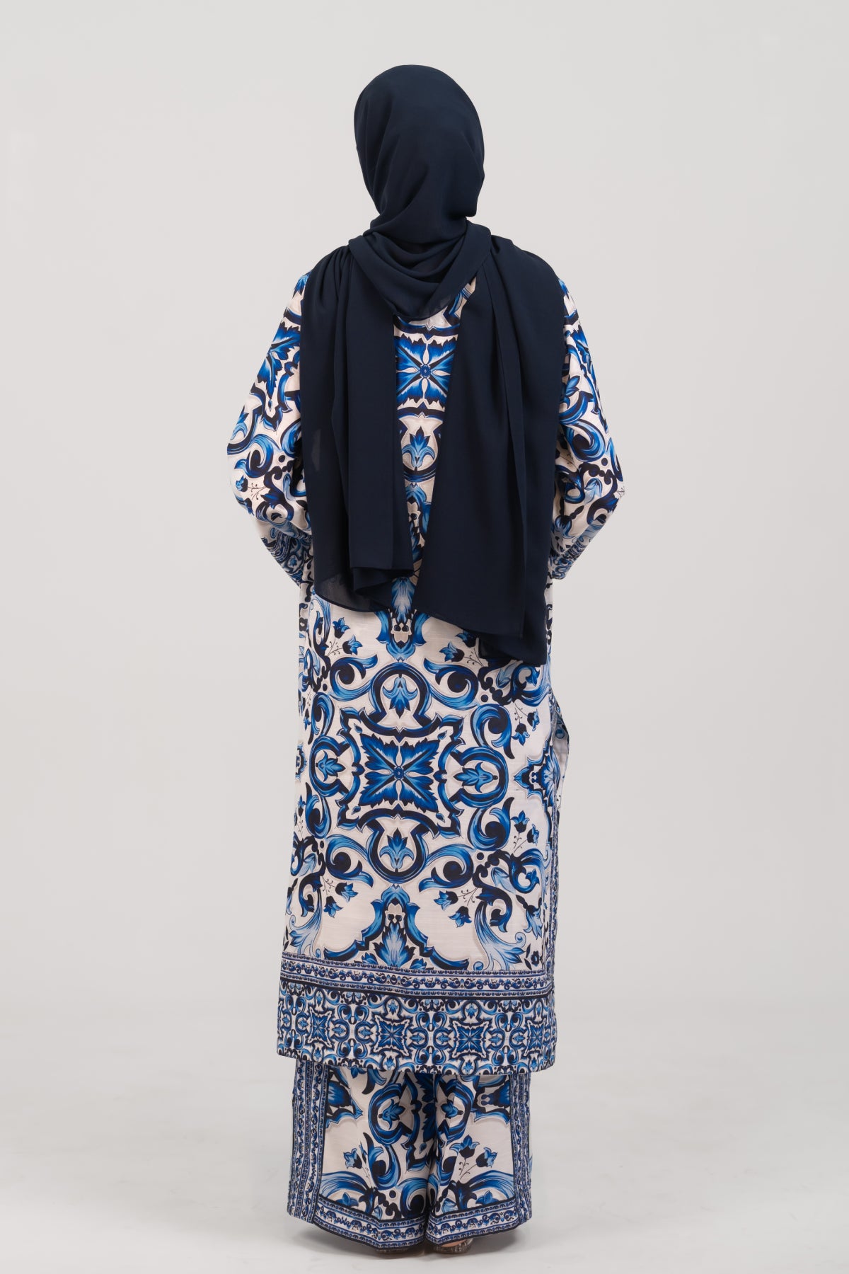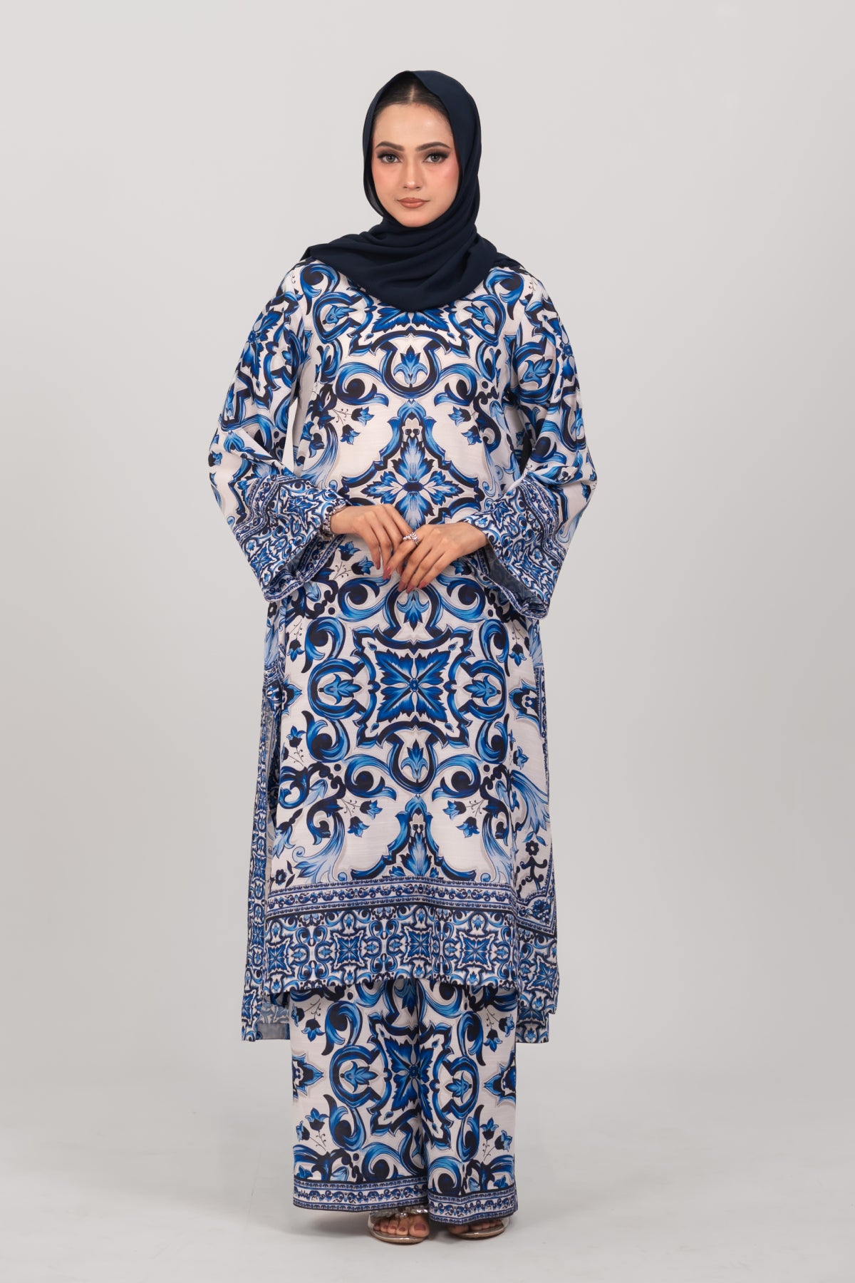 The Multani Co-ord Set showcases timeless elegance through its blue and white baroque-inspired print, reminiscent of vintage ceramic tiles. Crafted from premium viscose, this long A-line cut shirt with a flattering V-neckline and flared trousers.