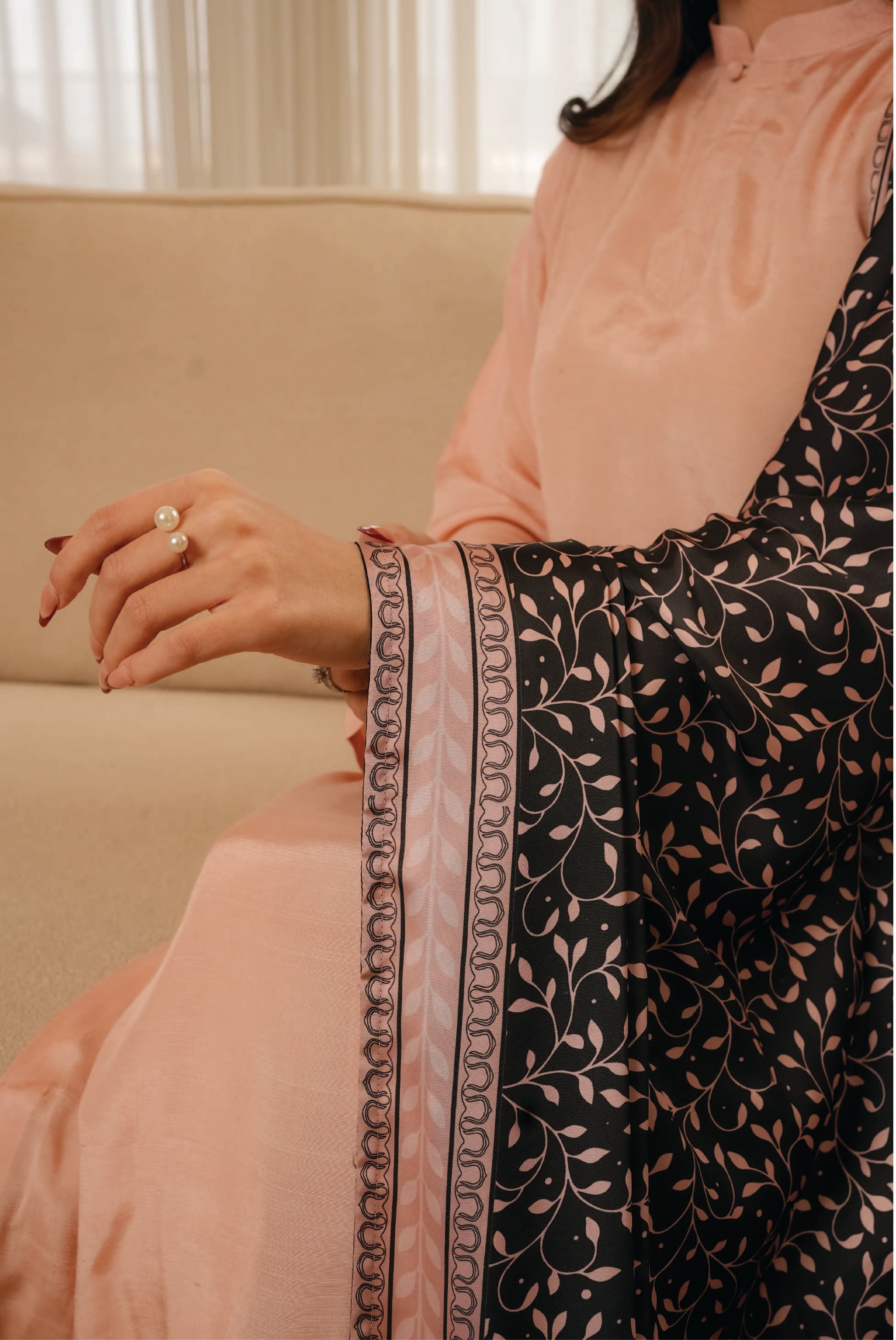 The Noir Vine Silk Shawl is a luxurious accessory featuring an elegant all-over vine print on a deep black base, accented with refined neutral borders. This non-embellished design delivers a sleek, timeless look, making this shawl perfect for formal and sophisticated styling.