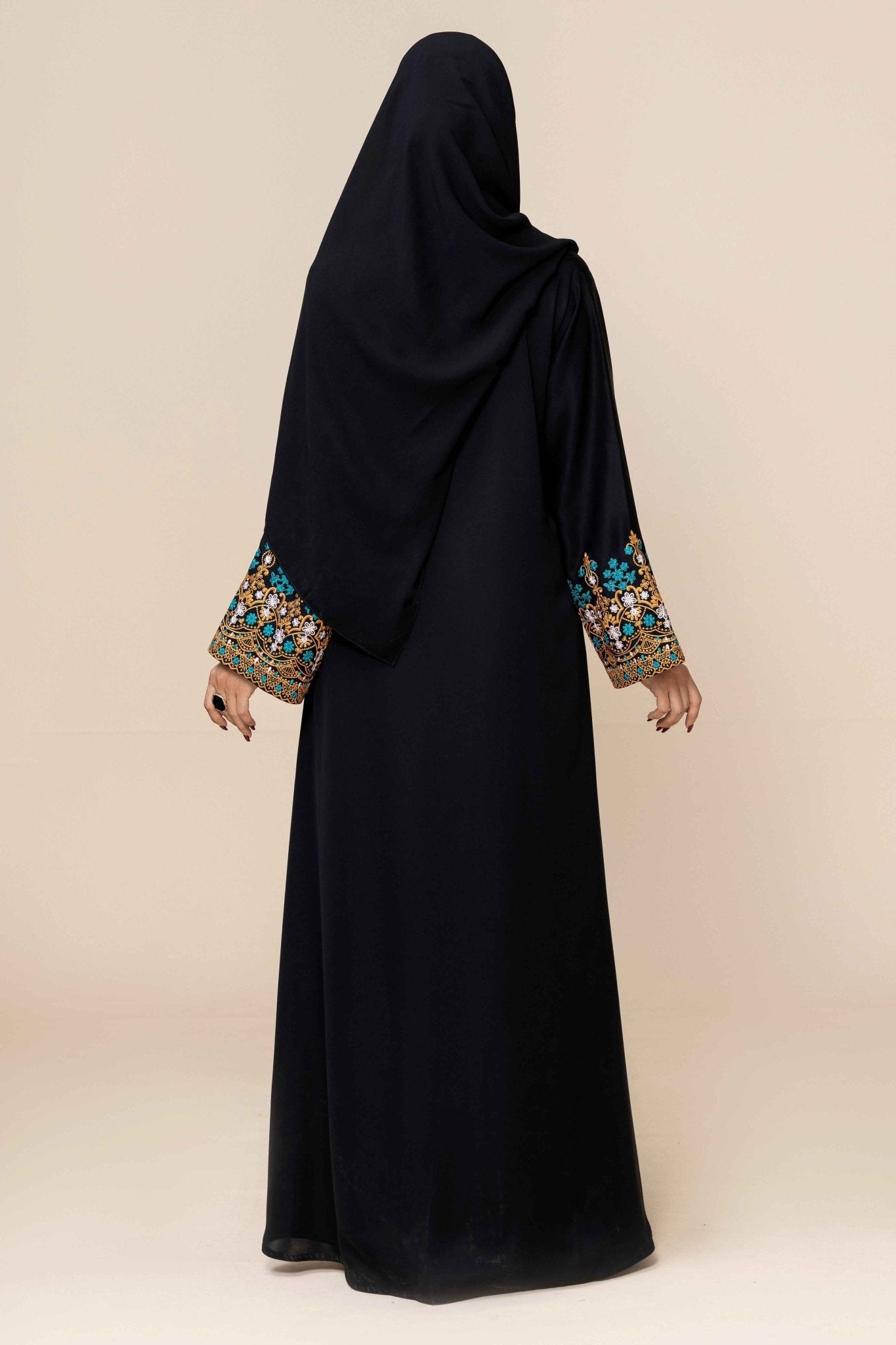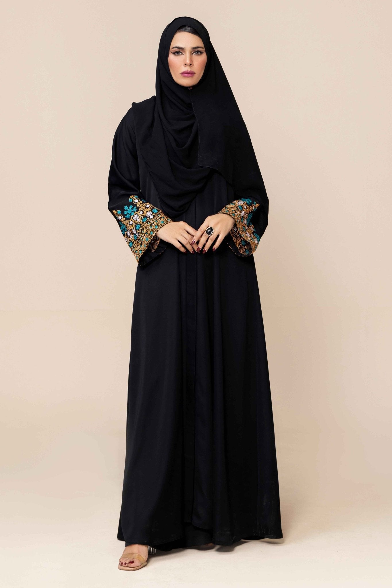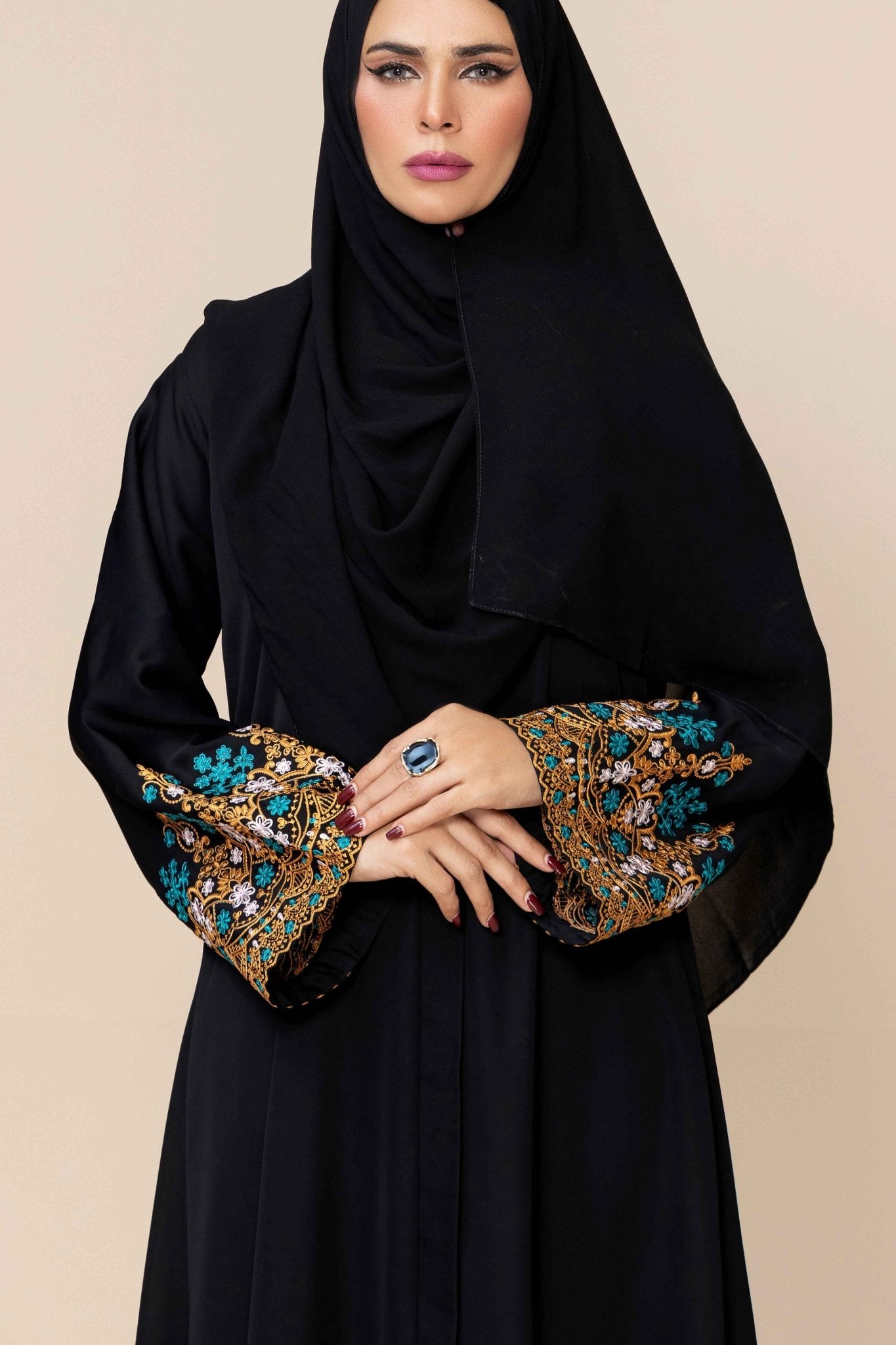 Crafted from premium Nida, the Noirah abaya exudes timeless elegance. Its scalloped sleeves are enhanced with mustard, turquoise, and white floral embroidery, creating a striking contrast on the black base.