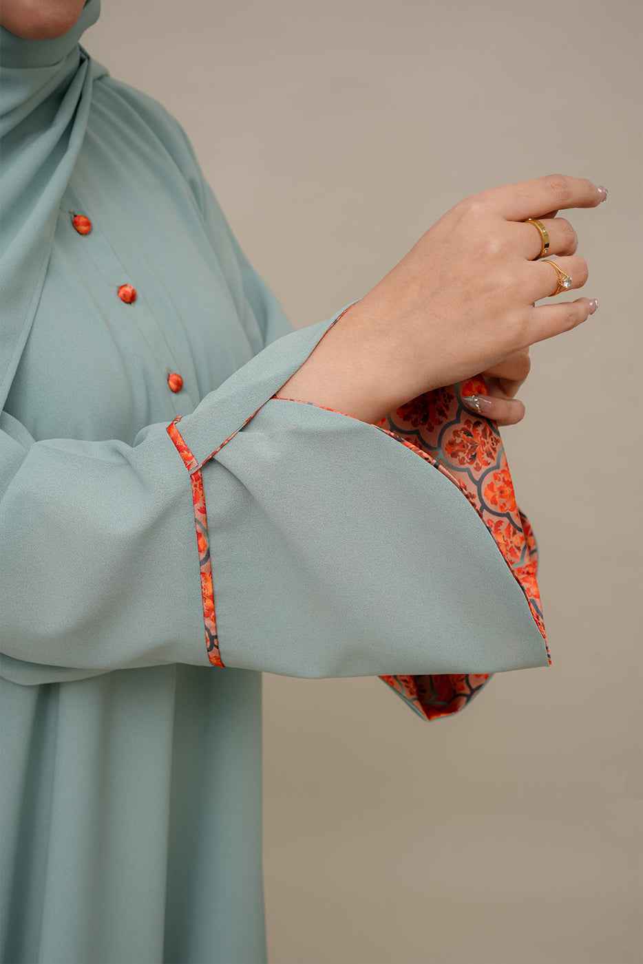 Step into refined elegance with the Noura Abaya, crafted from premium mint crepe silk with a silk lining for a graceful drape. Featuring printed accents, a sleek ban neckline, and a matching hijab, it’s perfect for modern modest style.