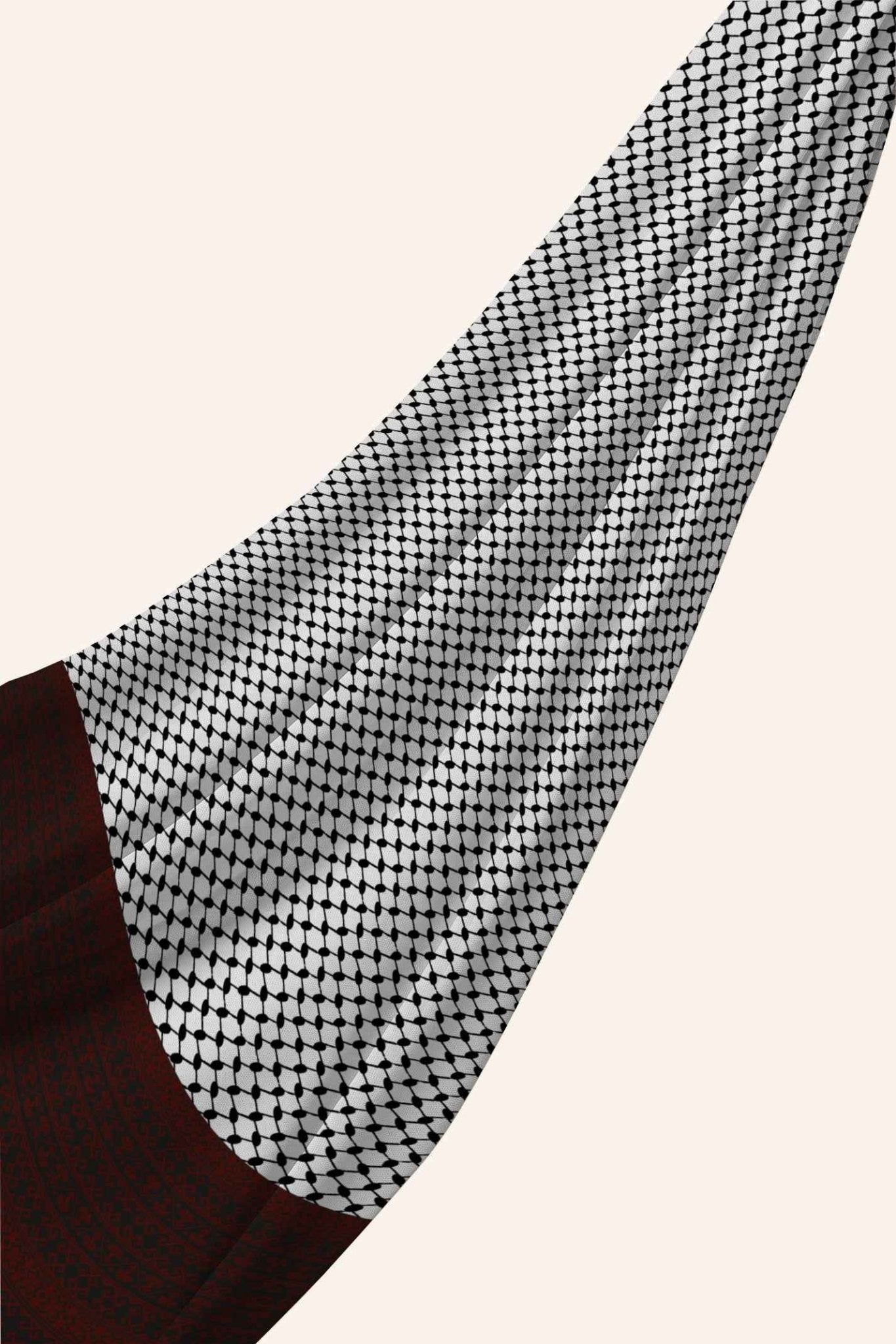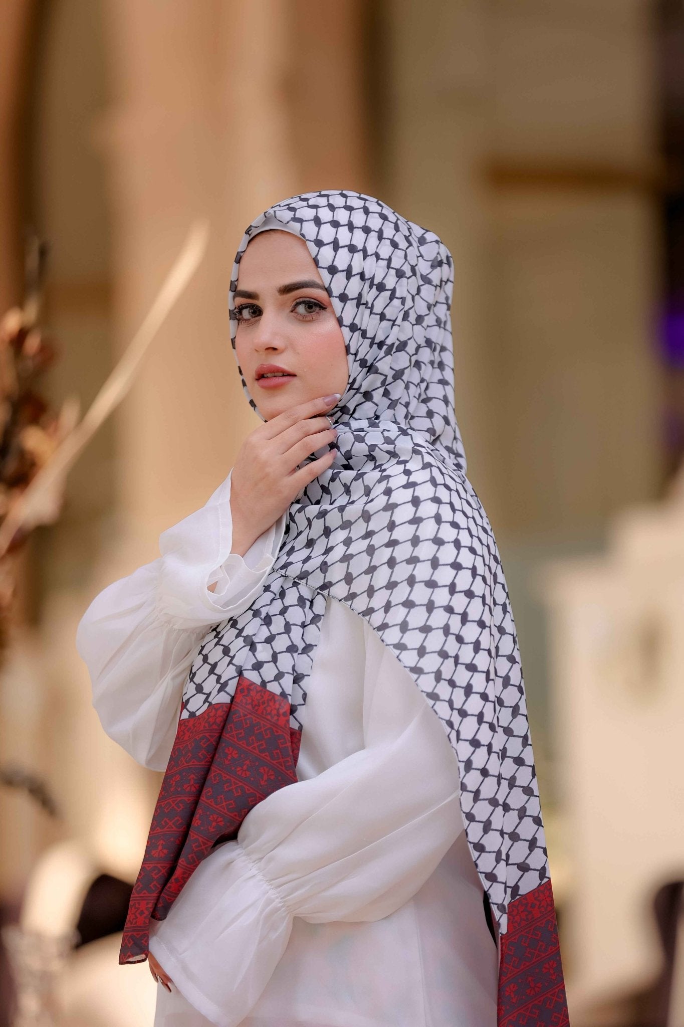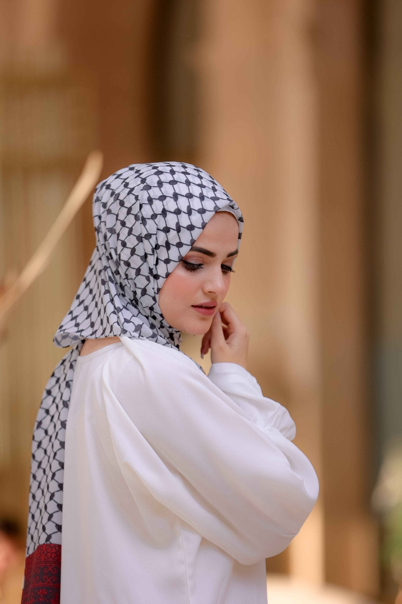 A timeless Palestinian Keffiyeh hijab, crafted in luxe chiffon with the classic black-and-white digital print. Lightweight, breathable, and elegant, it symbolizes heritage while offering everyday comfort and modest style.