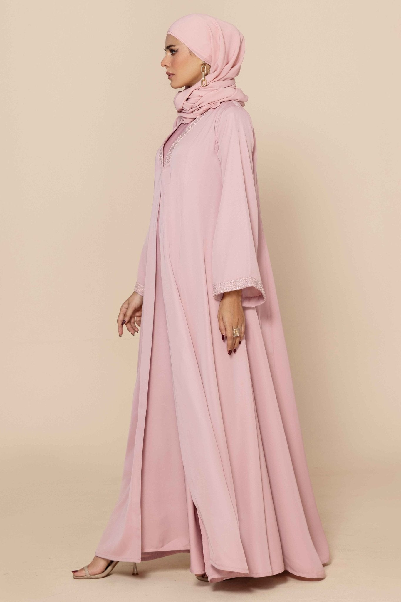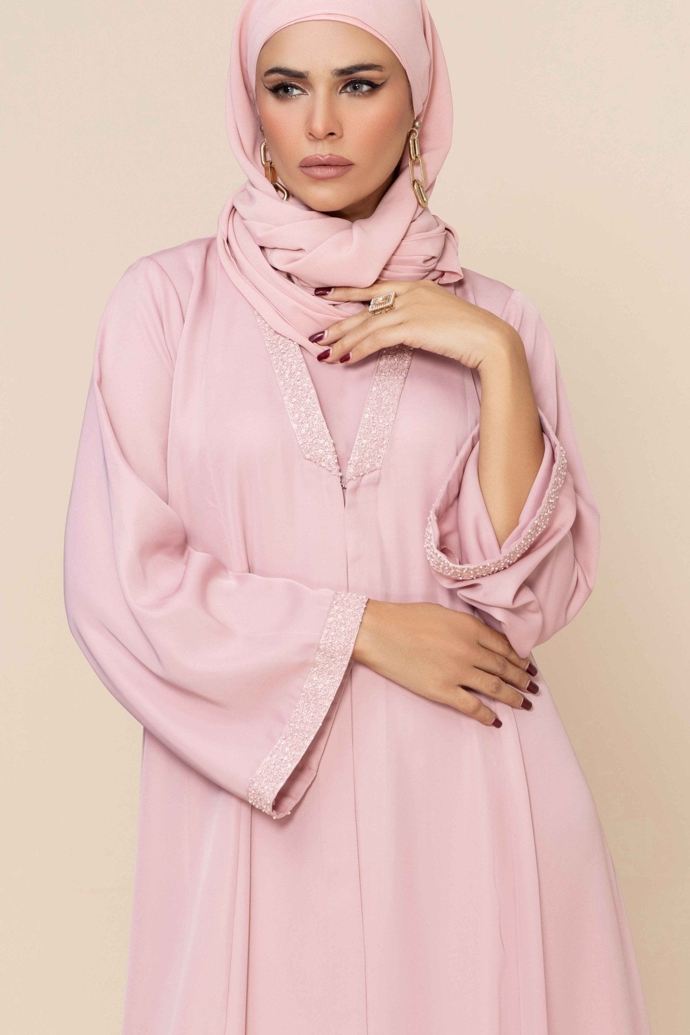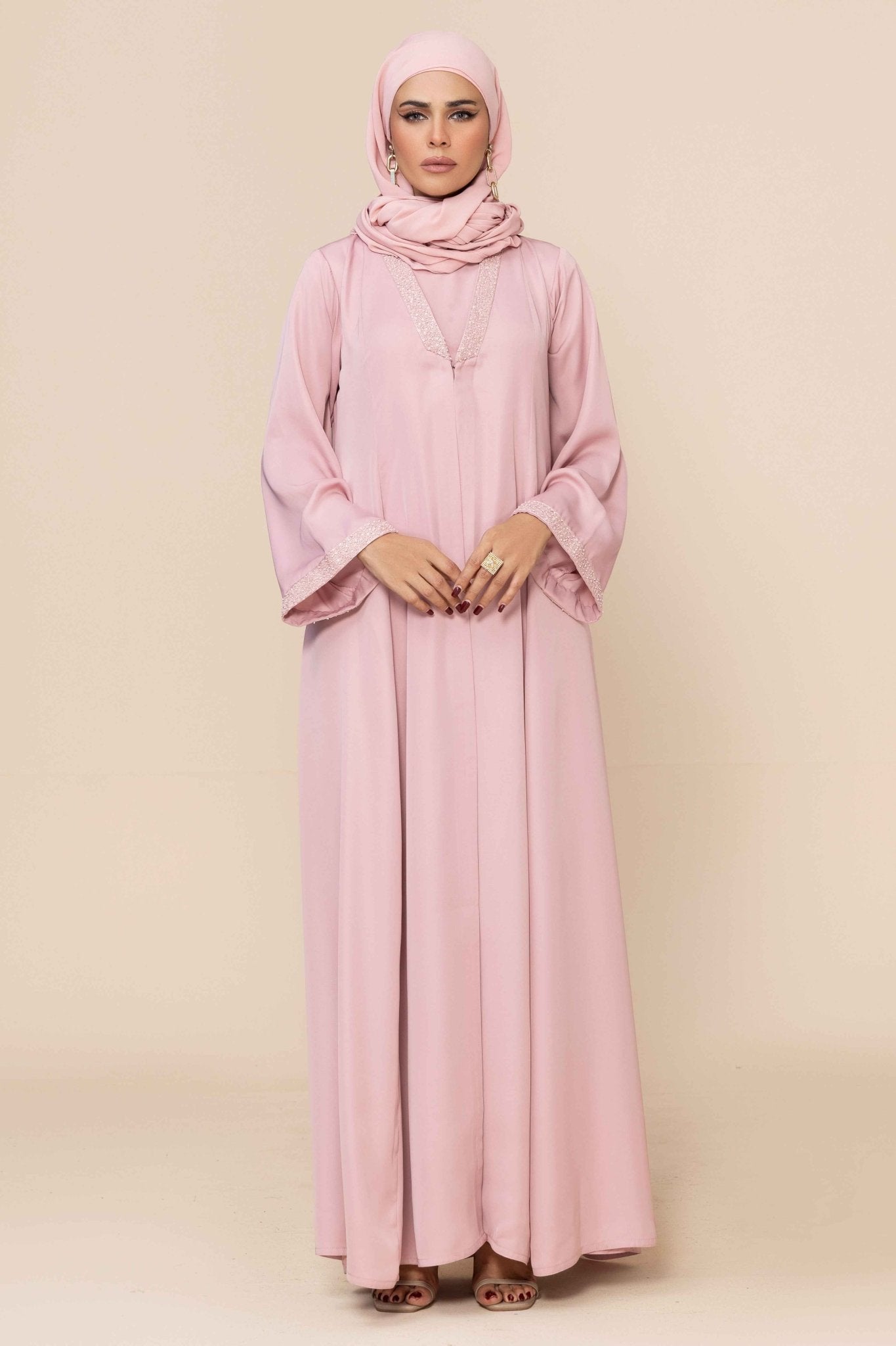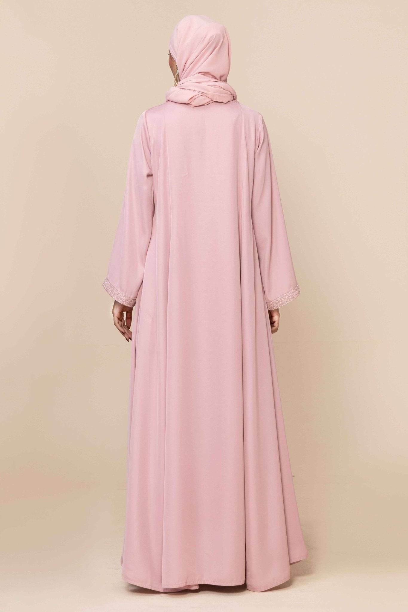 A graceful blush pink abaya in Korean Nida, designed with a paneled cut and hook-and-eye closure. The V-shaped neckline and sleeve hems shimmer with hand embellishments of glass beads and sequins, delicately set over crisscross embroidery for a refined finish.