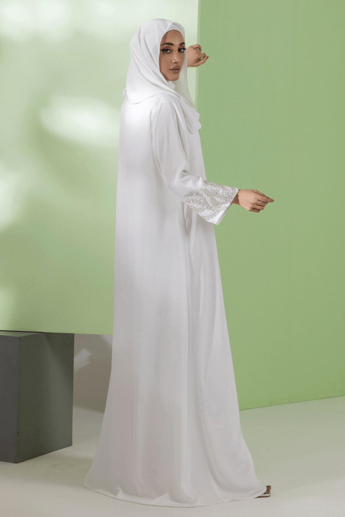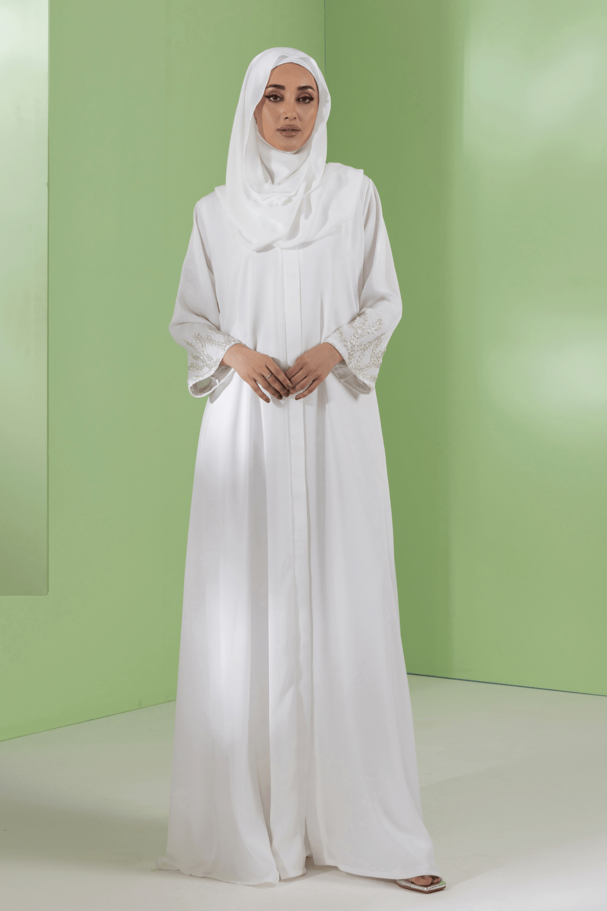 Radiance is a graceful full-length abaya in white Korean Nida, designed with a front-open silhouette and snap button closure. The loose-cut sleeves are hand-embellished adding refined elegance and timeless charm to your modest wardrobe.