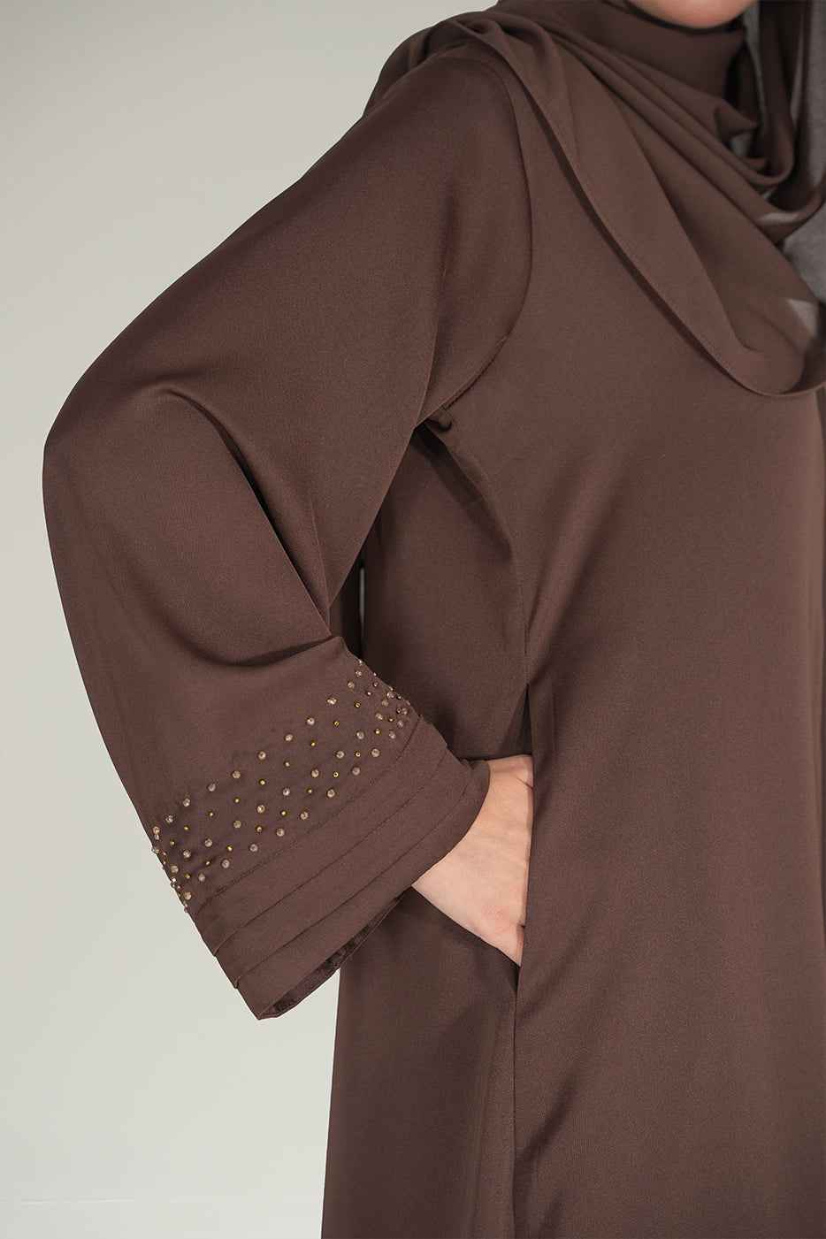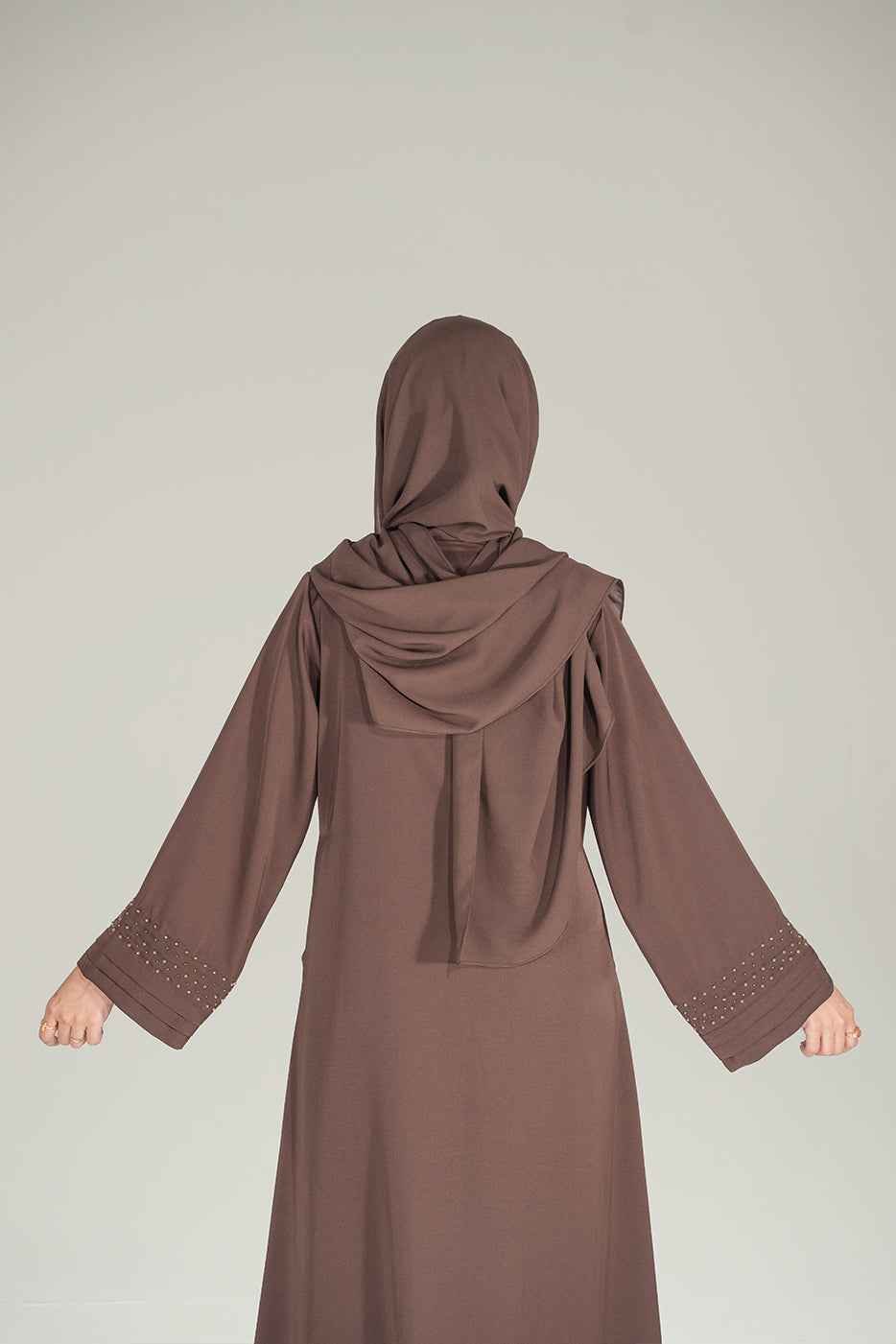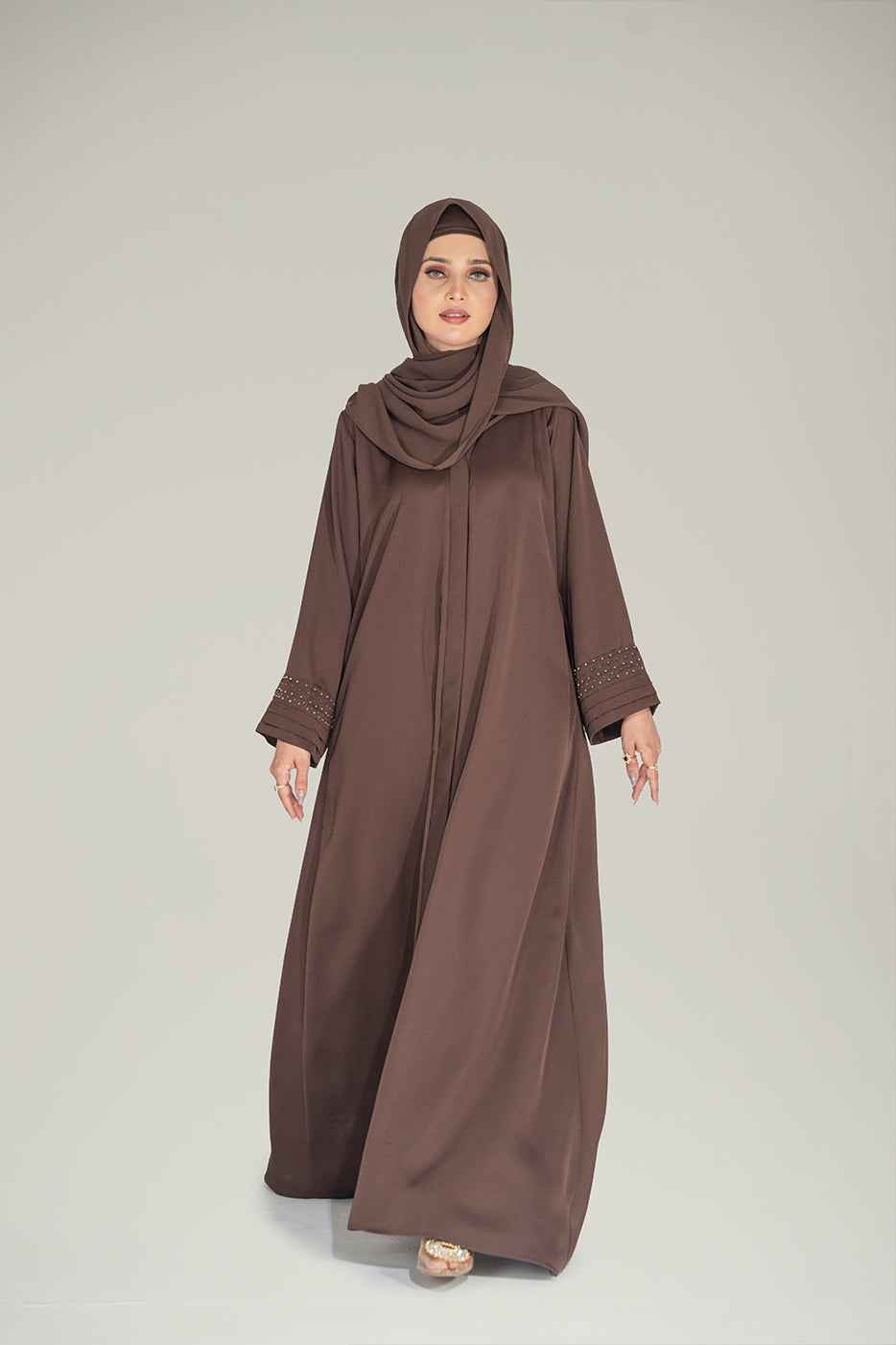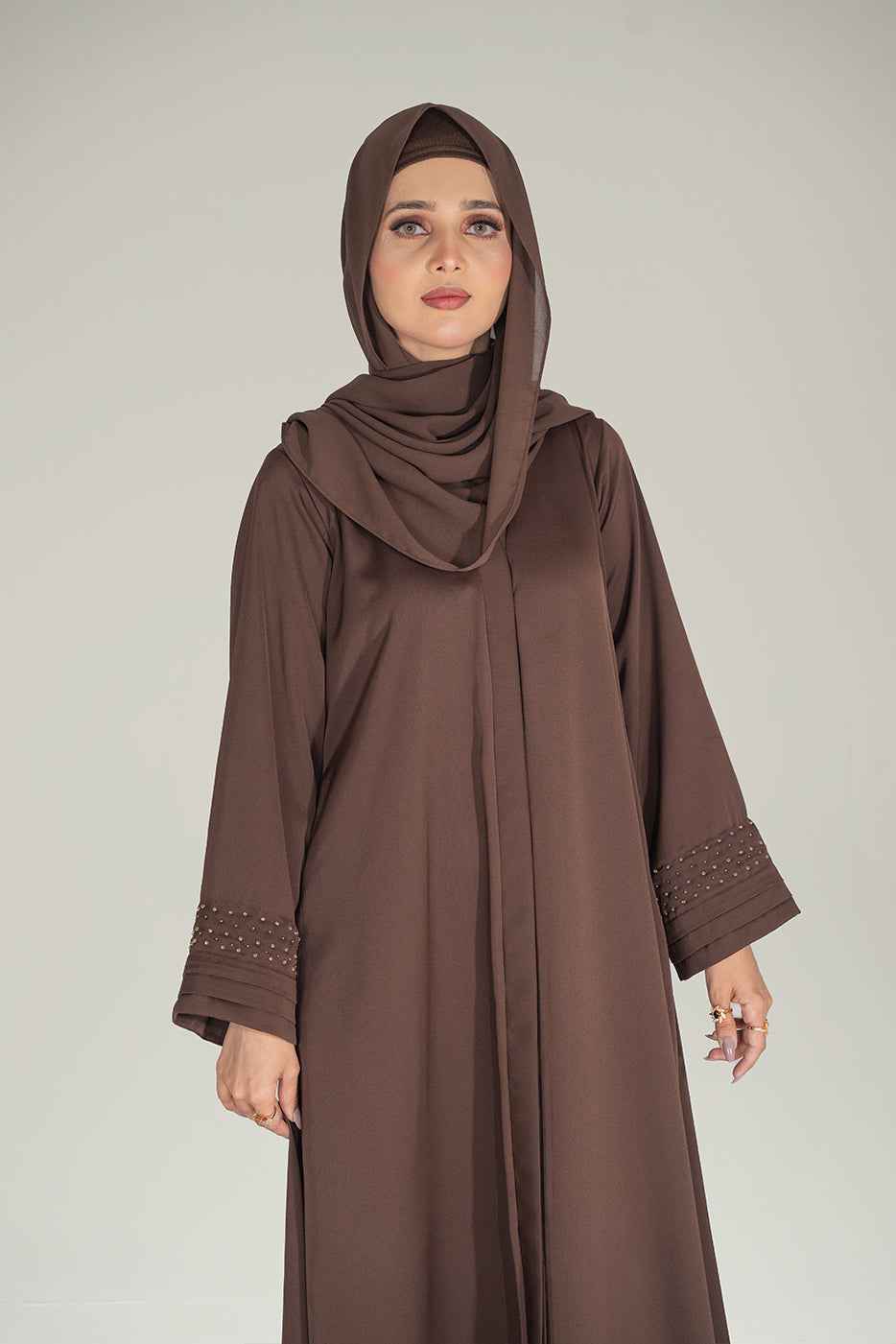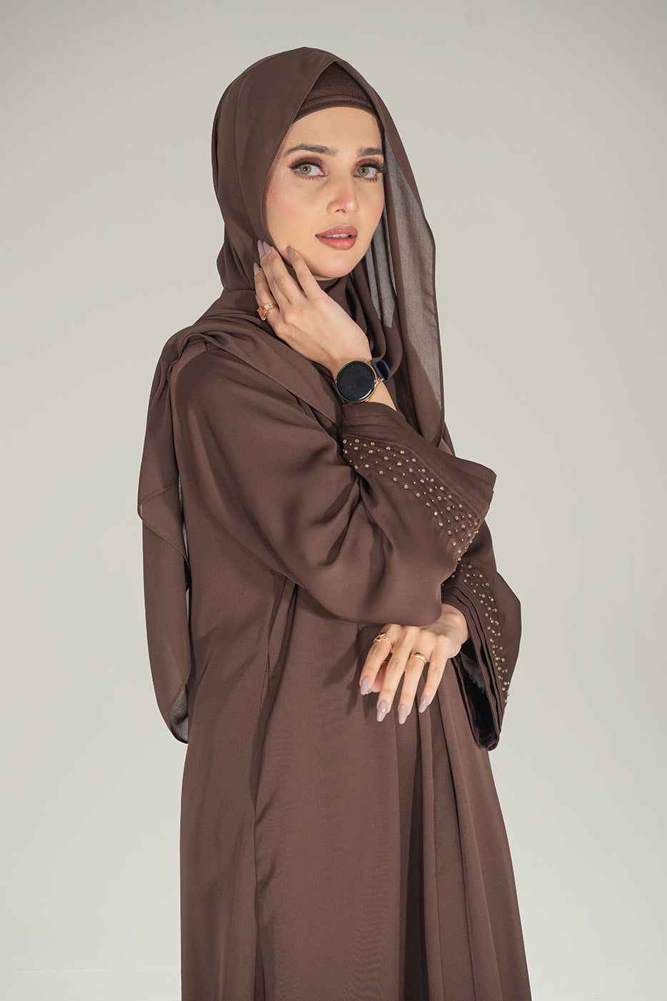 Classic brown meets pearl elegance in the Rayhan Abaya. Crafted from breathable Nida fabric, this front-open abaya features pleated loose sleeves adorned with delicate pearl sprays, adding a graceful charm to your modest look.