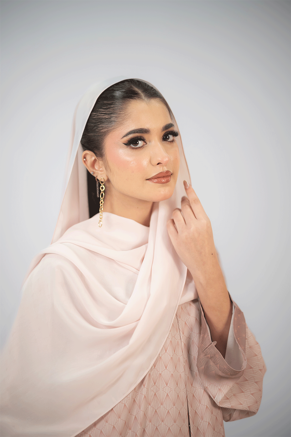 The Rose Kimono is a full-length powder pink chiffon casual kimono with loose straight sleeves, side slits, and a blush-to-dusty rose geometric print. It comes with a sleeveless viscose inner and plain hijab, forming a stylish rose pink abaya set.