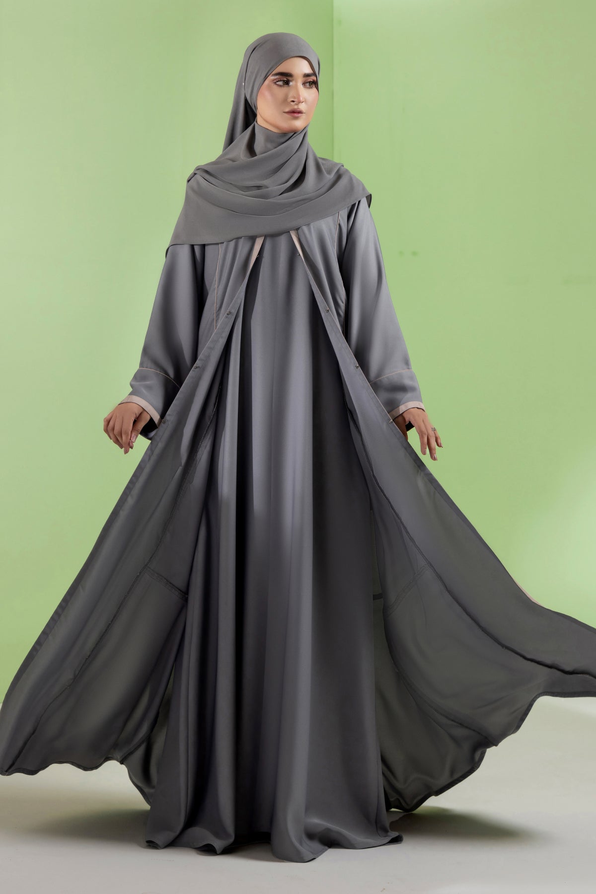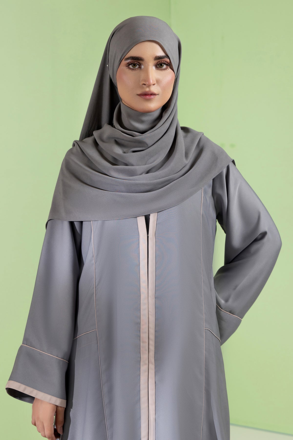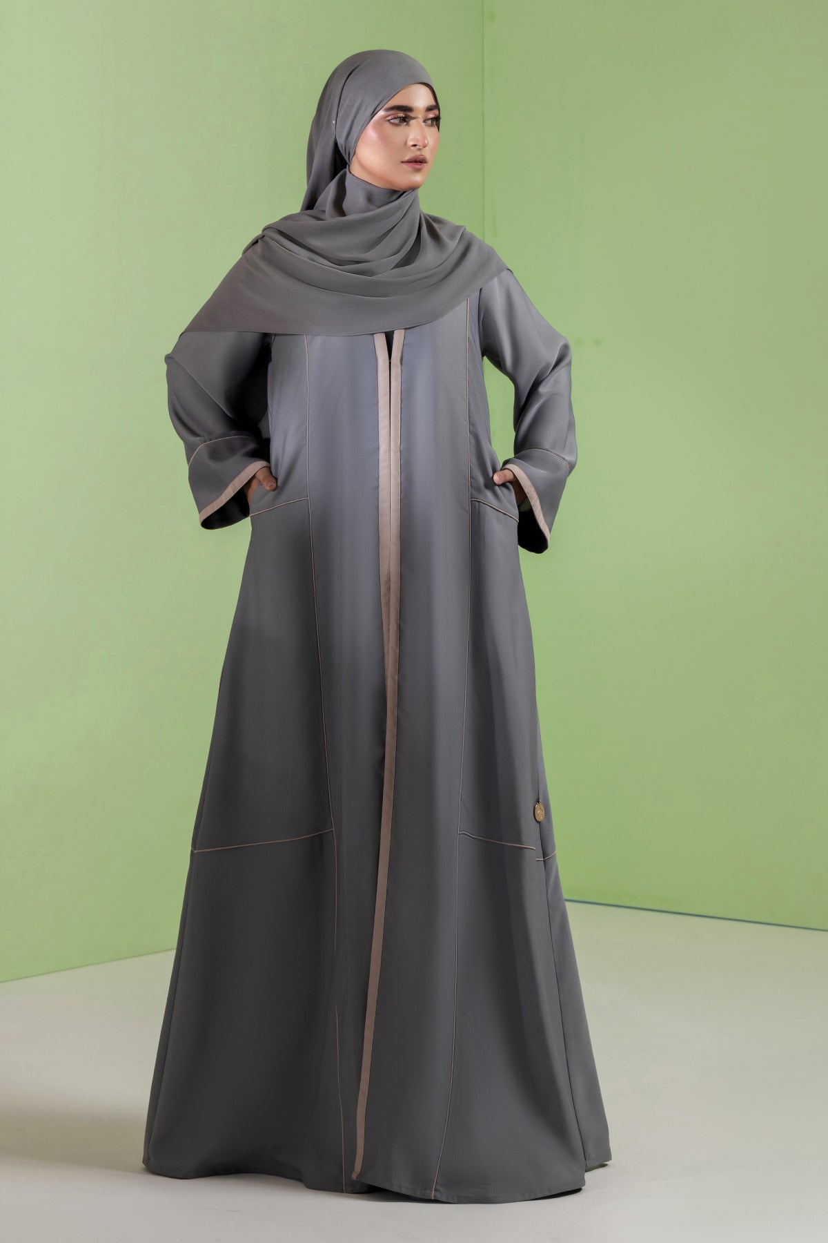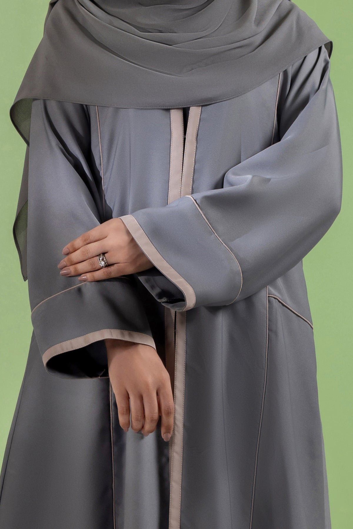 Crafted from premium Nida Fabric, this smoke green kimono features a full-length front open style with hook and eye closure. Accented with beige trims along the front, back, and sleeves, it offers a modern modest look.