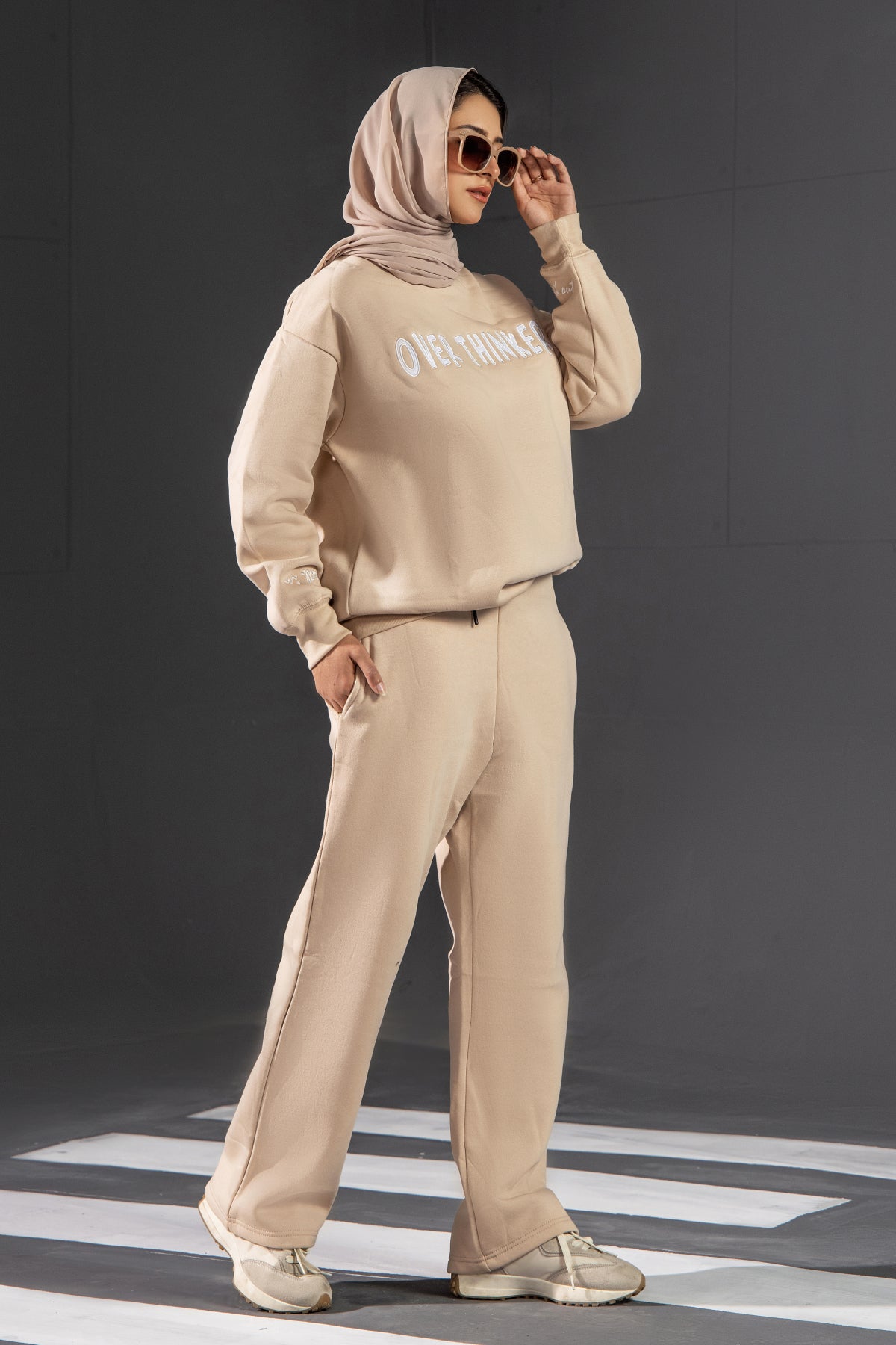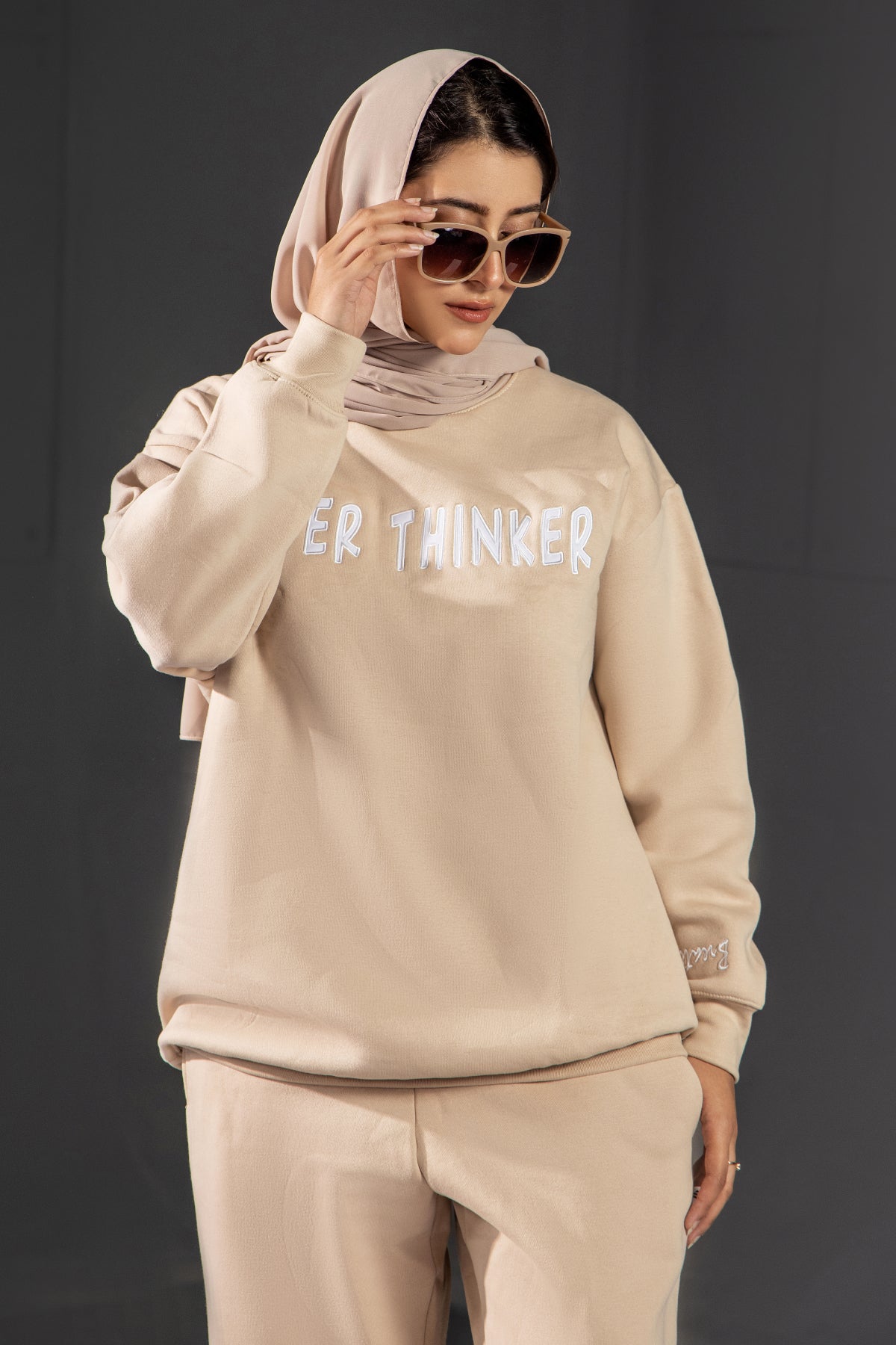 Cozy up in this warm beige LSF fleece crew neck sweatshirt. Relaxed fit with drop-shoulder sleeves, ribbed neckline, cuffs, and hem. White embroidery “Over Thinker” adds a minimal, playful streetwear touch for effortless everyday comfort.